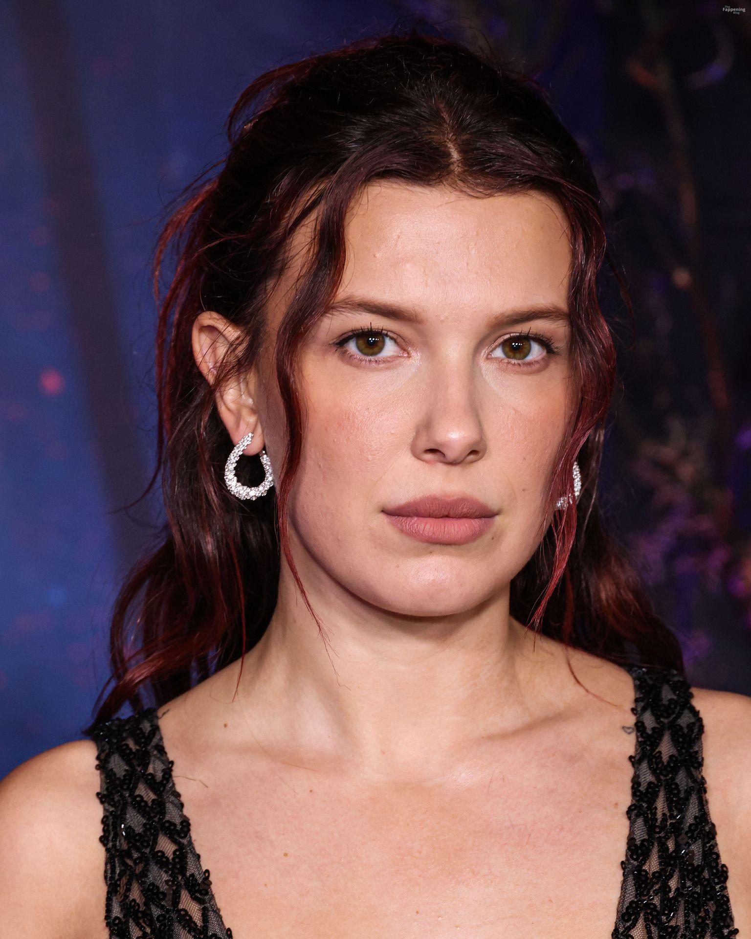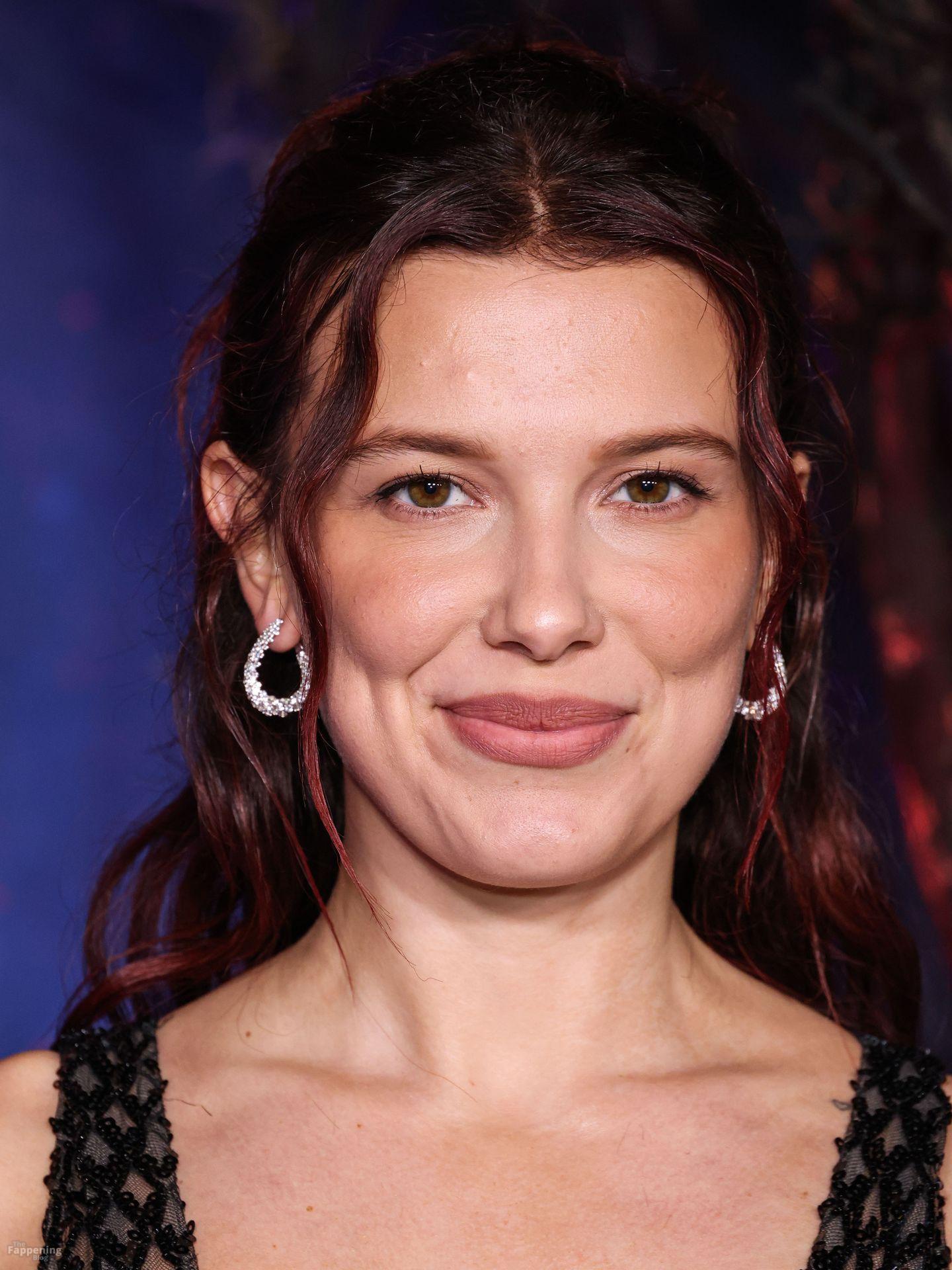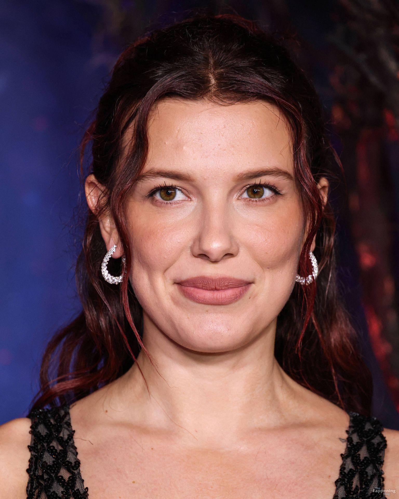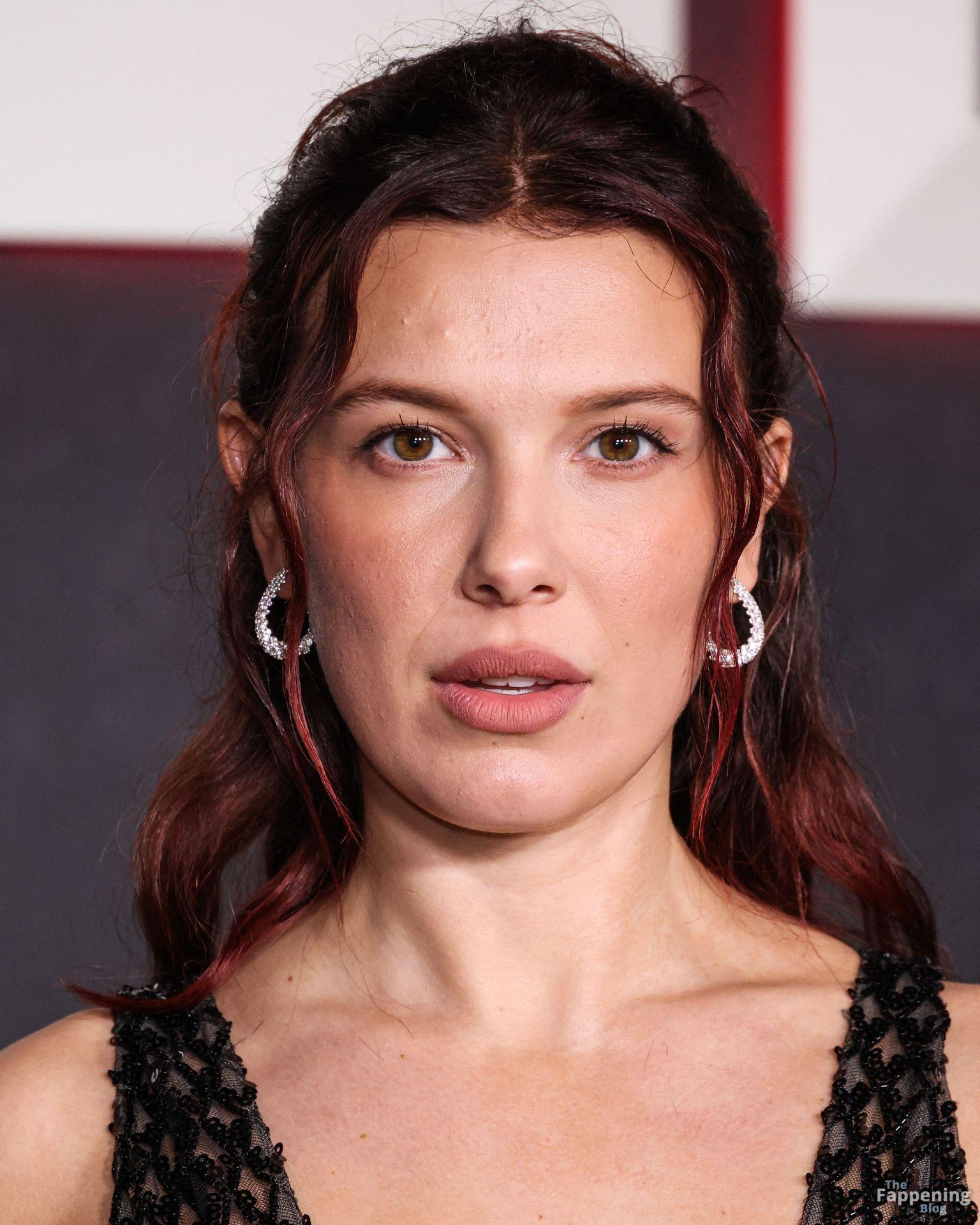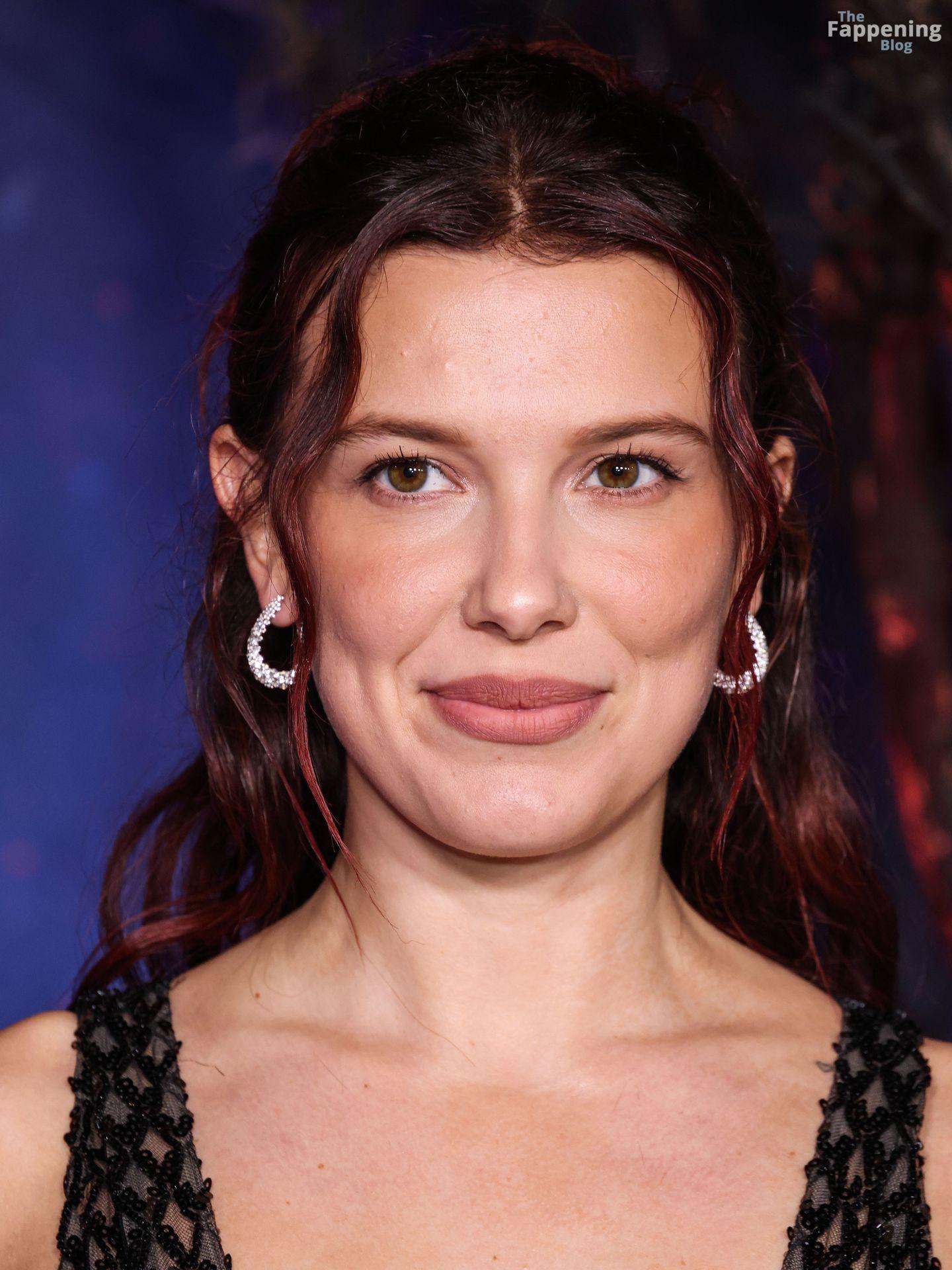 Millie Bobby Brown apareceu no Evento FYC da 5ª Temporada de Stranger Things em Hollywood, usando um vestido preto transparente de paetês com um decote profundo que deixava seus seios à mostra.