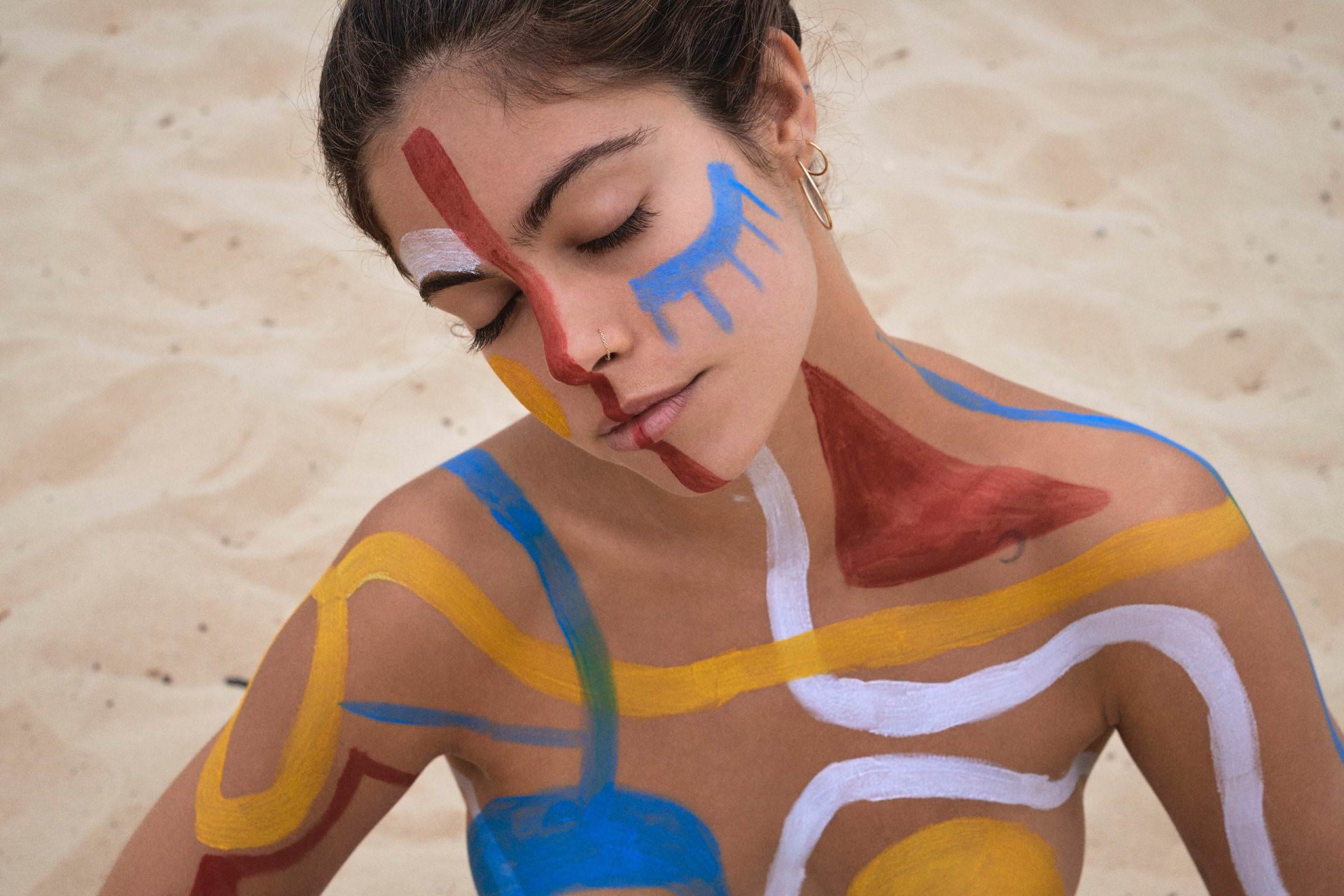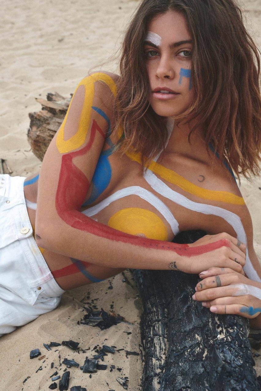 Mimi Elashiry mostrou seu corpo nu pintado em um ensaio fotográfico de Maria Dominika (2018). Mimi Elashiry é uma modelo de moda e blogueira australiana de 22 anos. Ela tem mais de 930 mil seguidores no Instagram. Mimi também tem um blog de fotos de sucesso em seu site.