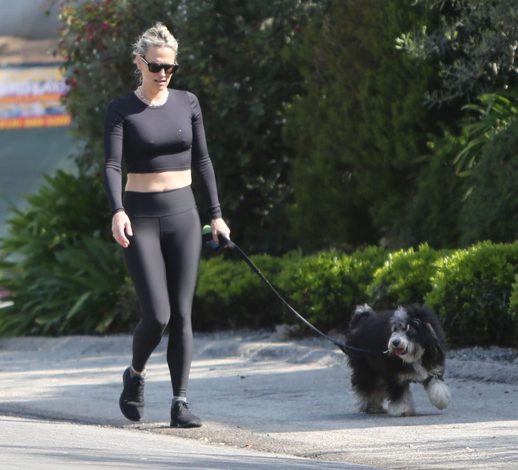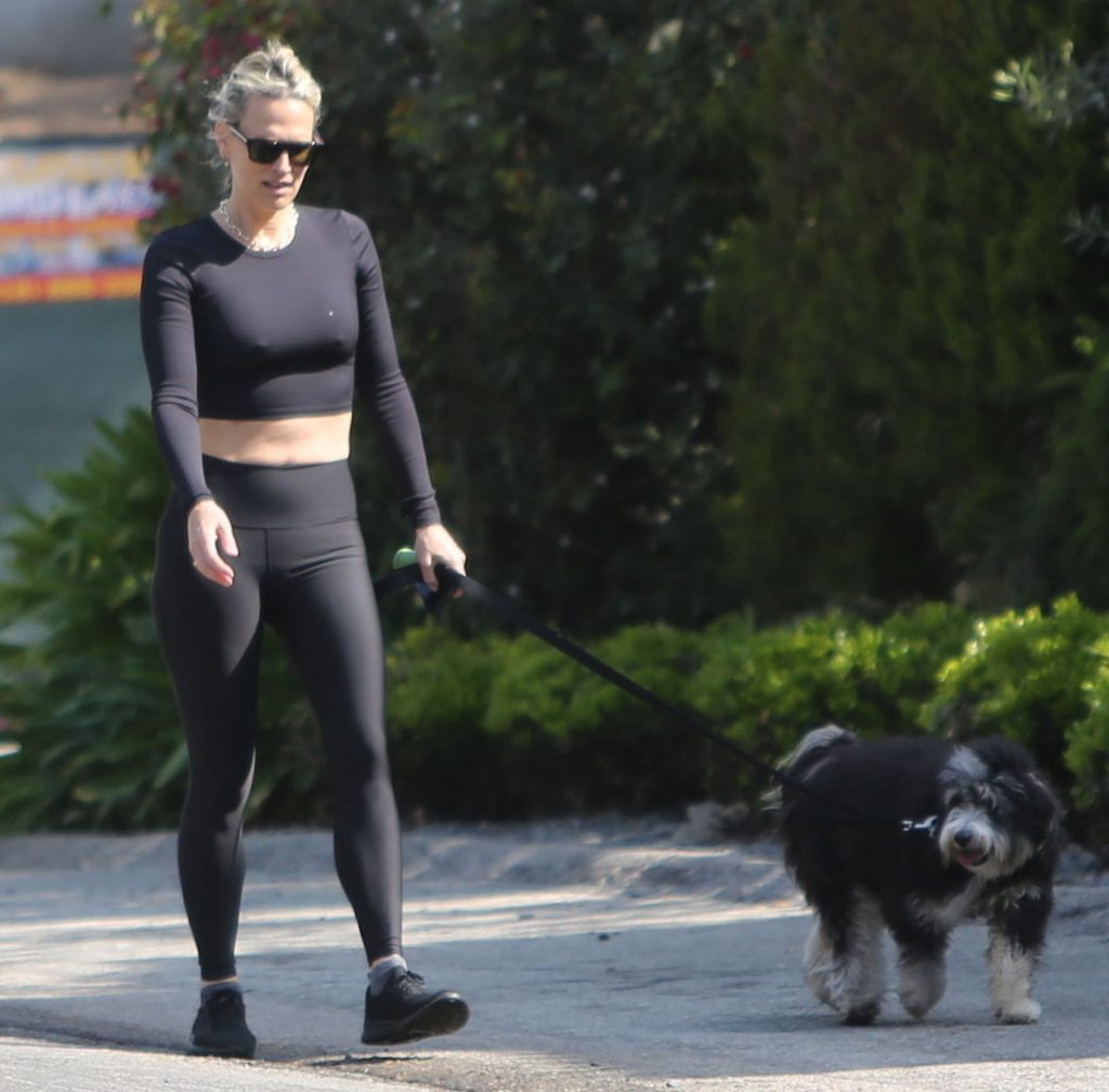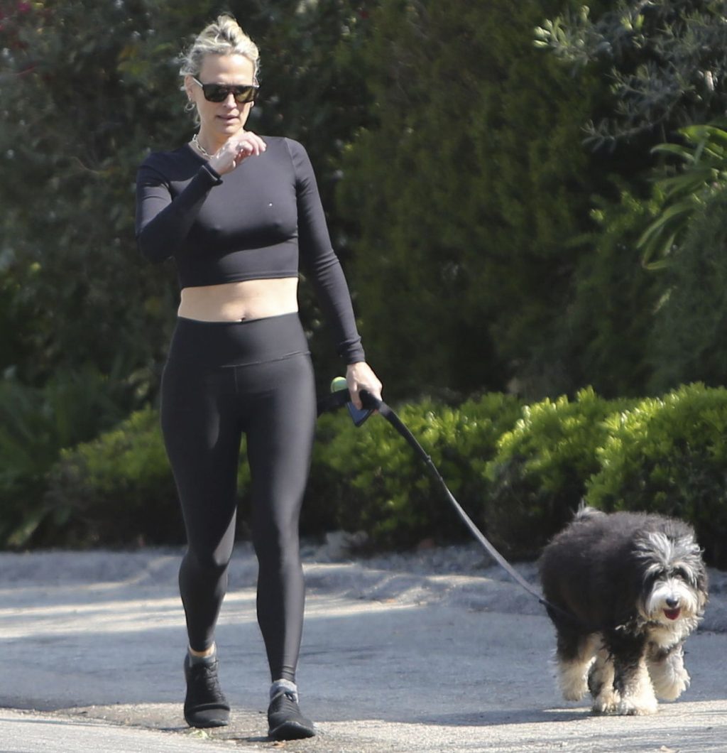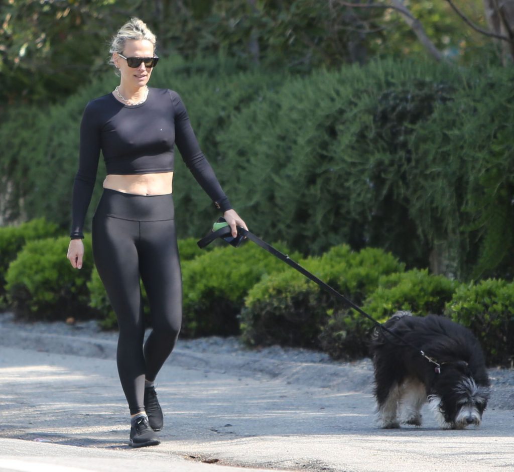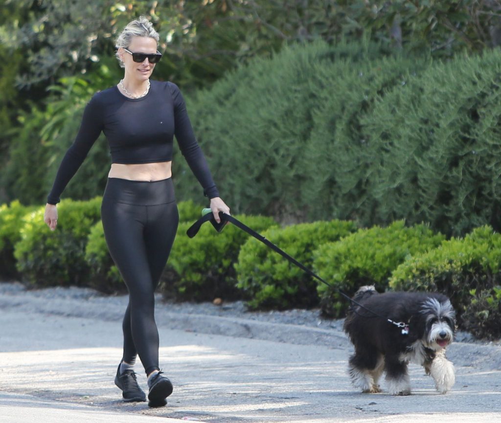 Model mãe Molly Sims parece impressionante caminhando com o cachorro em Los Angeles durante a ordem de ficar em casa do bloqueio do Coronavírus em 29 de março de 2020.