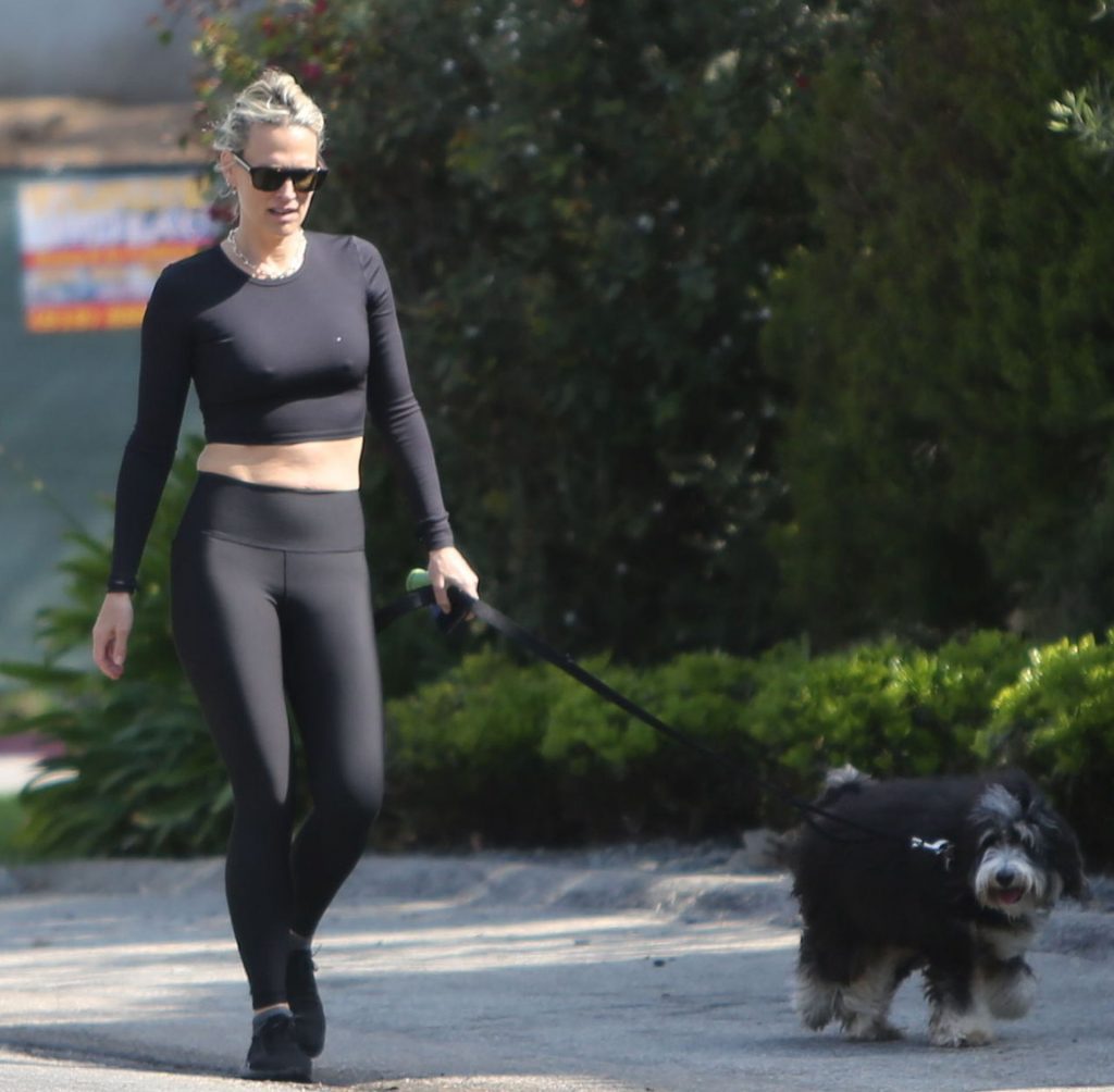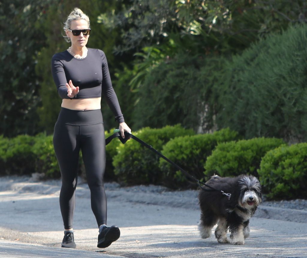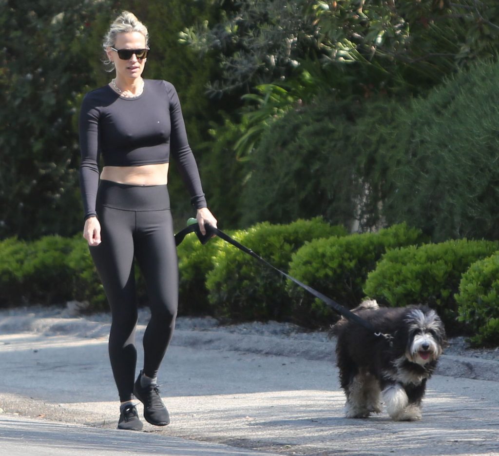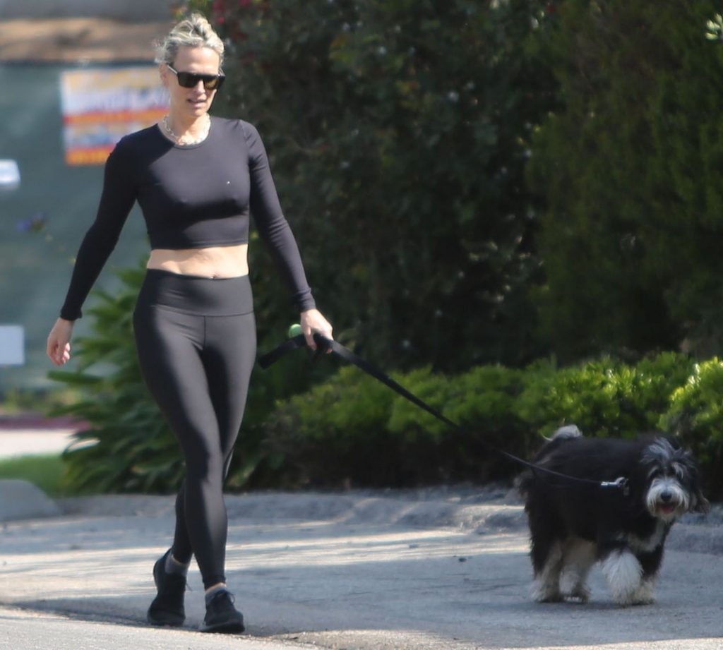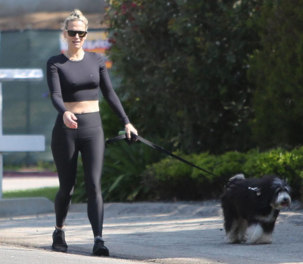 Model mãe Molly Sims parece impressionante caminhando com o cachorro em Los Angeles durante a ordem de ficar em casa do bloqueio do Coronavírus em 29 de março de 2020.