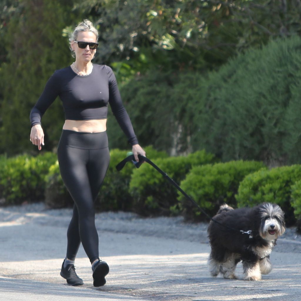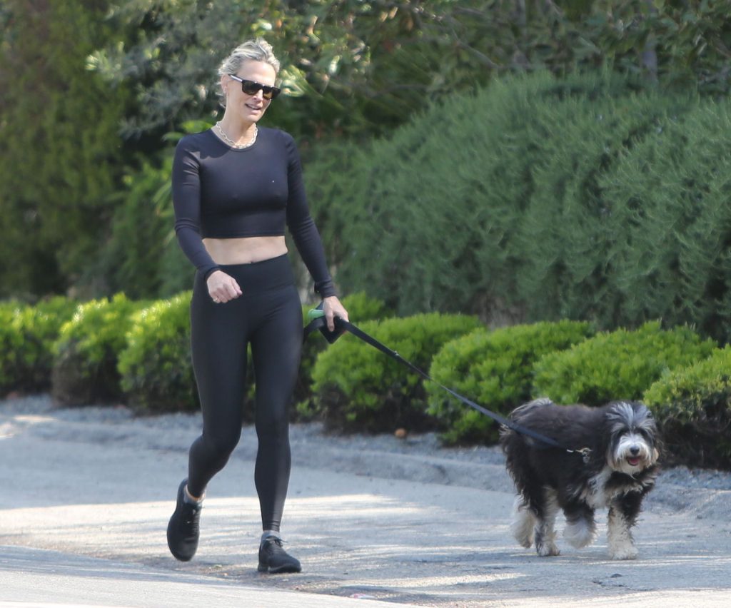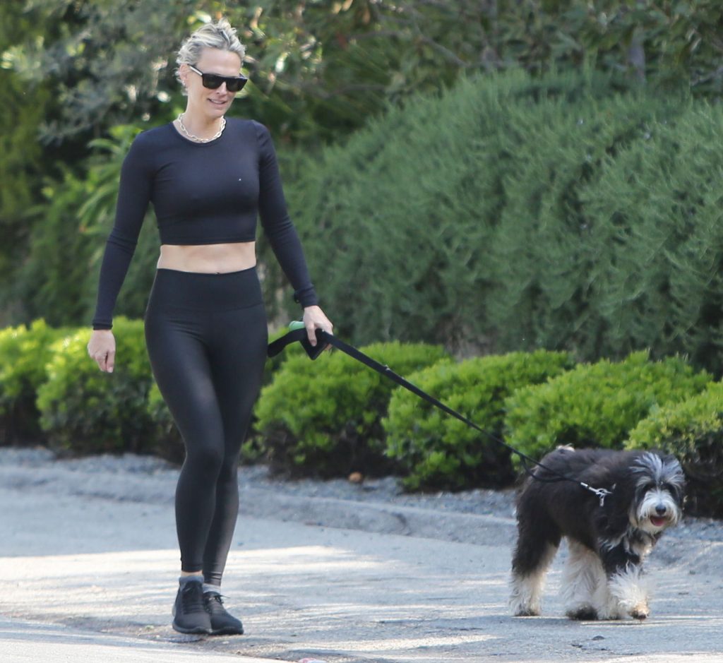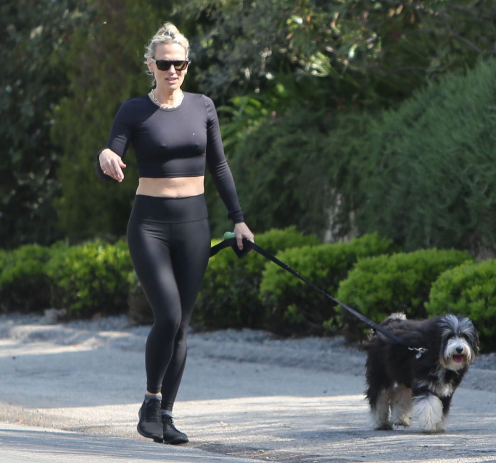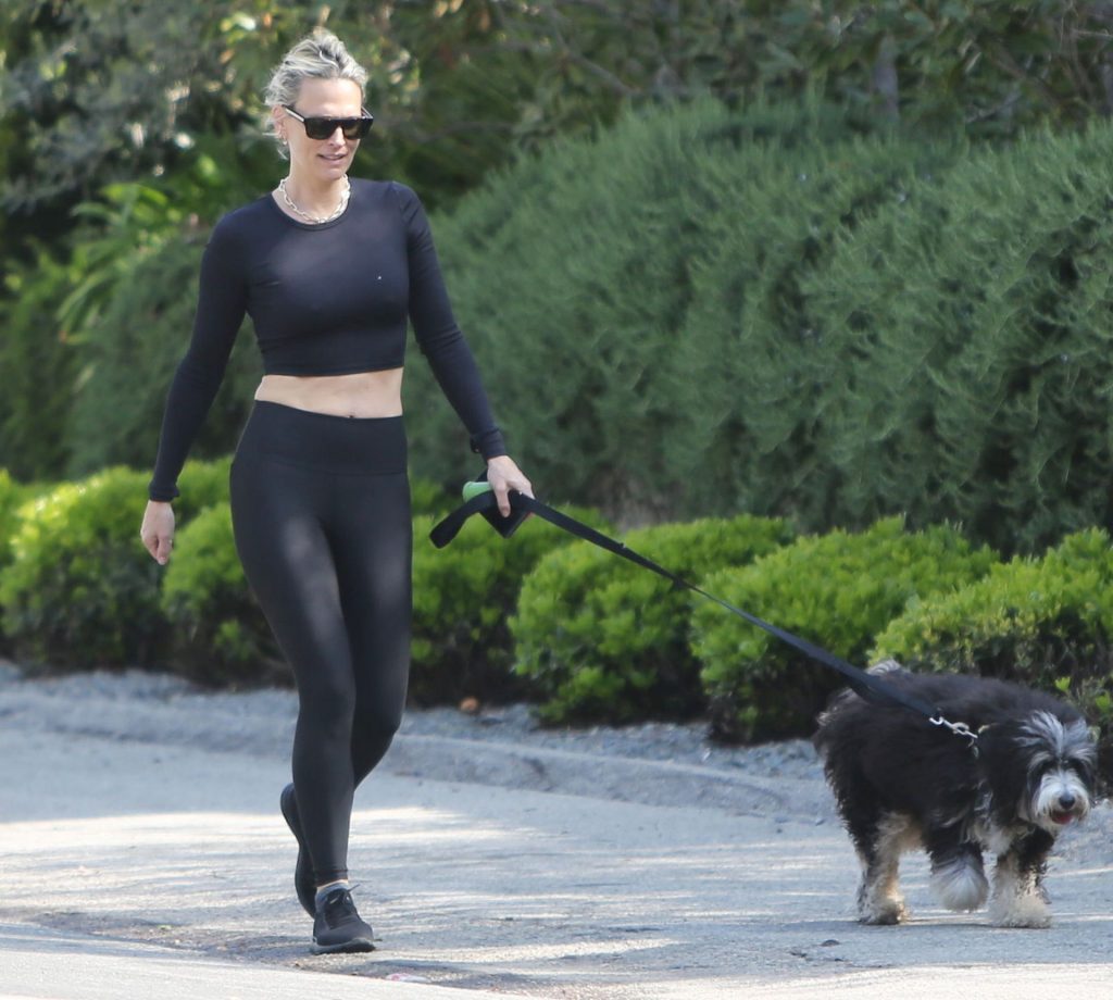 Model mãe Molly Sims parece impressionante caminhando com o cachorro em Los Angeles durante a ordem de ficar em casa do bloqueio do Coronavírus em 29 de março de 2020.