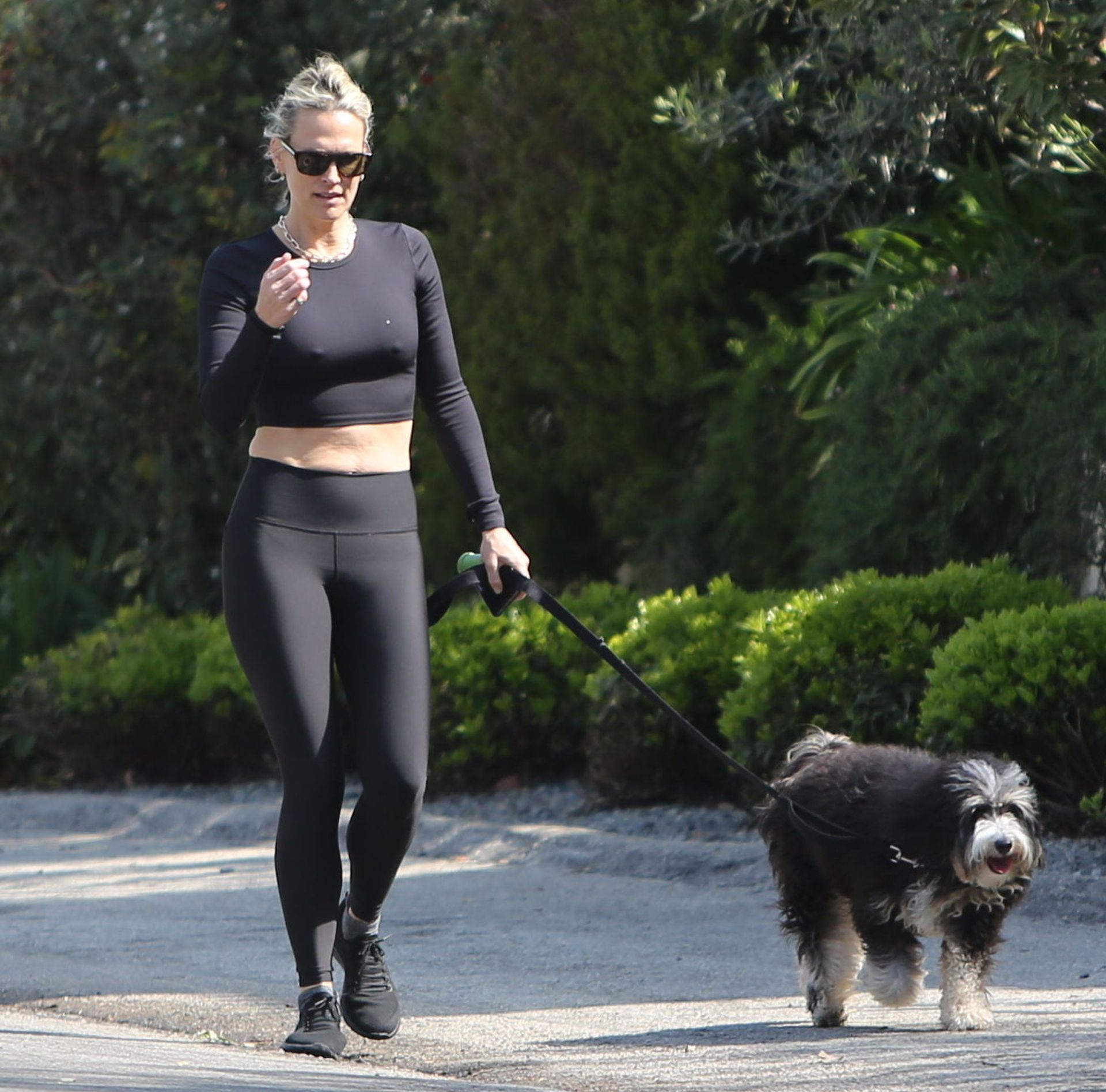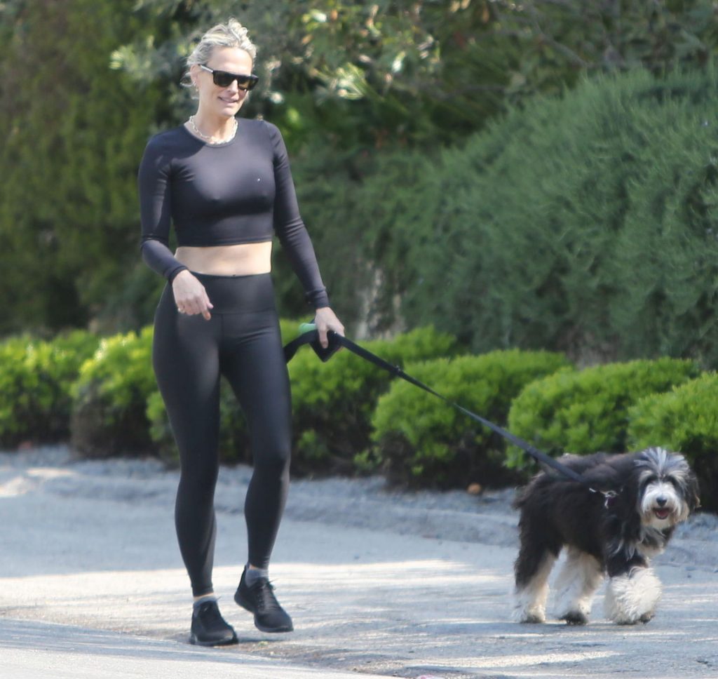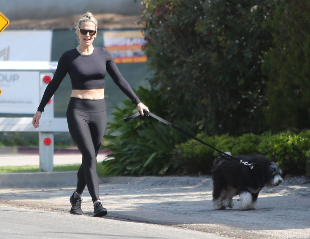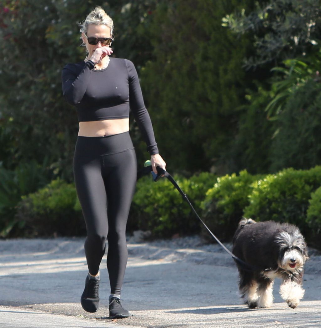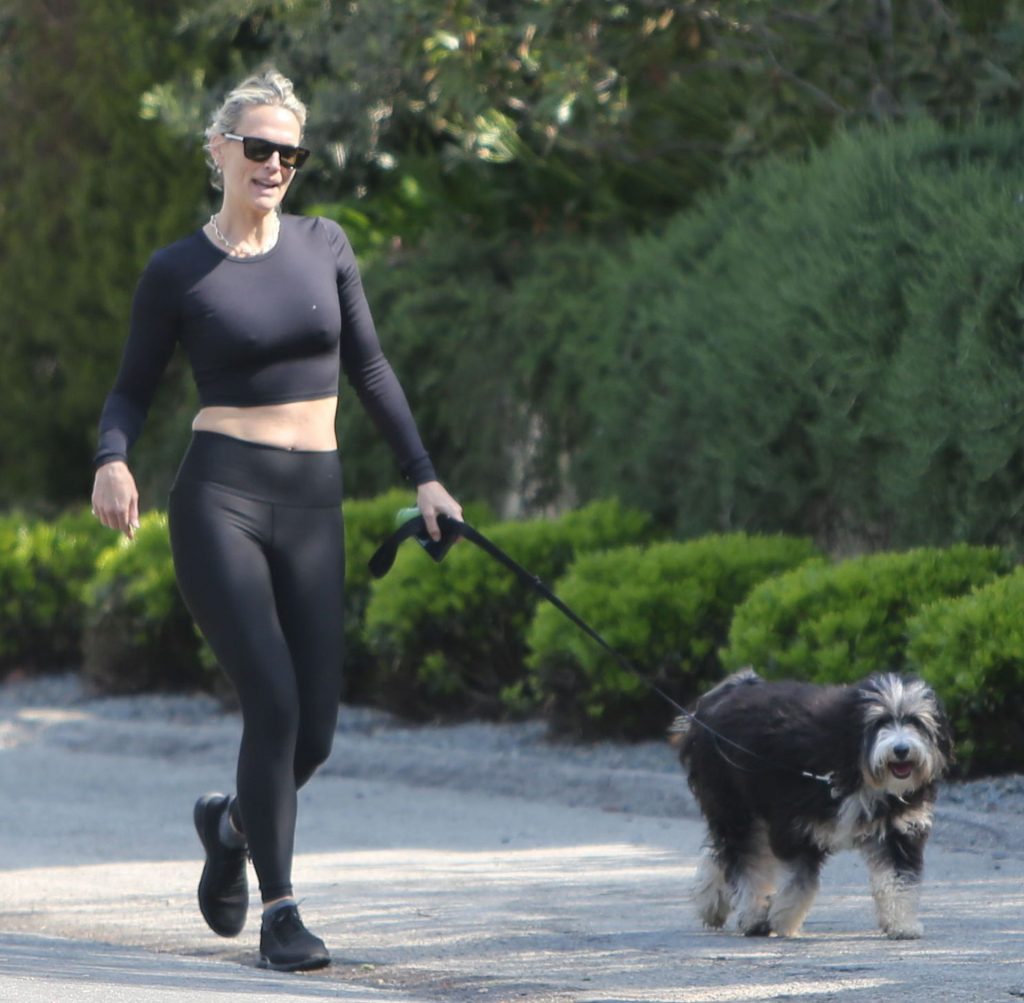 Model mãe Molly Sims parece impressionante caminhando com o cachorro em Los Angeles durante a ordem de ficar em casa do bloqueio do Coronavírus em 29 de março de 2020.