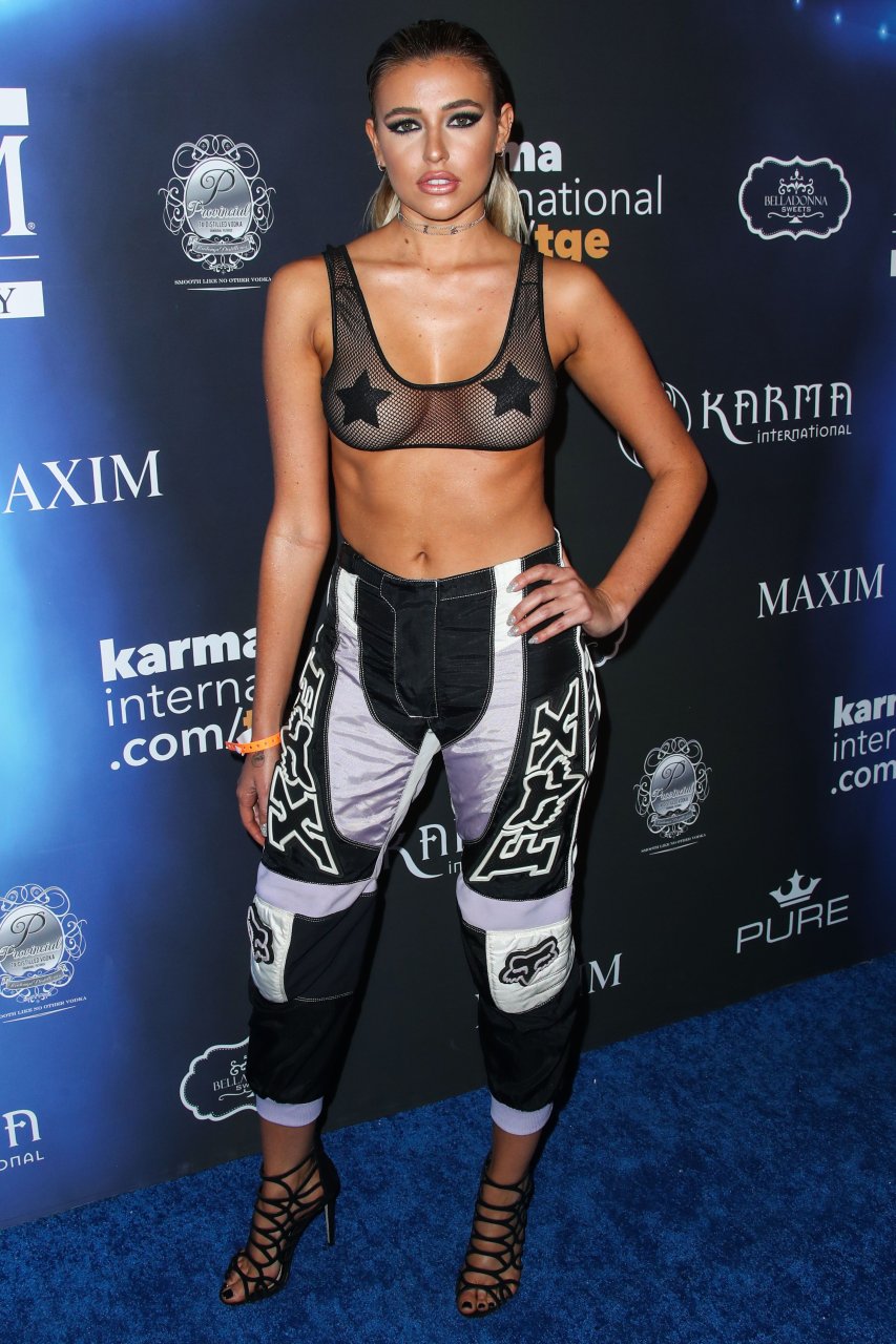 Monica Sims usa uma blusa transparente com pasties na Festa de Halloween Maxim 2017 em Los Angeles, 21/10/2017. Monica Sims é uma modelo americana, Playmate do Mês da Playboy (2015). Idade – 25.