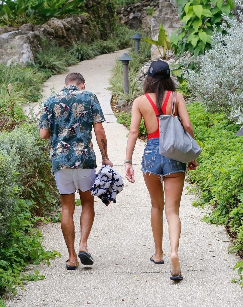 ‘Love Island’ estrela Montana Brown se divertiu na praia com amigos em Barbados, 01/06/2018. A estrela de reality show de 22 anos combinou um lindo maiô vermelho com shorts jeans cortados.