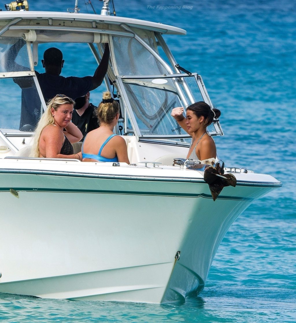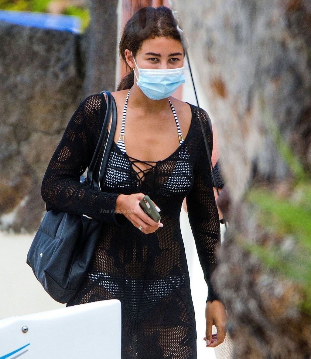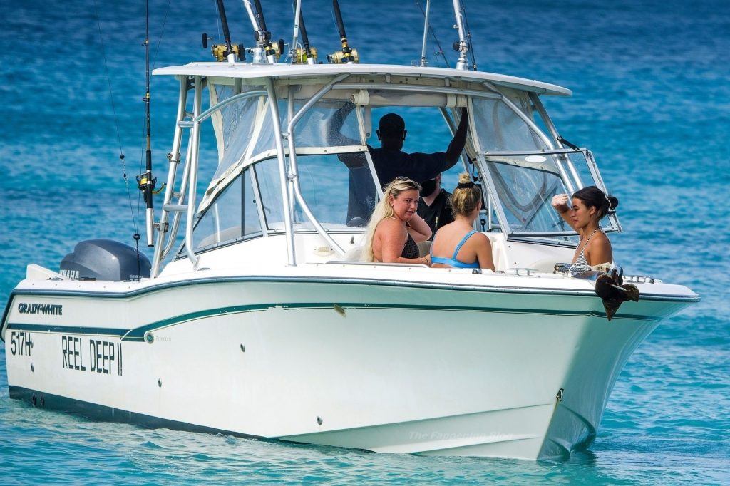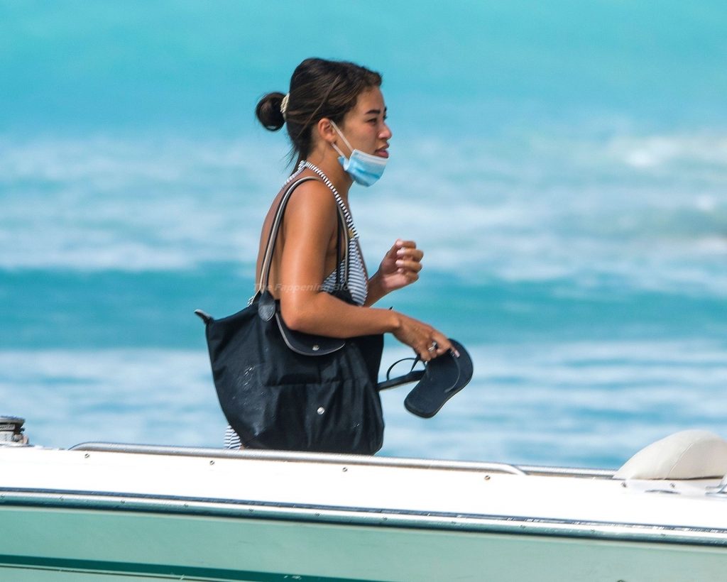 Love Island estrela Montana Brown veste seu biquíni listrado e estampado mostrando seu físico de praia, vista com amigos antes de uma viagem de pesca em alto mar de cinco horas em St. James Parish, Barbados, 01/11/2021.