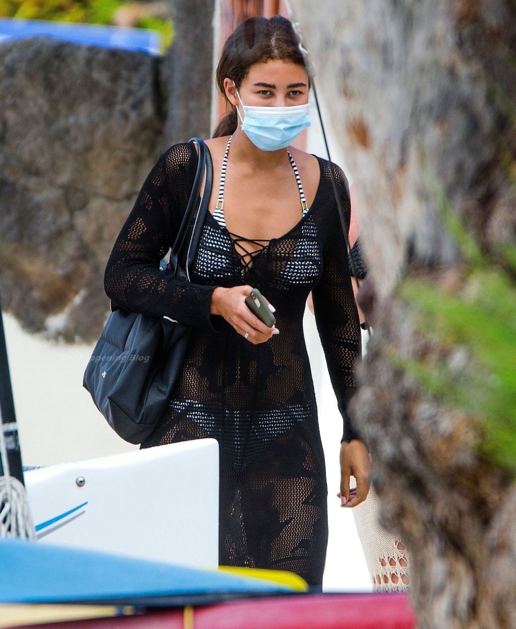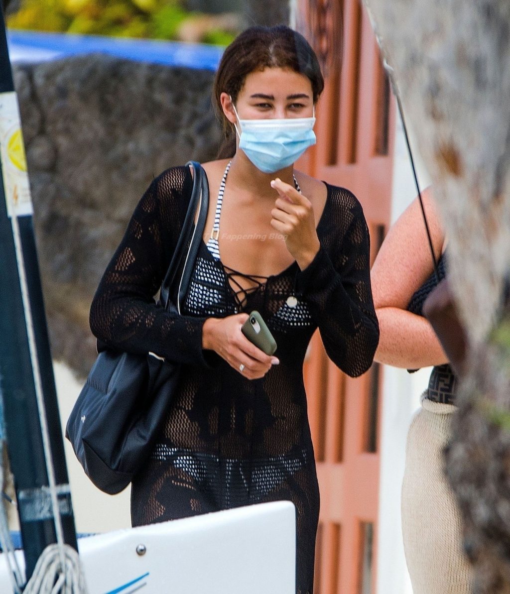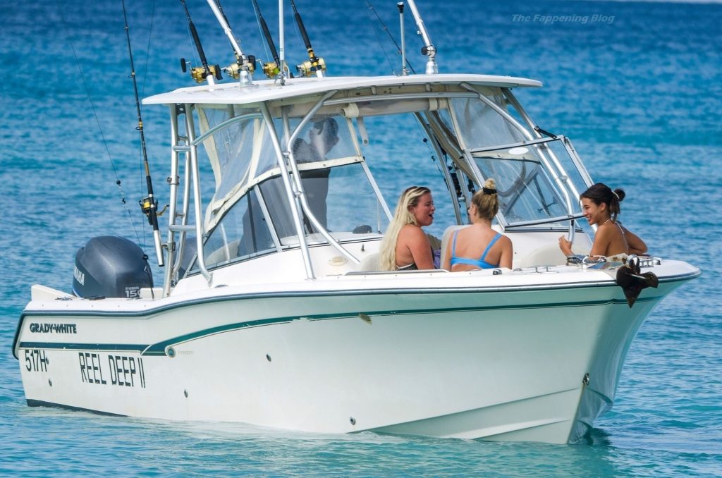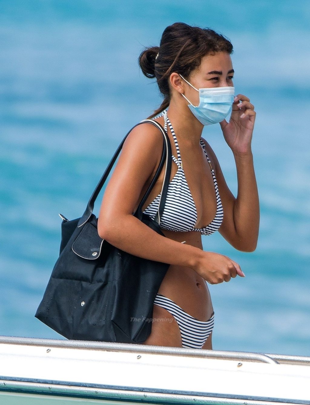 Love Island estrela Montana Brown veste seu biquíni listrado e estampado mostrando seu físico de praia, vista com amigos antes de uma viagem de pesca em alto mar de cinco horas em St. James Parish, Barbados, 01/11/2021.