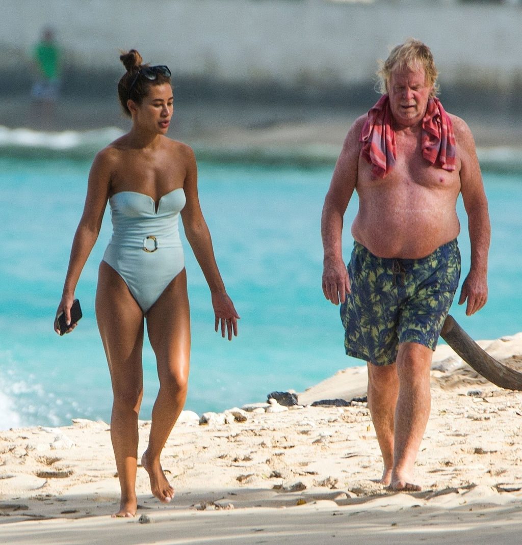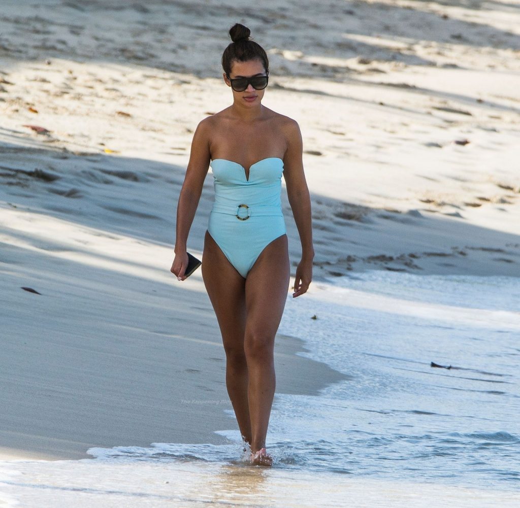 Vestindo seu pequeno maiô azul claro, a estrela sexy caminhou pela praia de areia dourada na Paróquia de St. Peter.