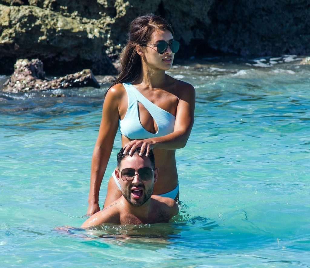 Mostrando sua figura sensual de corpo de praia, a estrela de Love Island Montana Brown usa um conjunto de biquíni azul claro de duas peças enquanto é vista na praia em St. James Parish durante suas férias de inverno em Barbados, 31/12/2020.