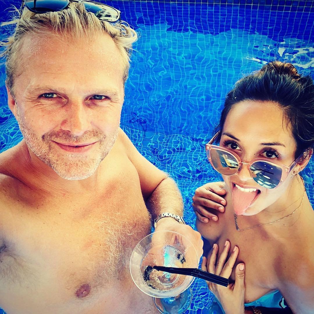 Myleene Klass compartilhou algumas fotos sexy e topless (cobertas) no Instagram (outubro de 2018). A superestrela de 40 anos se divertiu muito na piscina!