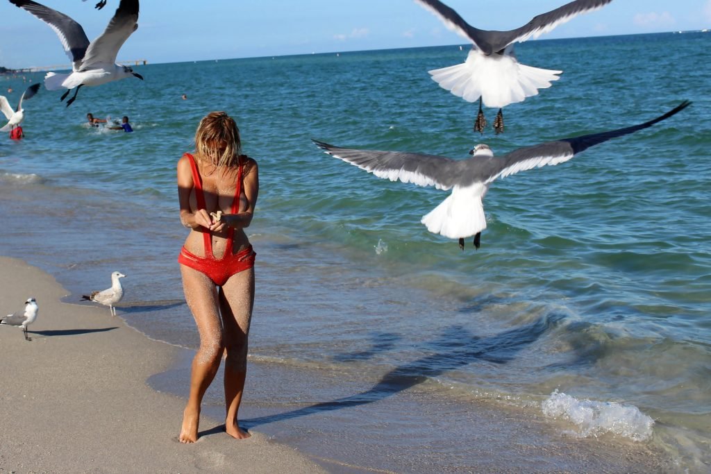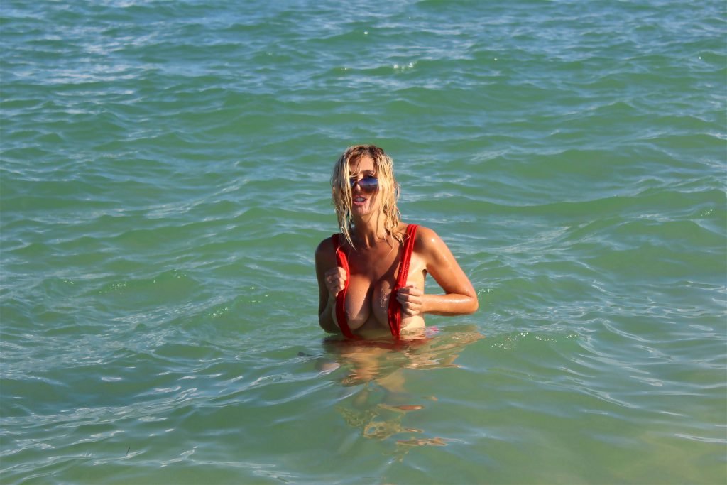 A cantora pop russa e ativista Nadeea Volianova é vista em um biquíni vermelho ousado na praia de Cannes, 14/05/2018. A loira de 31 anos e busto farto exibiu seus grandes seios para um fotógrafo.