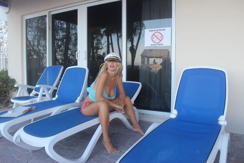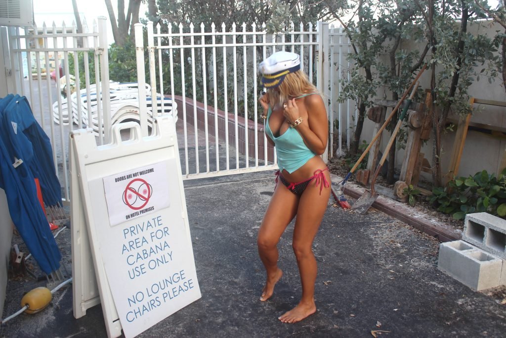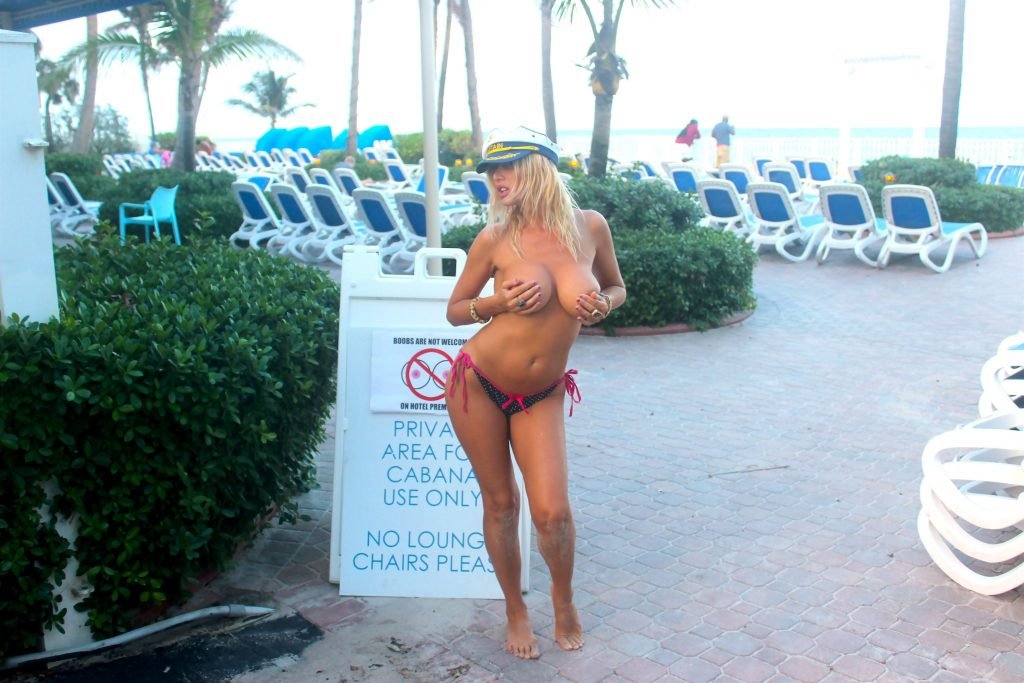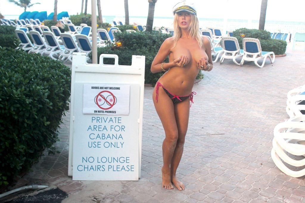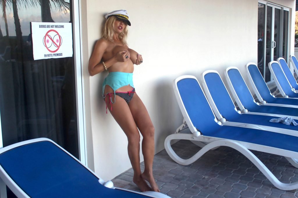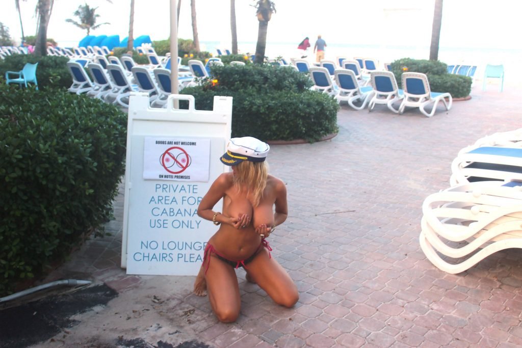A cantora pop russa Nadeea Volianova posa com uma placa falsa “Proibido Sem Seios” no hotel em Miami, 24/10/2017, onde foi confrontada em vídeo pela equipe, que pediu para ela fazer o check-out e ficar em outro lugar porque não estava usando sutiã sob a camisa.