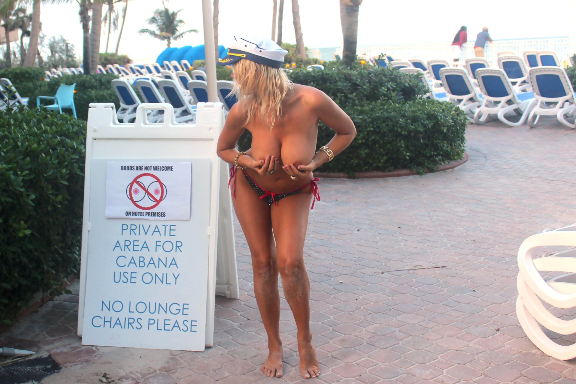 A cantora pop russa Nadeea Volianova posa com uma placa falsa “Proibido Sem Seios” no hotel em Miami, 24/10/2017, onde foi confrontada em vídeo pela equipe, que pediu para ela fazer o check-out e ficar em outro lugar porque não estava usando sutiã sob a camisa.