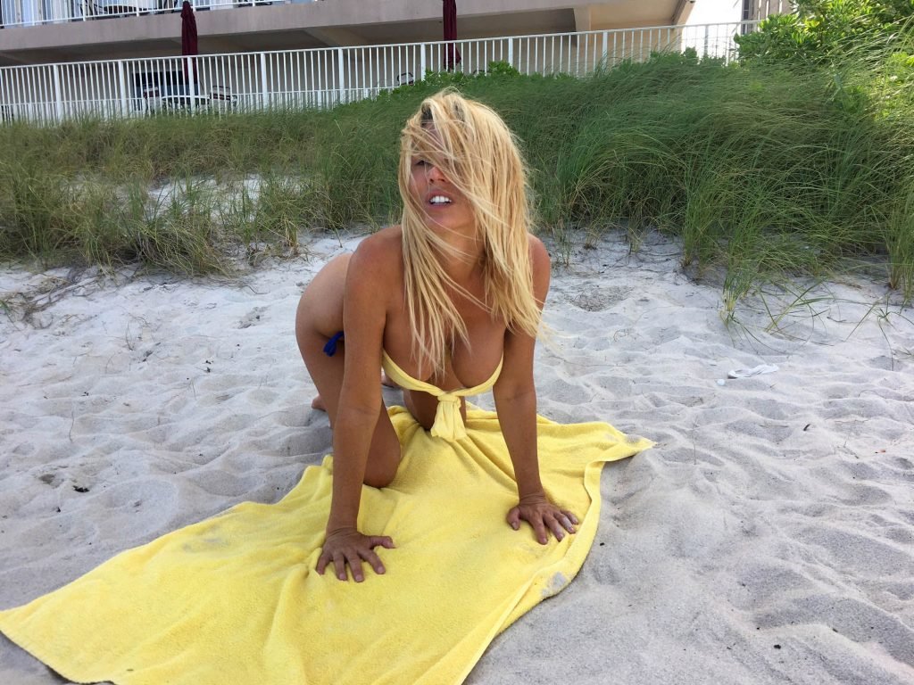 Cantora russa voluptuosa Nadeea Volianova faz um ensaio fotográfico escandaloso na Praia de Miami, 15/08/2017.