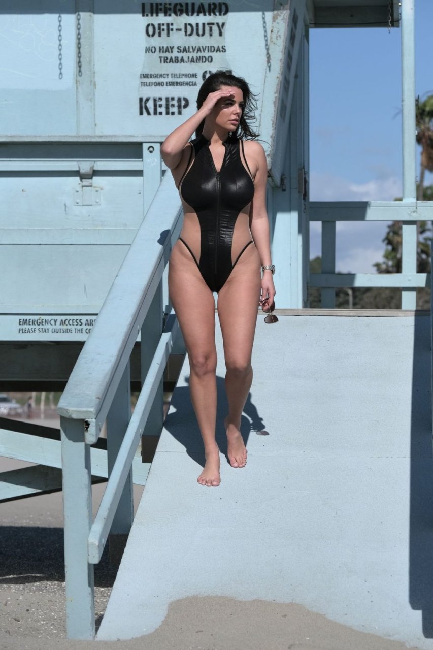 A modelo Nadine Mirada, estrela da nova coleção Primavera da Guess, exibe sua silhueta curvilínea em um maiô com zíper frontal na Praia de Santa Monica, 09/03/2019.