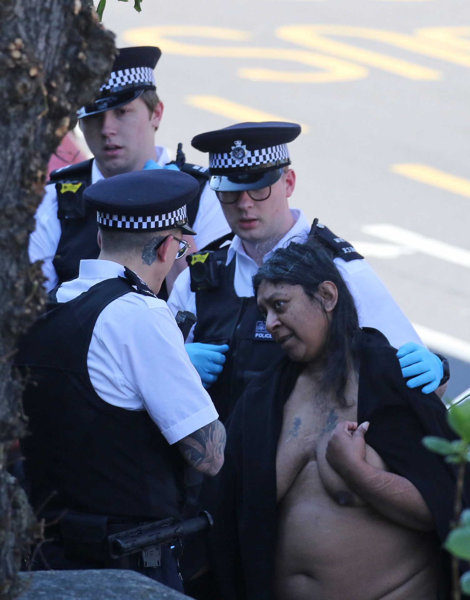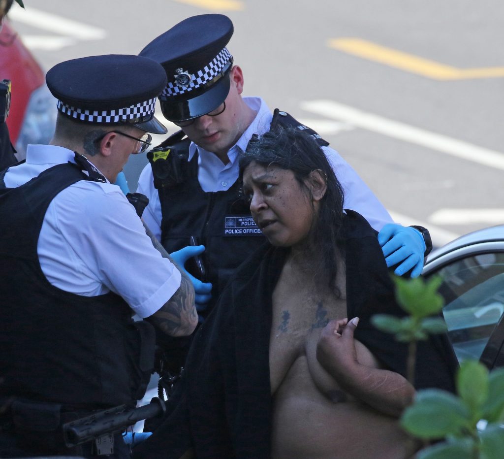 A polícia metropolitana detém uma mulher nua fora do 156 Portway, Stratford, em meio à pandemia global do coronavírus COVID-19 em Londres, Reino Unido, 26/03/2020.