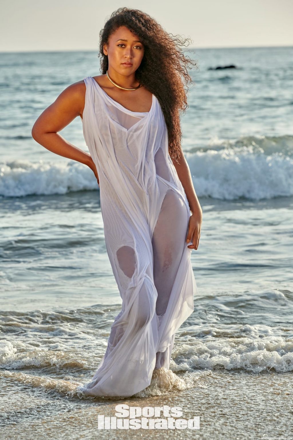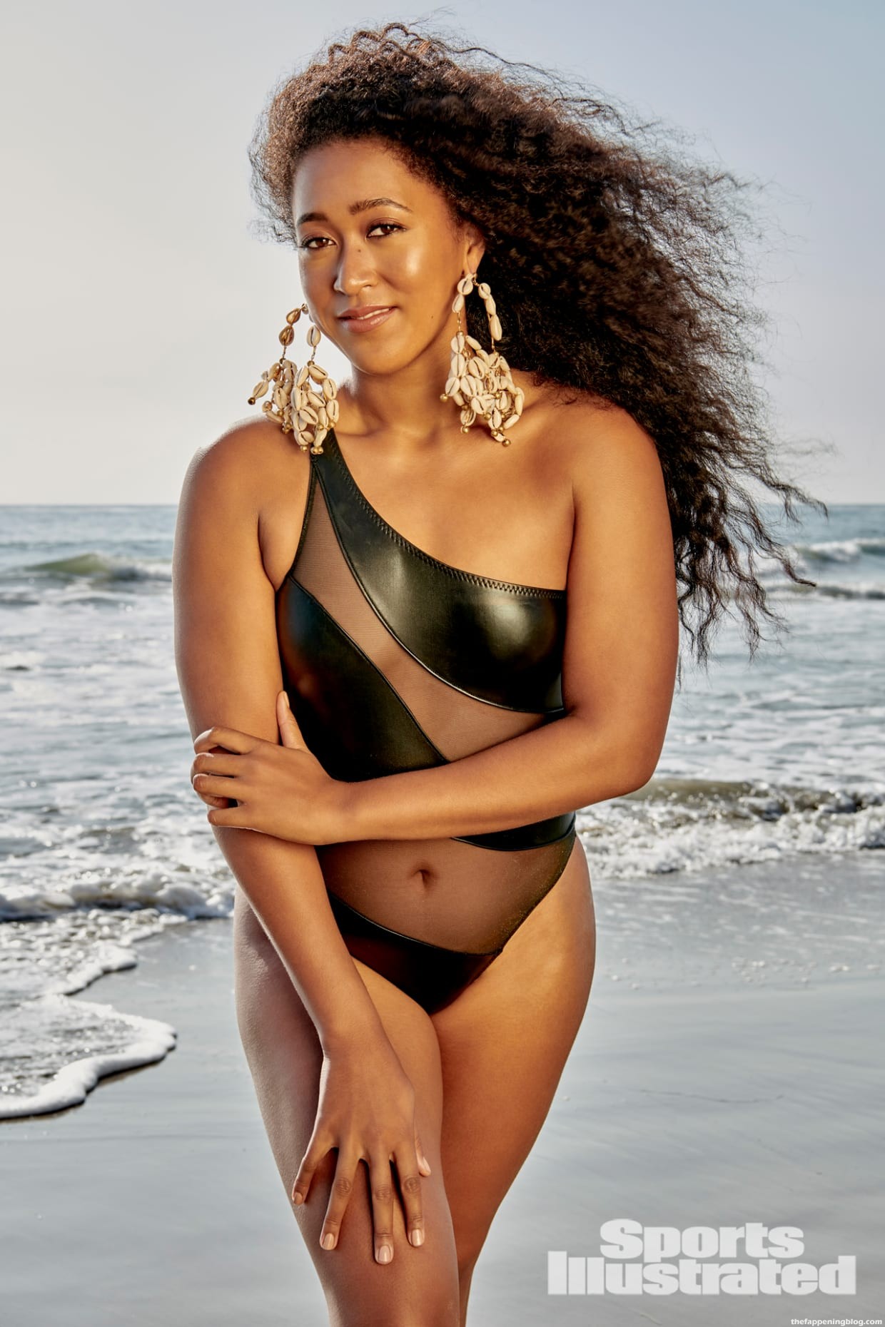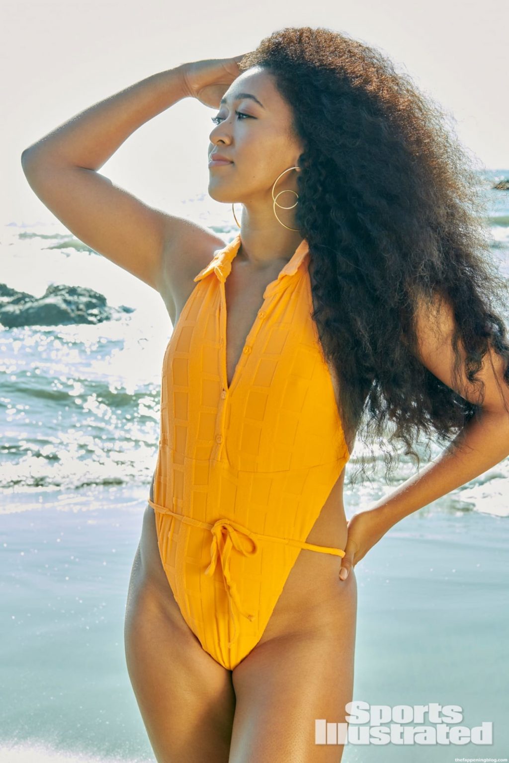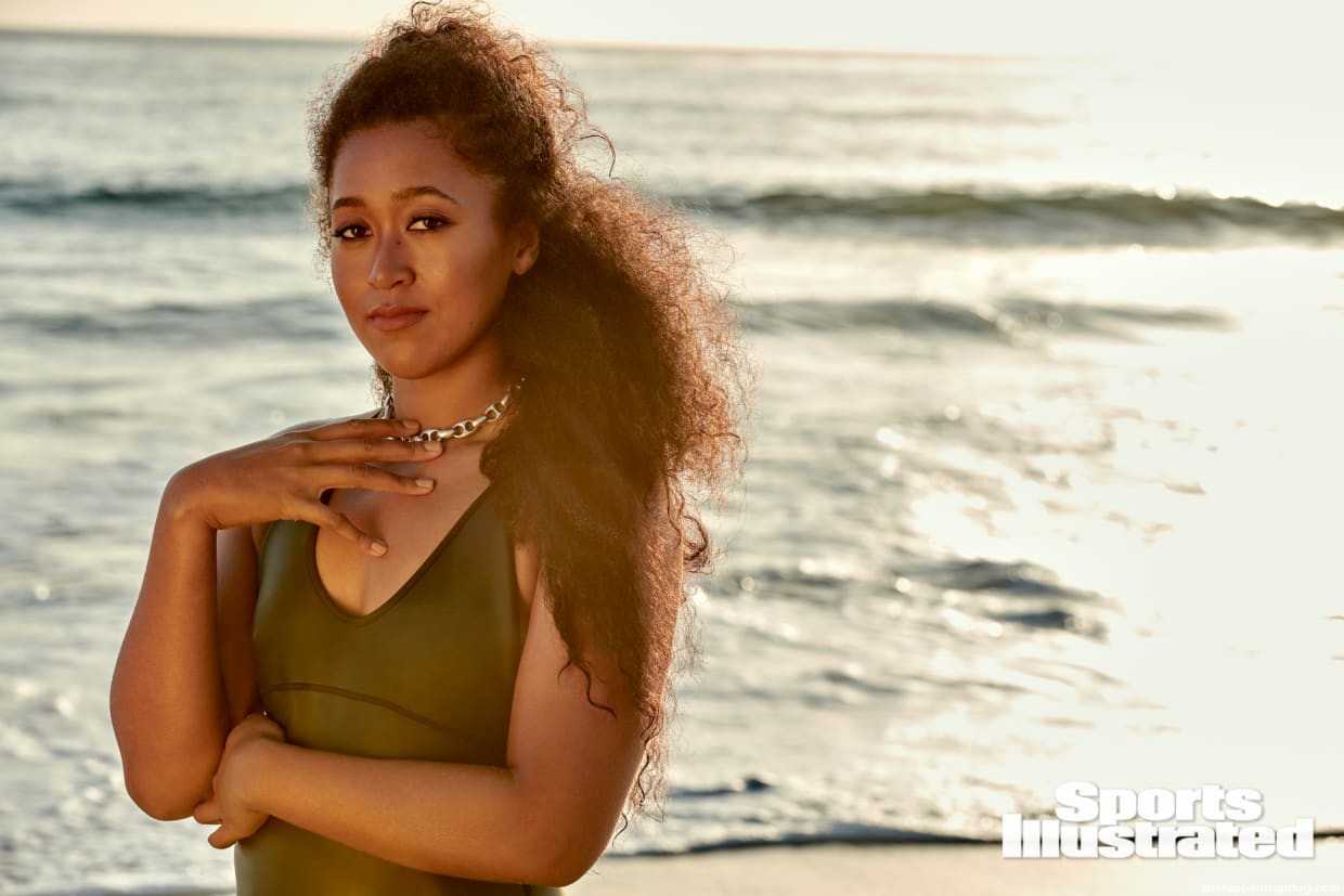 A esportista sem seios Naomi Osaka posa com maiôs da coleção Frankies Bikinis na praia de Malibu em um ensaio fotográfico de Yu Tsai para a edição Sports Illustrated Swimsuit 2021.