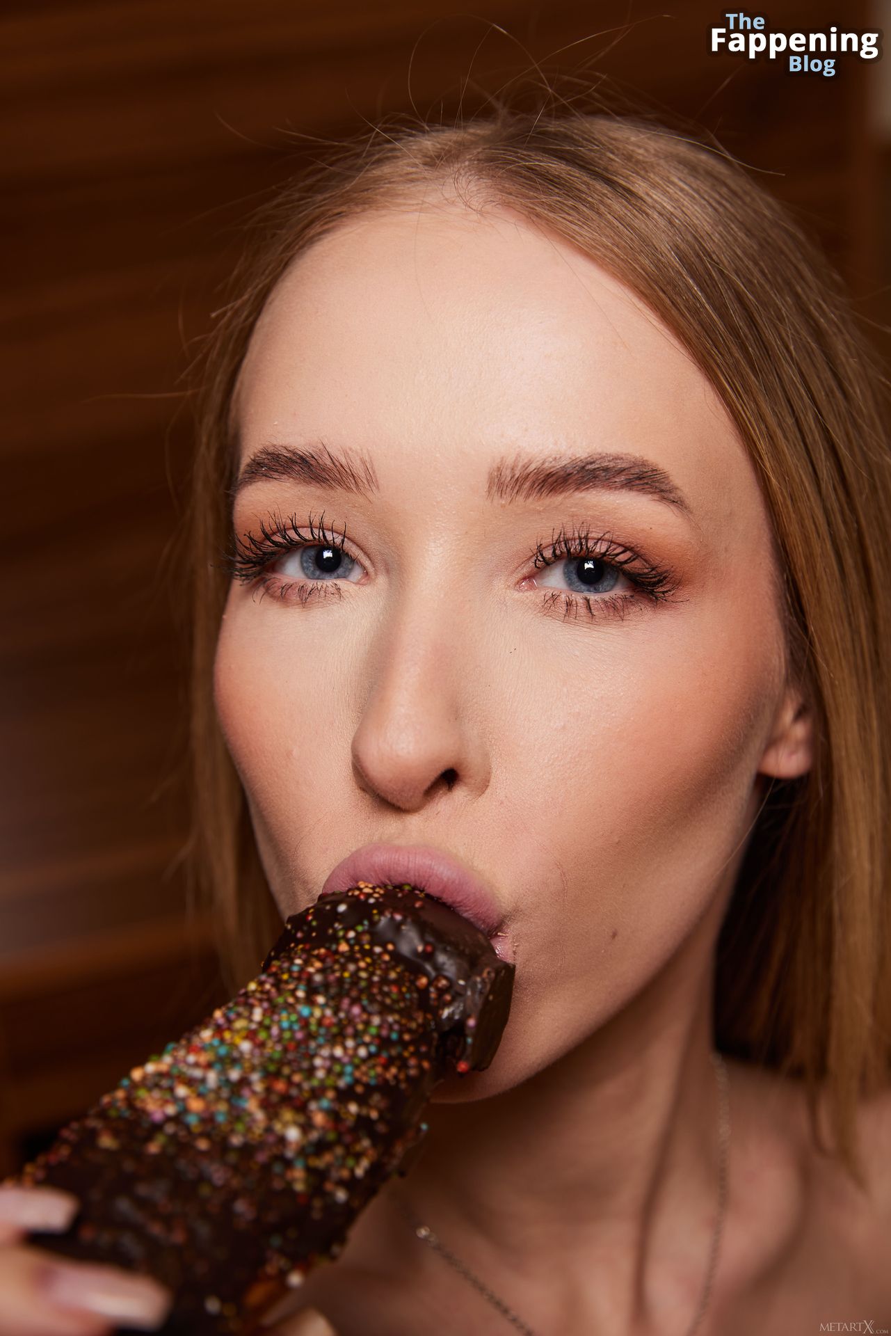Nestas fotos recentes, essa loira magra e bronzeada tira a calcinha de forma provocante, mostrando tudo para a câmera com uma pose ousada. Em seguida, ela brinca lambendo um enorme bolo em formato de pênis. Com 1,60m de altura, ela continua super esguia usando saltos altíssimos durante todo o ensaio.