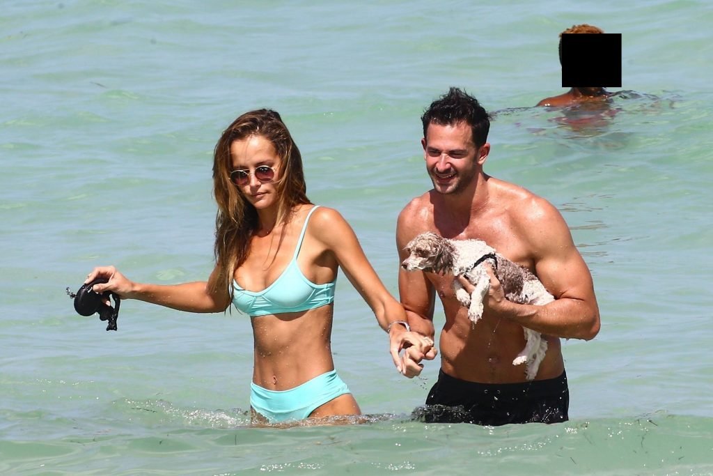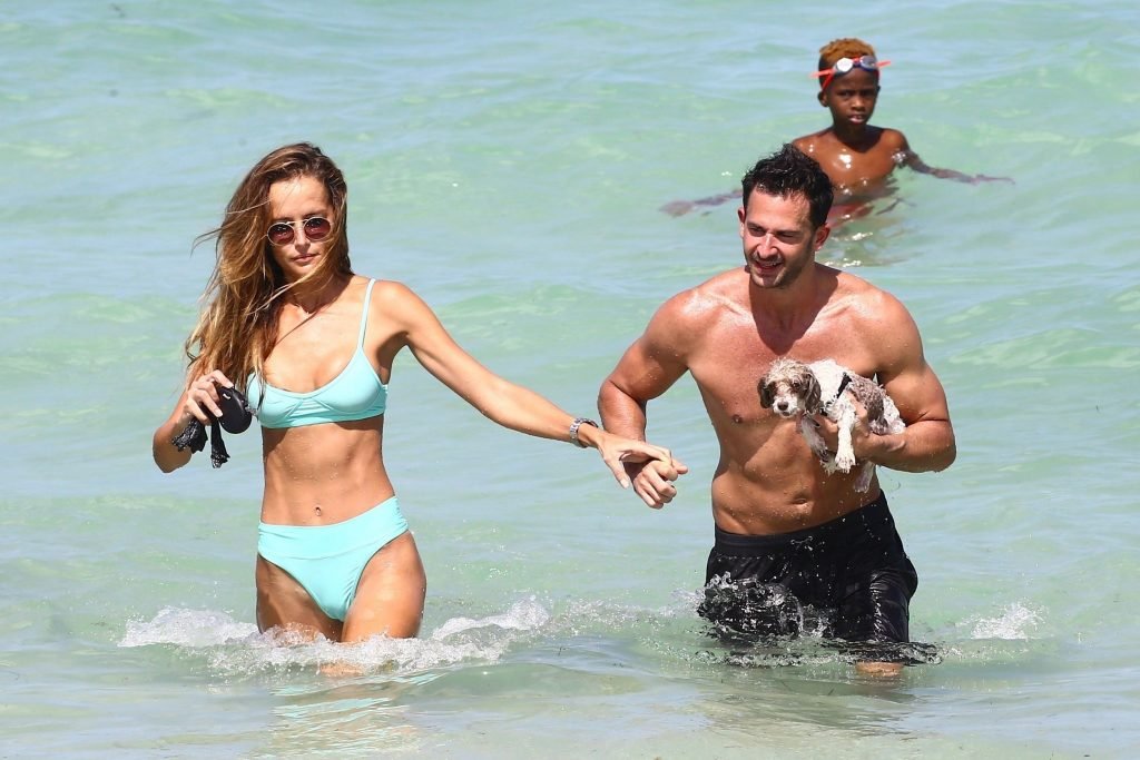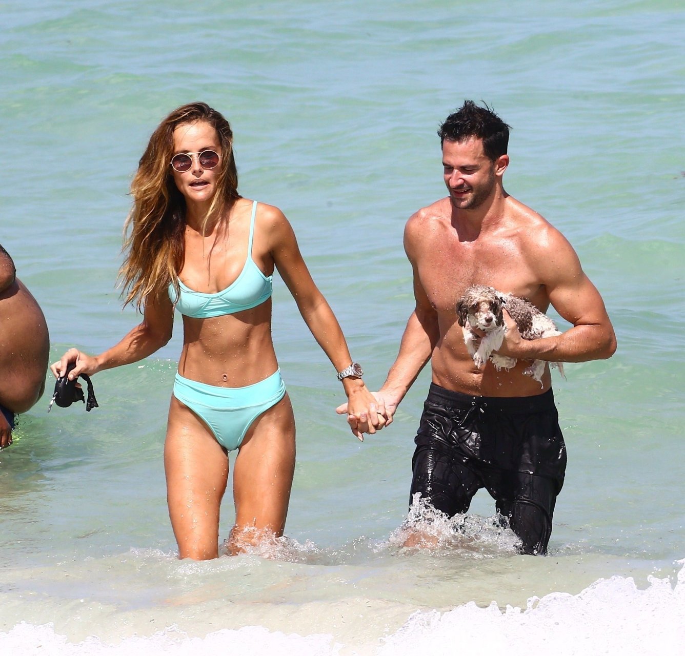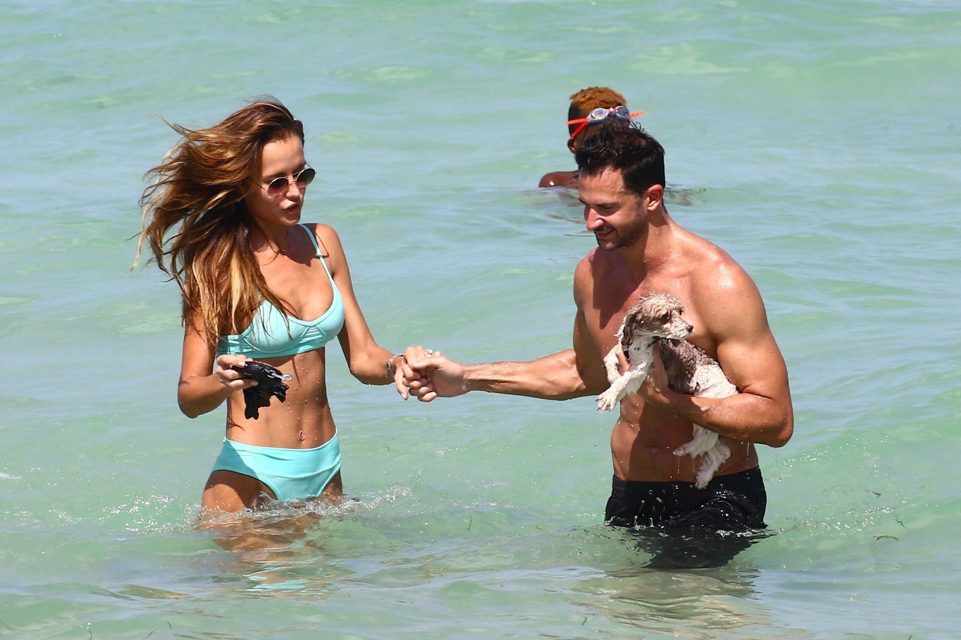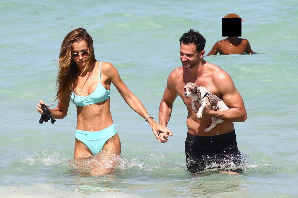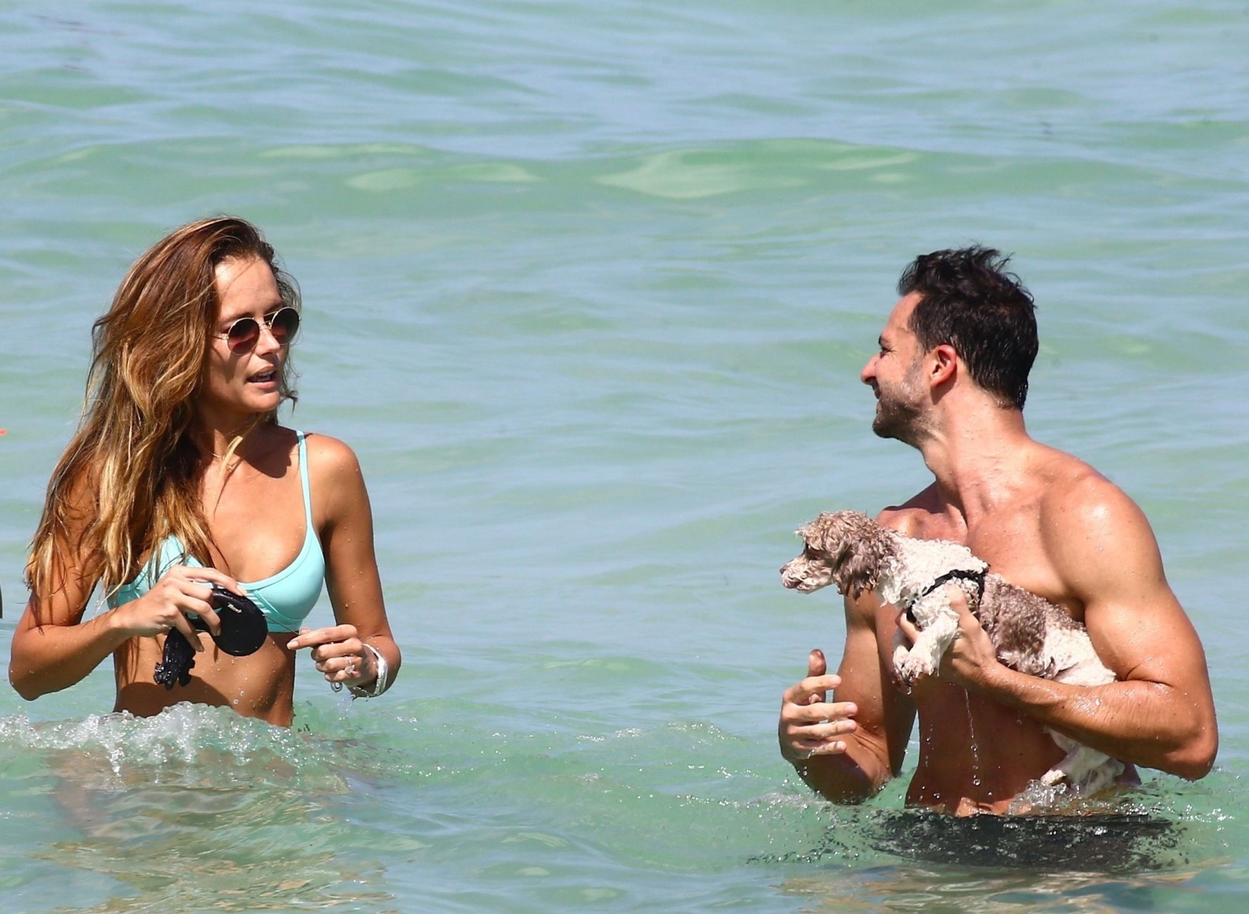 A modelo de 31 anos Natalia Borges e o marido Michael Satsky levam seu cachorro para a água para se refrescar do calor em Miami Beach, 05/08/2017.