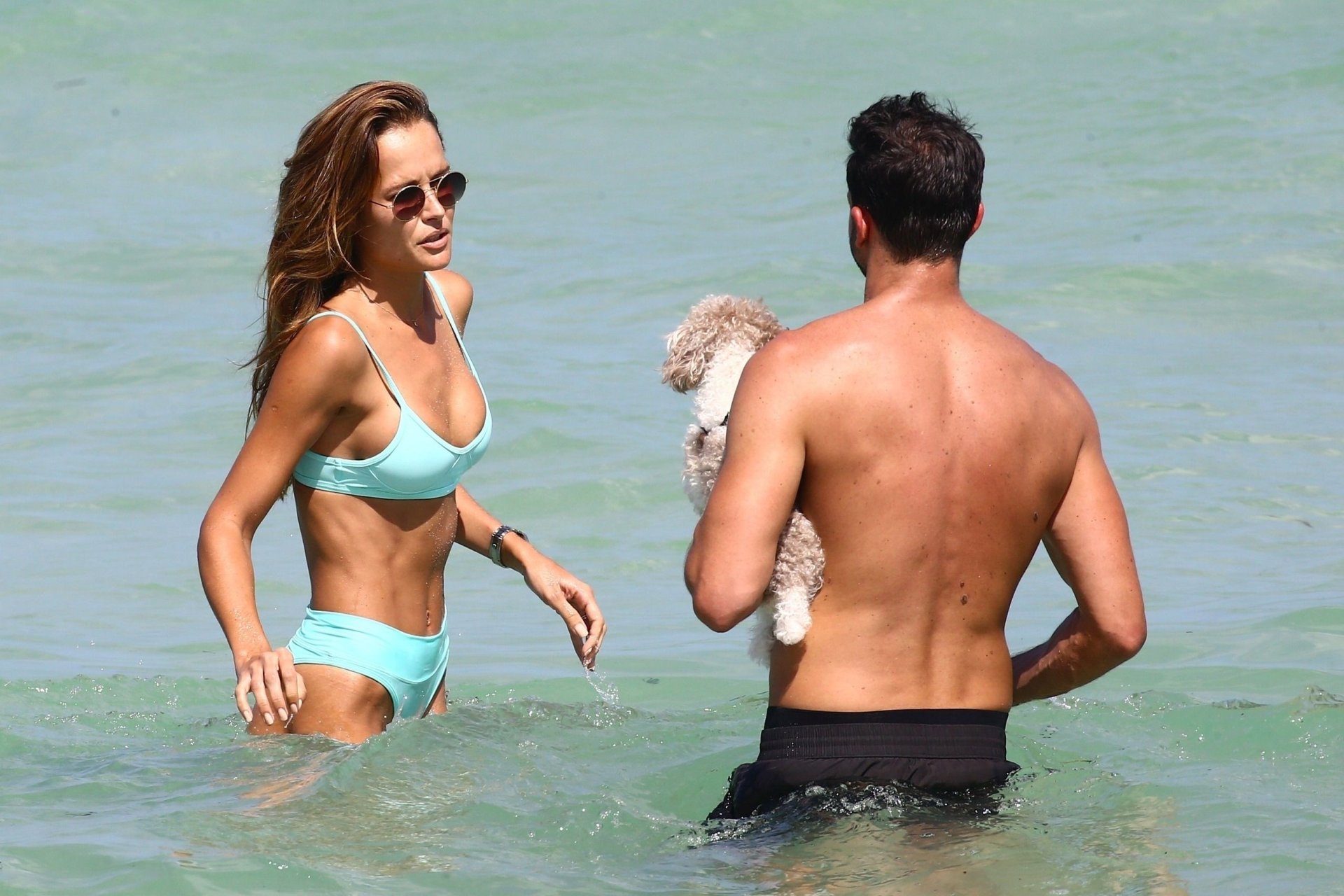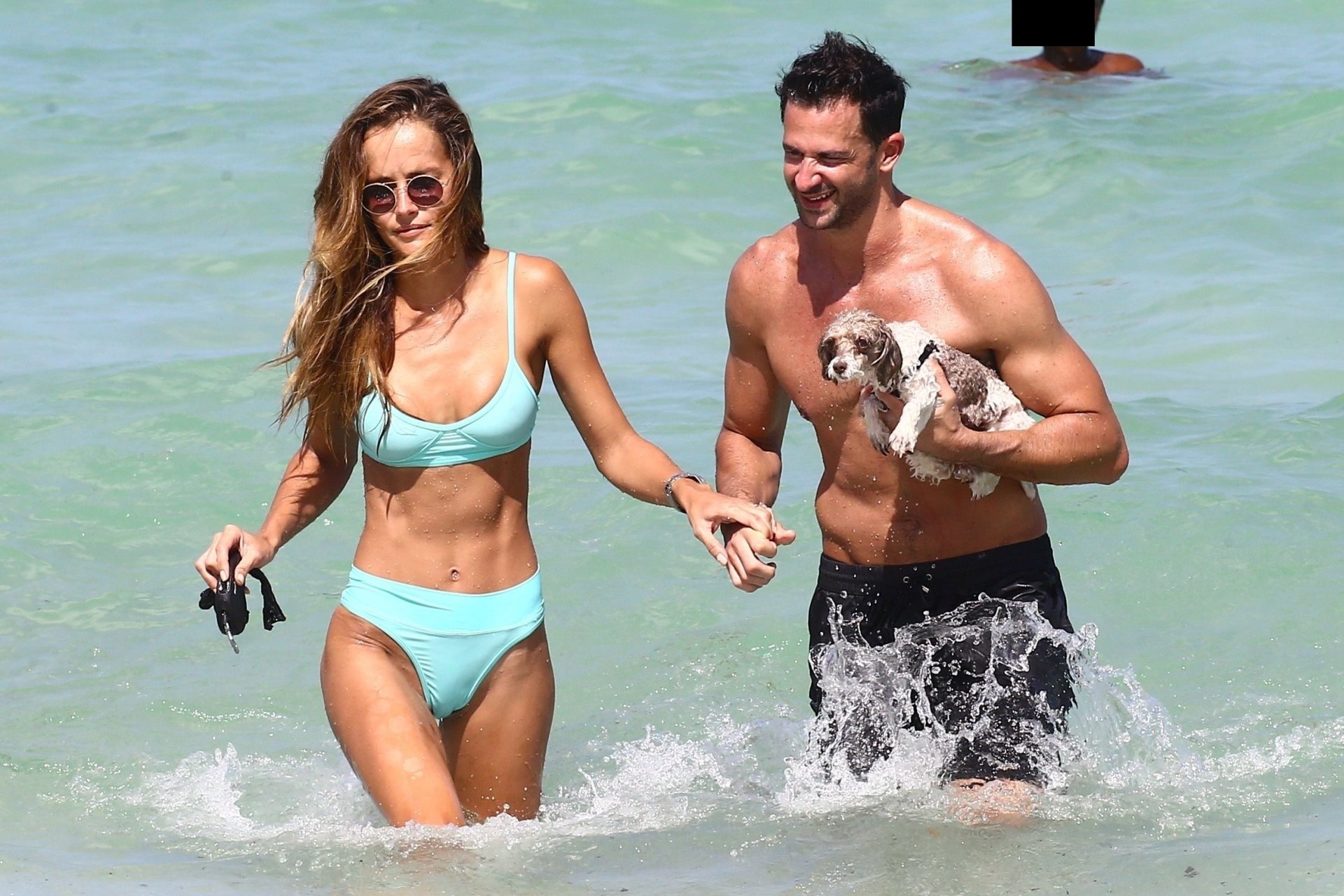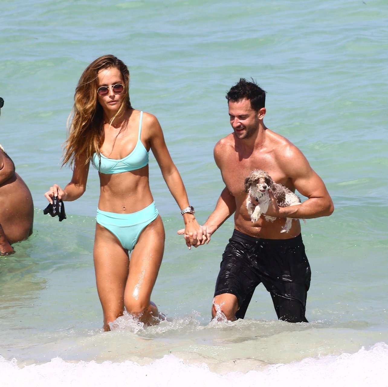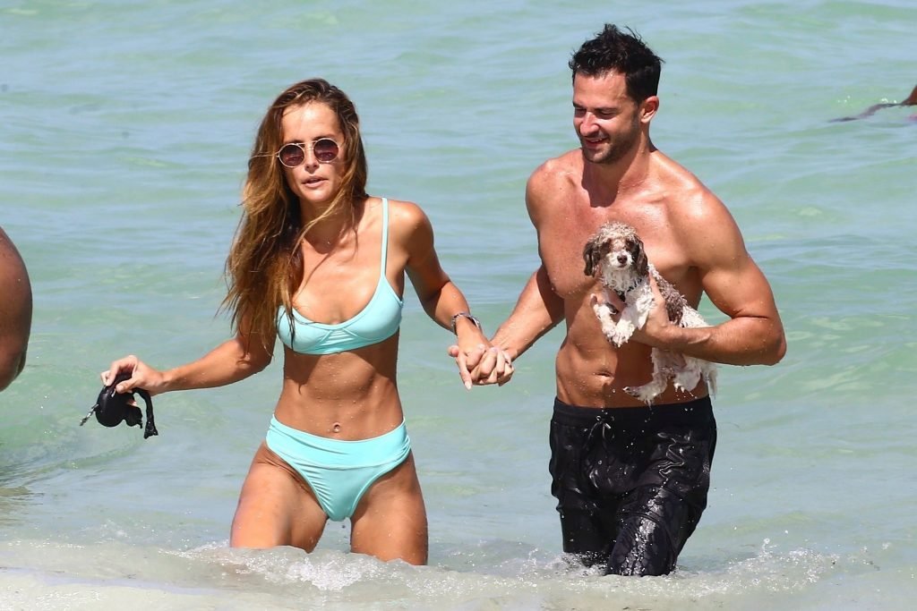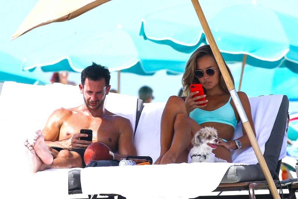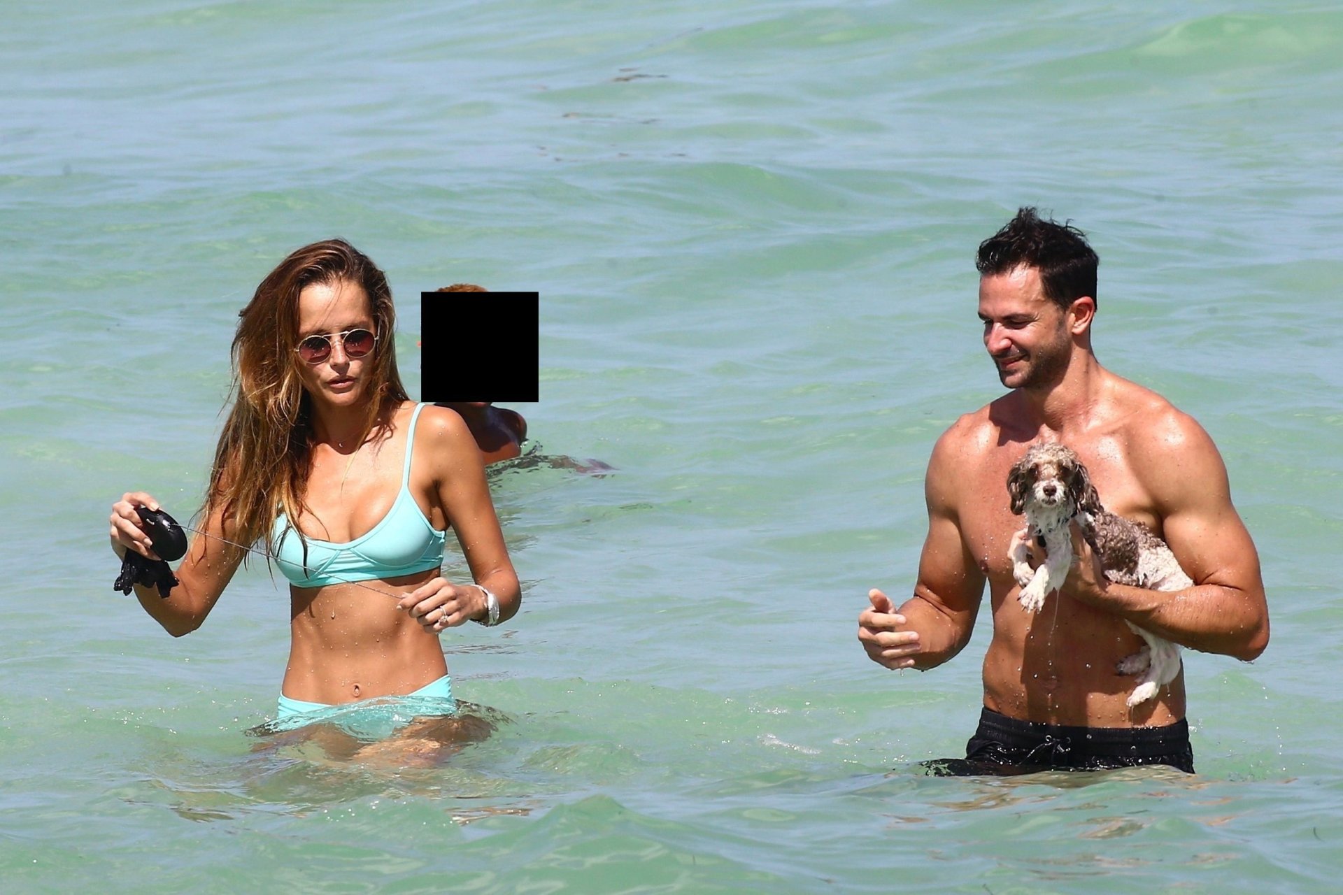 A modelo de 31 anos Natalia Borges e o marido Michael Satsky levam seu cachorro para a água para se refrescar do calor em Miami Beach, 05/08/2017.