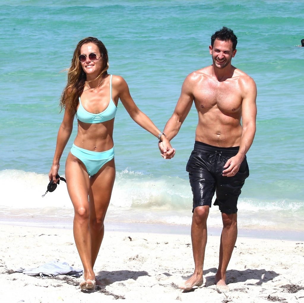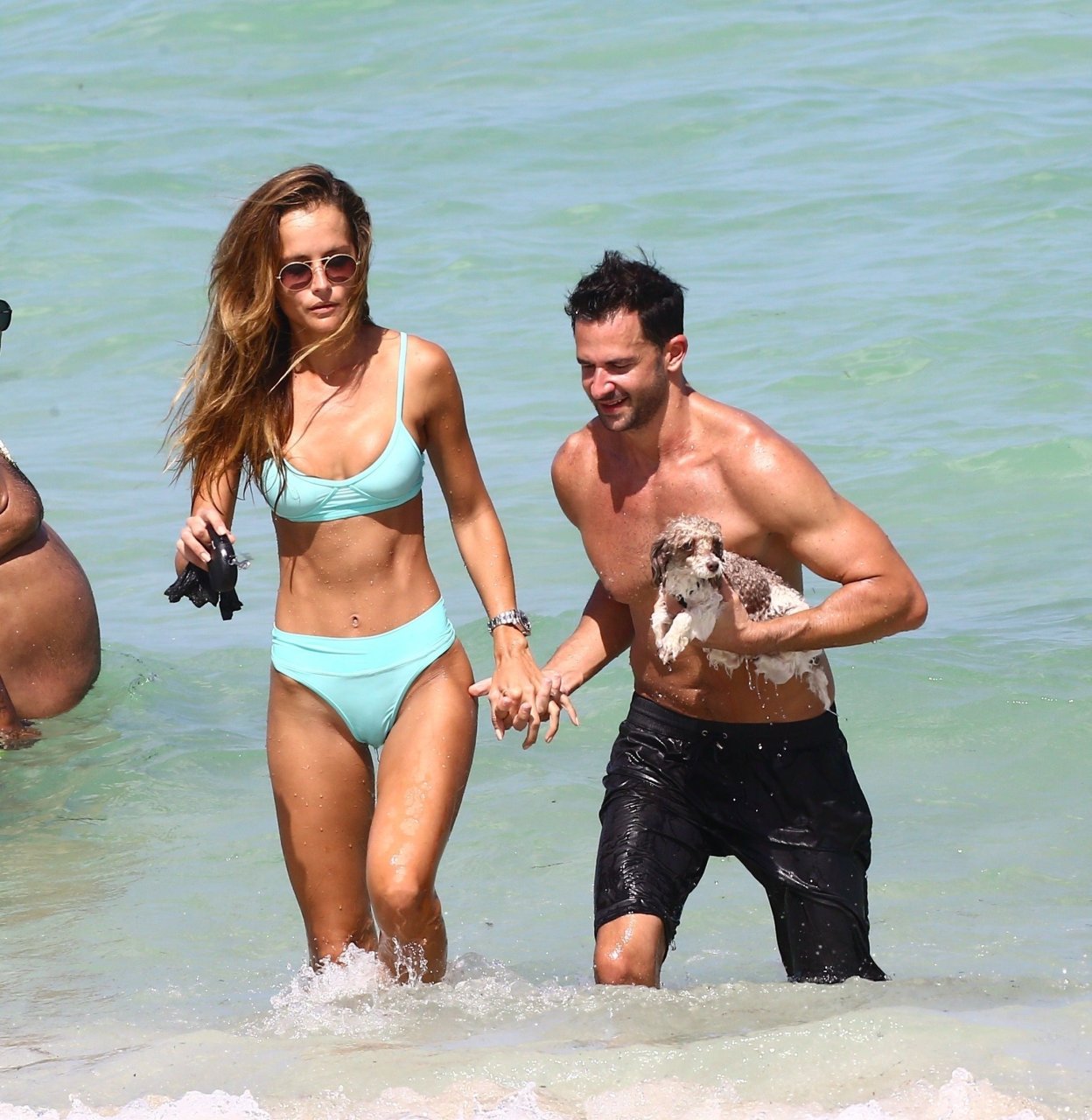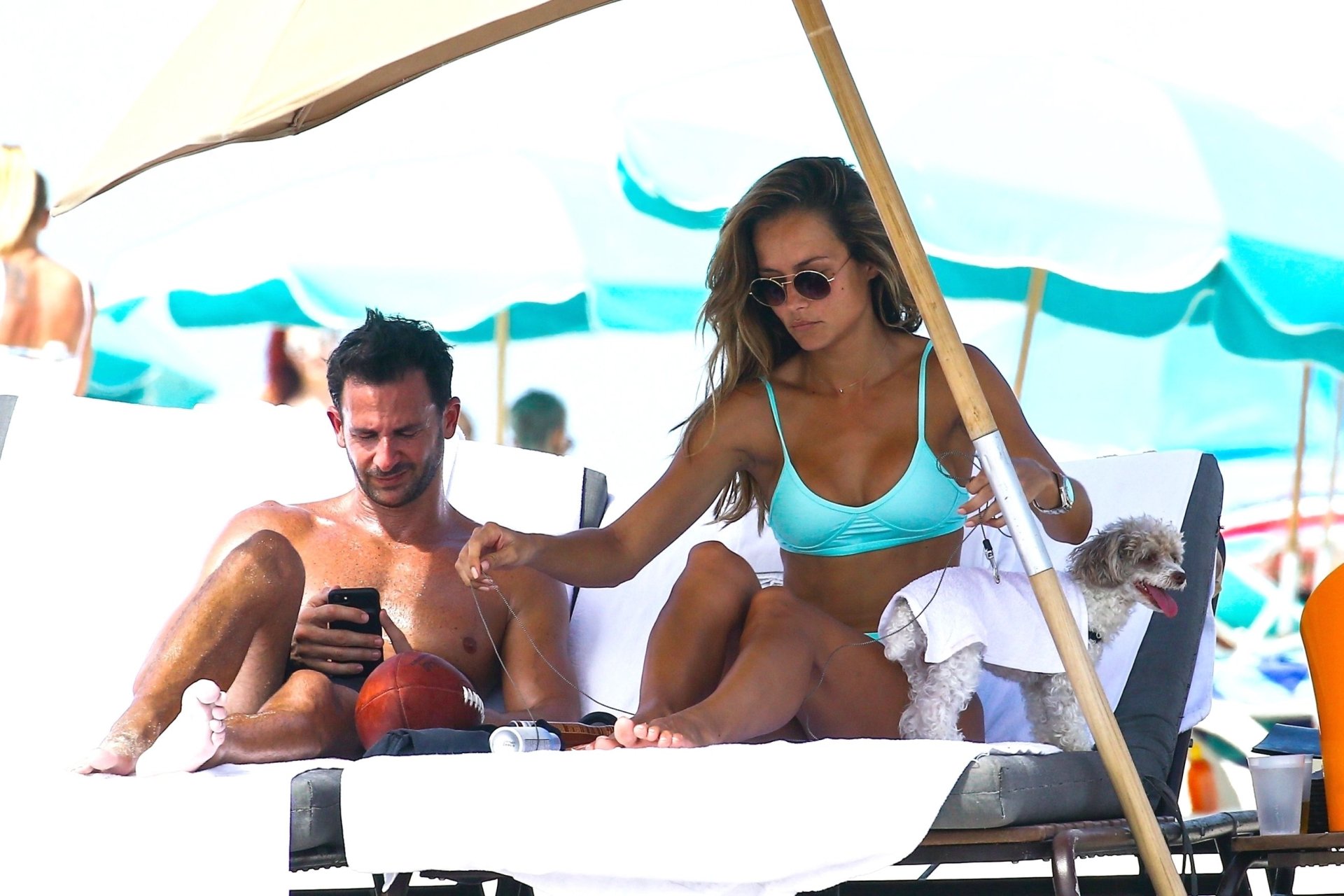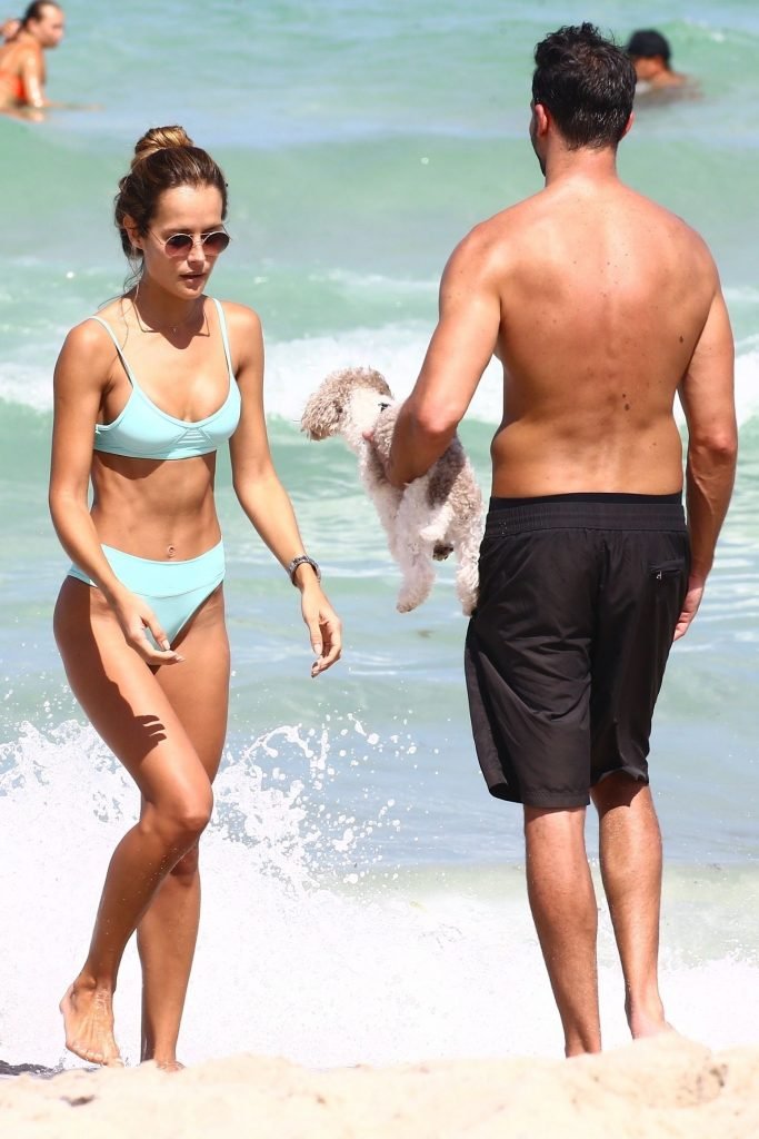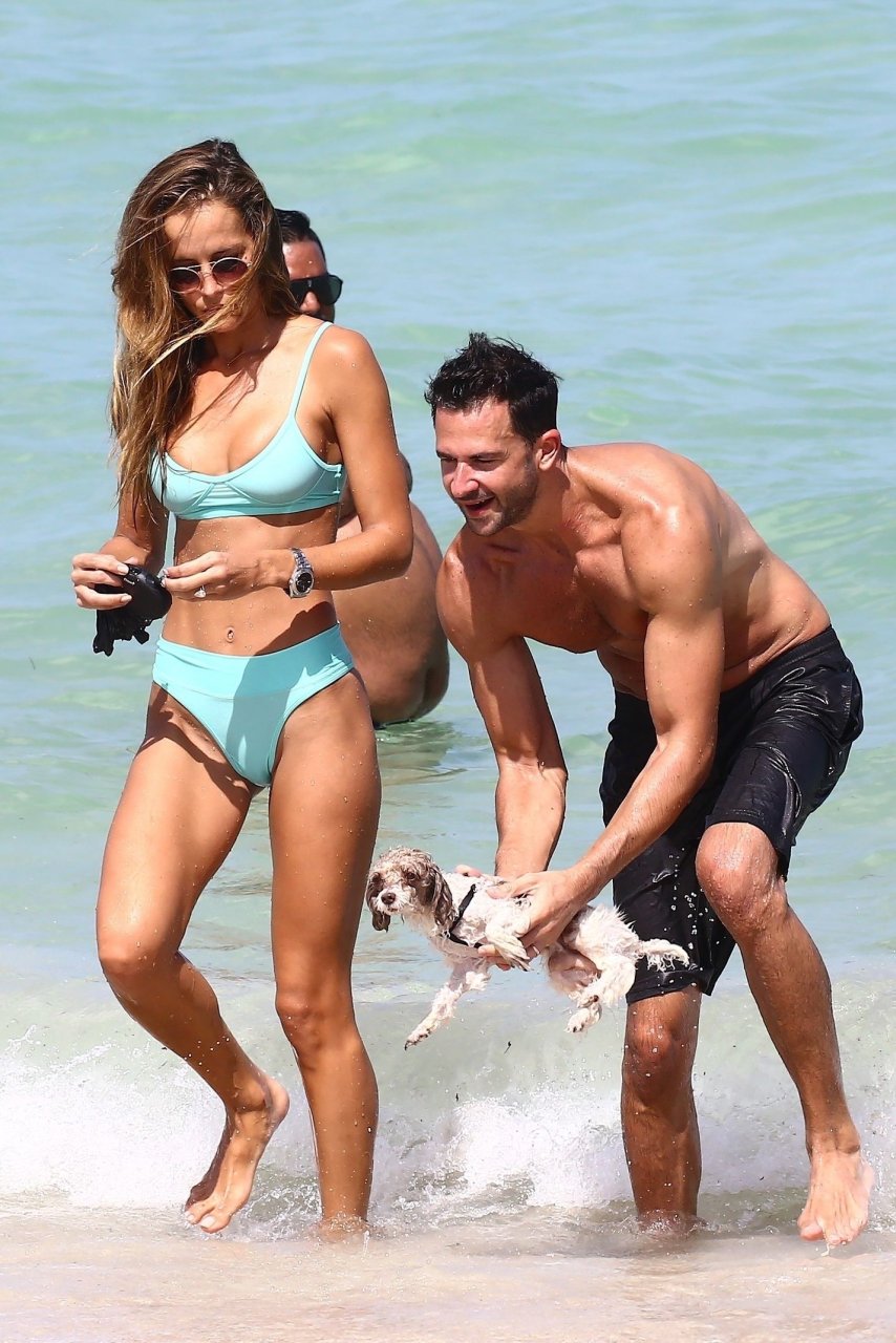 A modelo de 31 anos Natalia Borges e o marido Michael Satsky levam seu cachorro para a água para se refrescar do calor em Miami Beach, 05/08/2017.