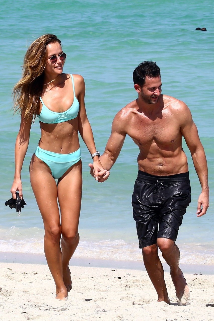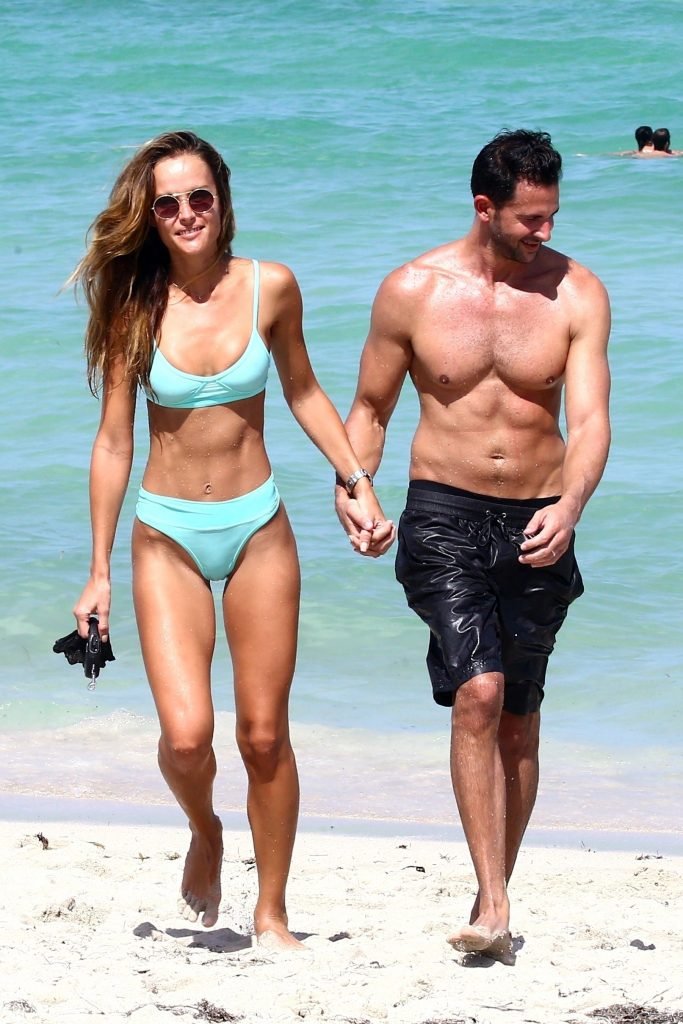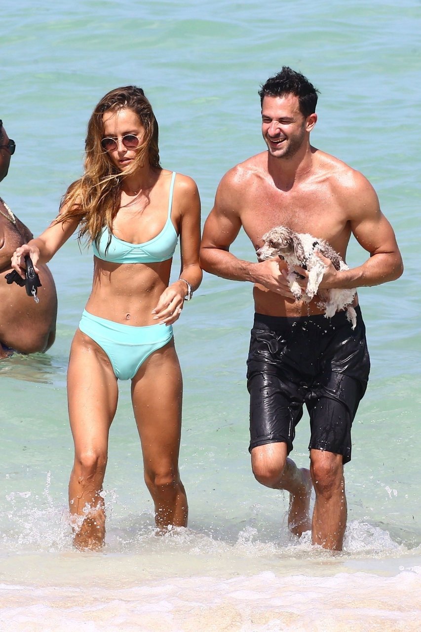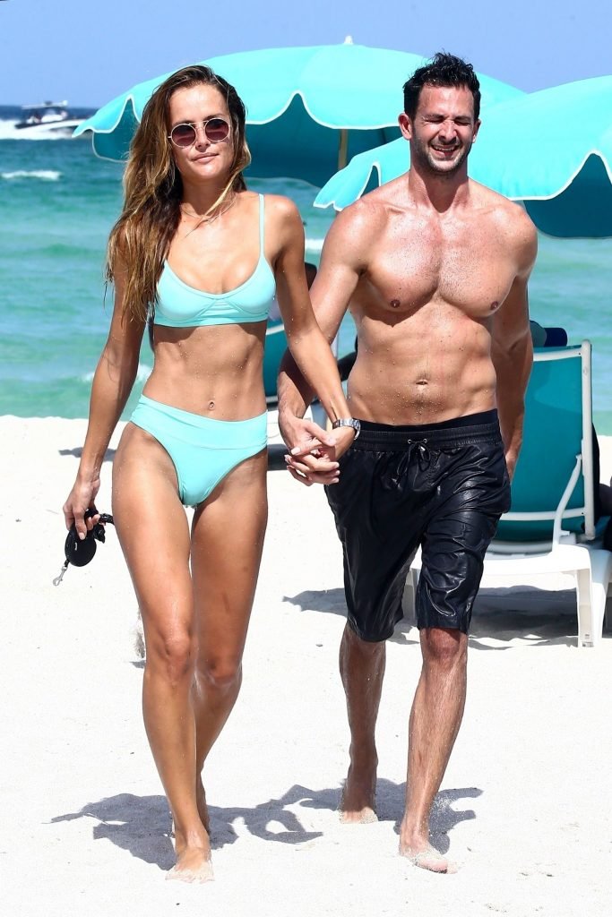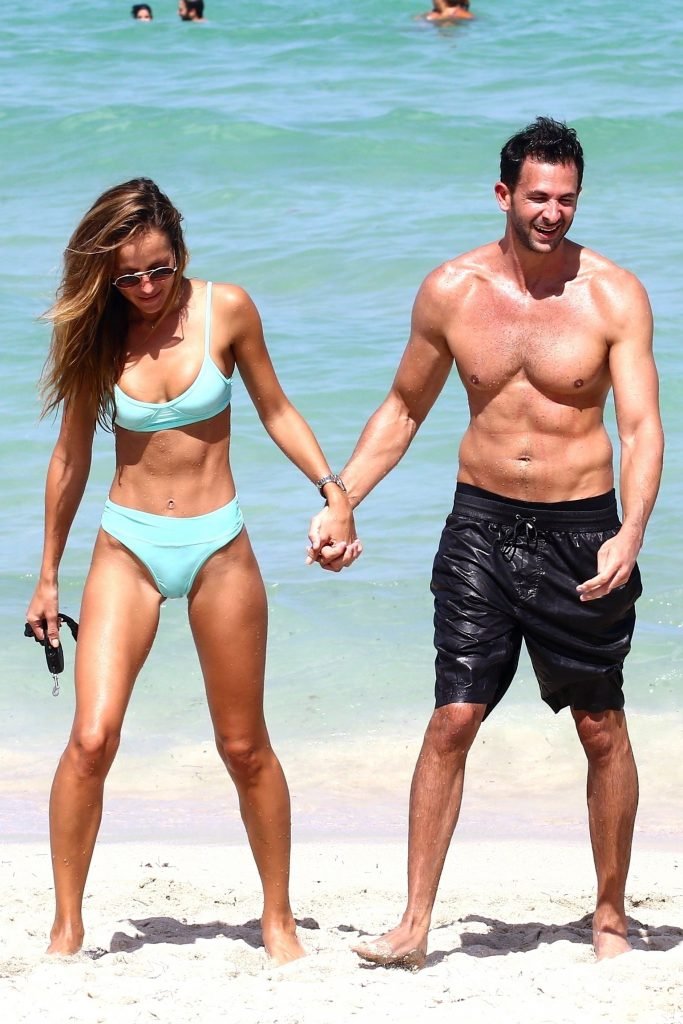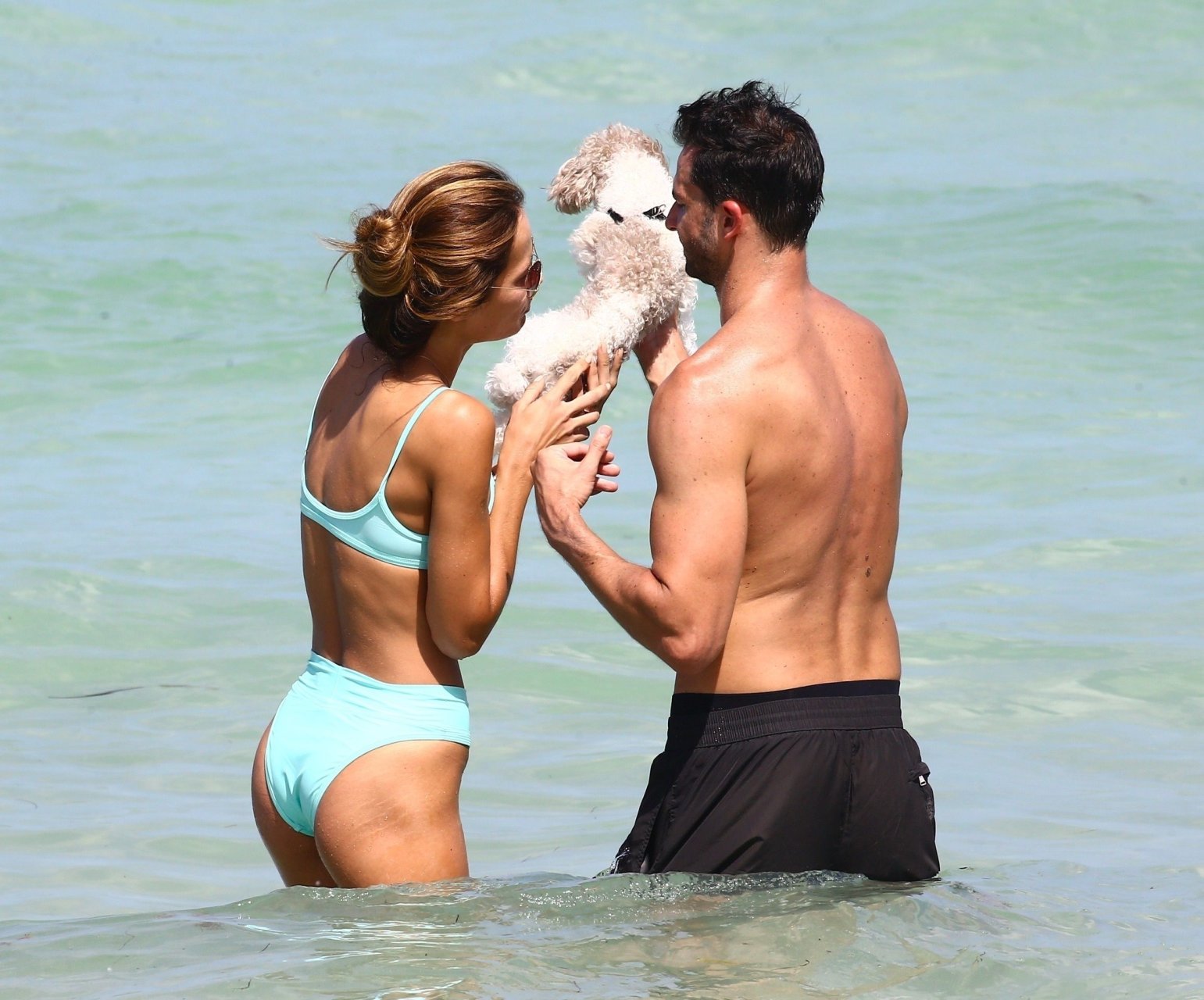 A modelo de 31 anos Natalia Borges e o marido Michael Satsky levam seu cachorro para a água para se refrescar do calor em Miami Beach, 05/08/2017.