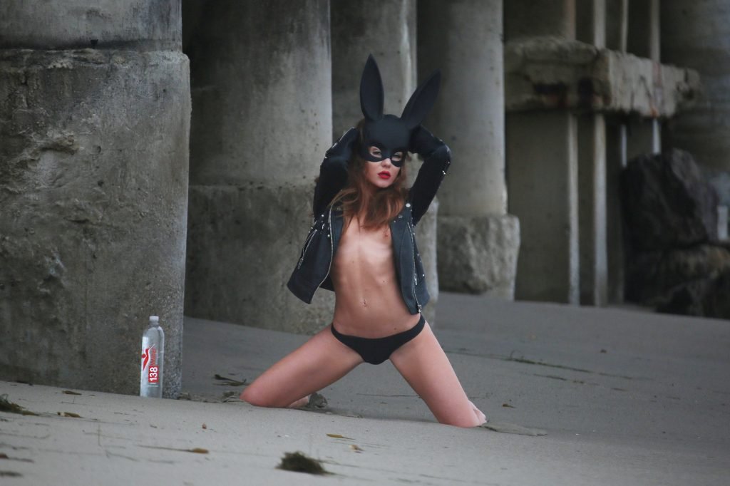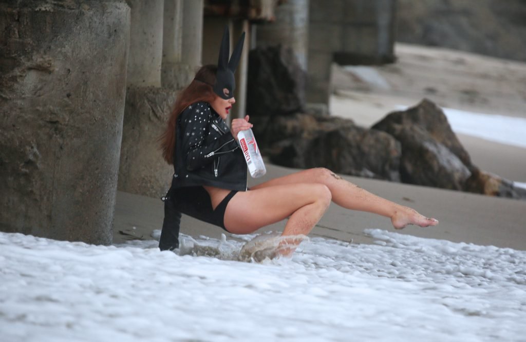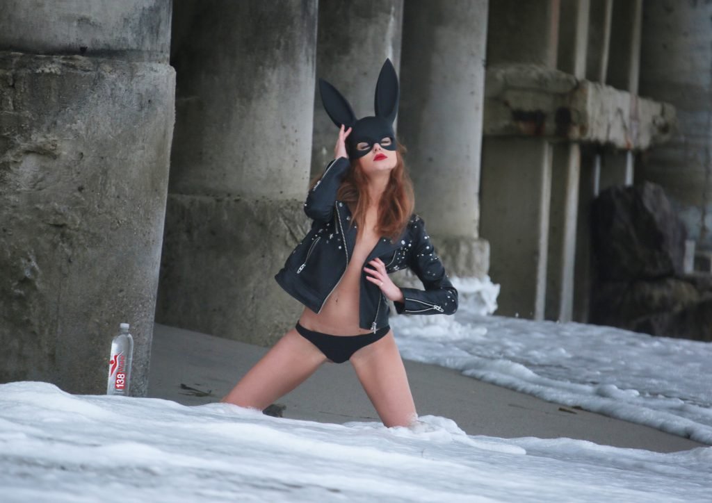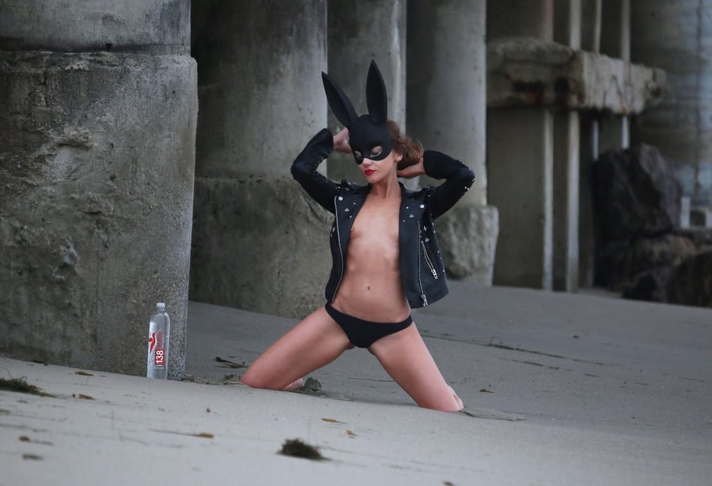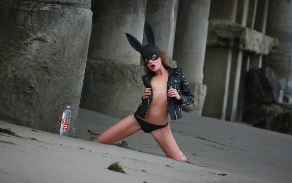 Modelo e atriz russa Natalia Borowsky usa orelhas de coelho e uma jaqueta de couro sexy antes de ficar topless no set de uma sessão de fotos da 138 Water em uma praia privada no sul da Califórnia, 19/06/2018.