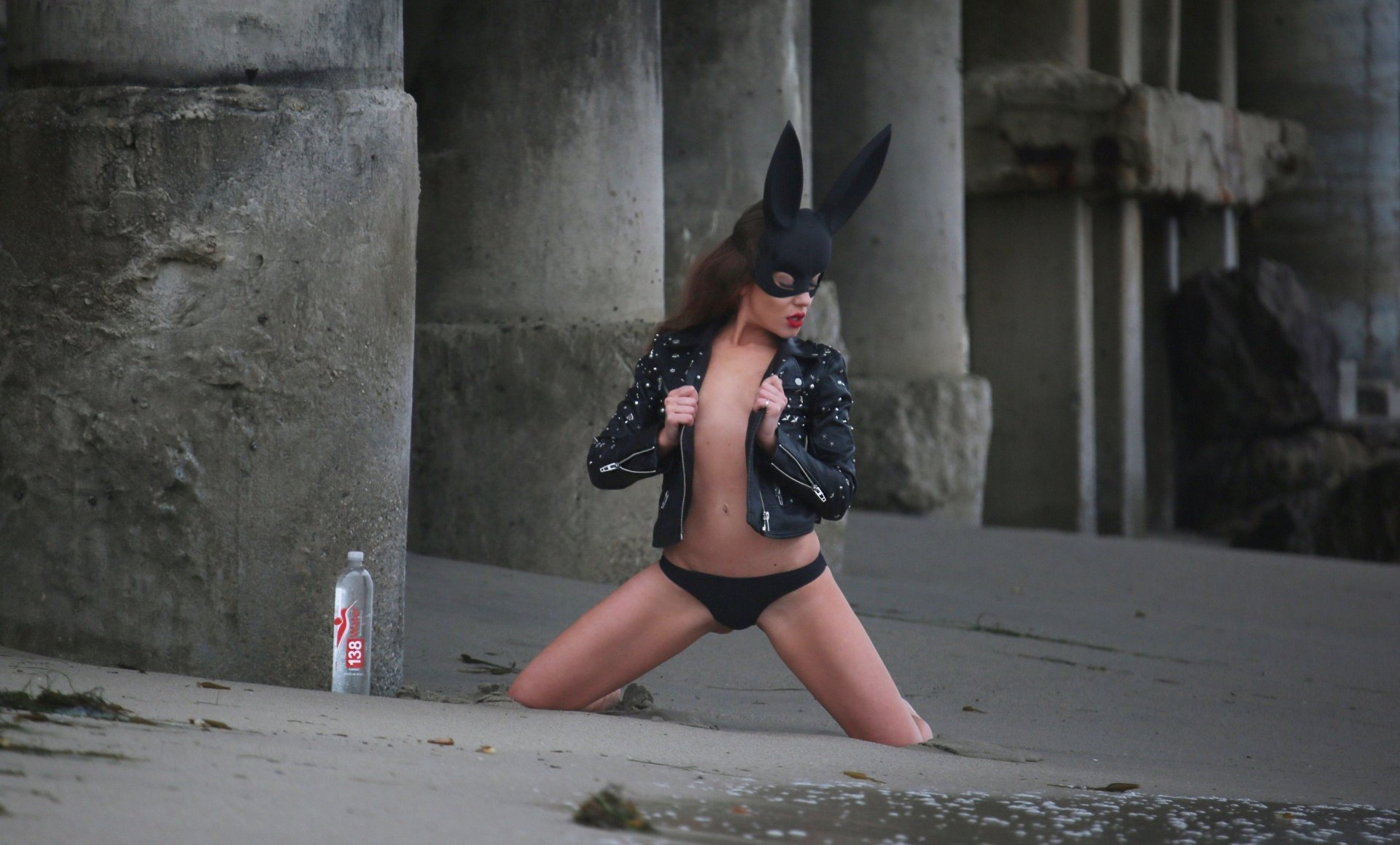 Modelo e atriz russa Natalia Borowsky usa orelhas de coelho e uma jaqueta de couro sexy antes de ficar topless no set de uma sessão de fotos da 138 Water em uma praia privada no sul da Califórnia, 19/06/2018.
