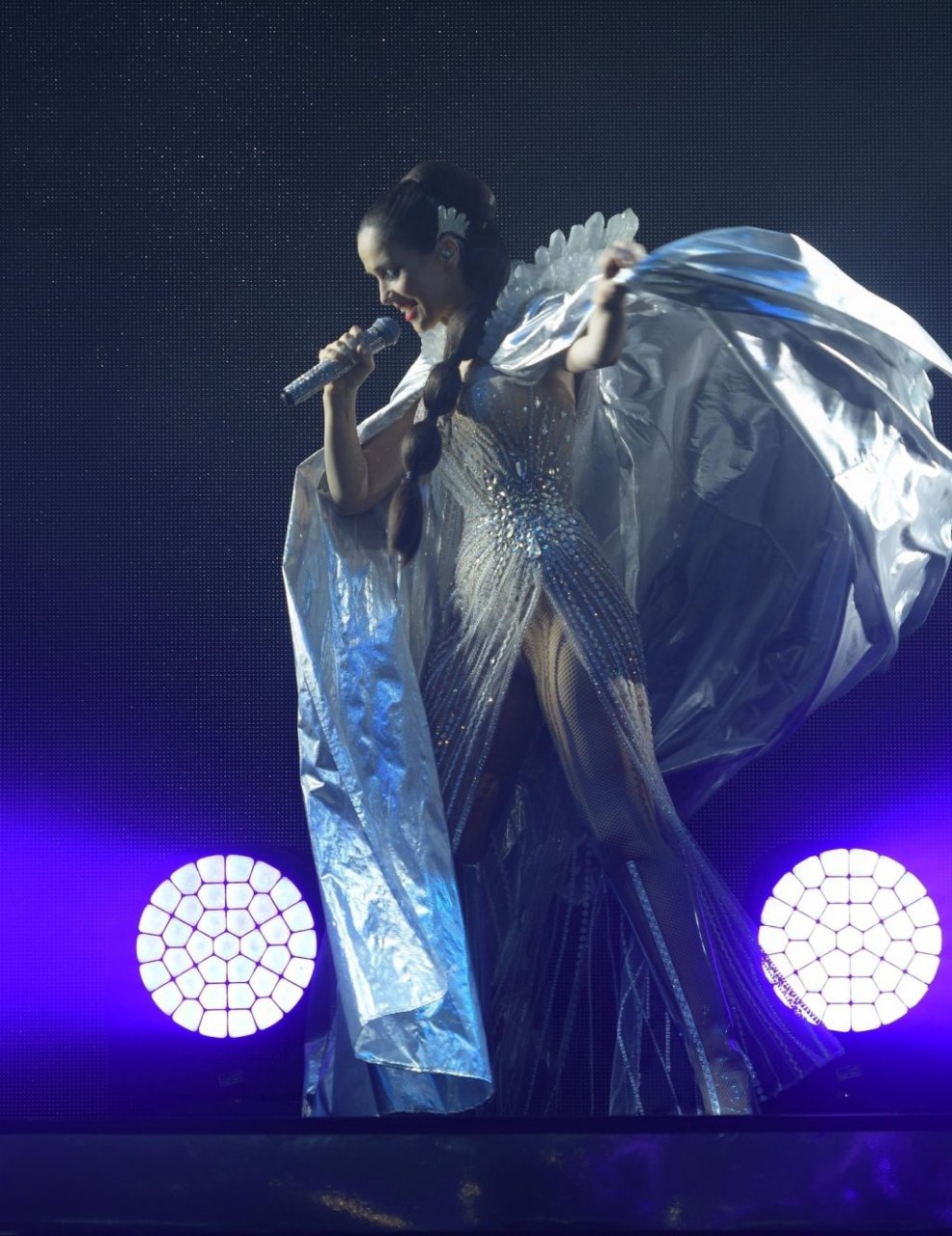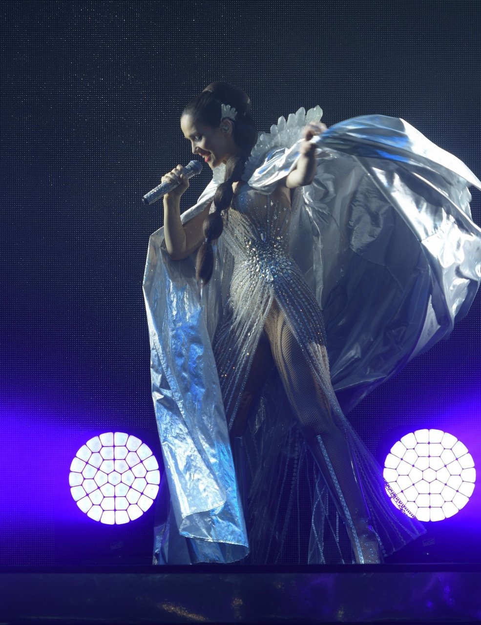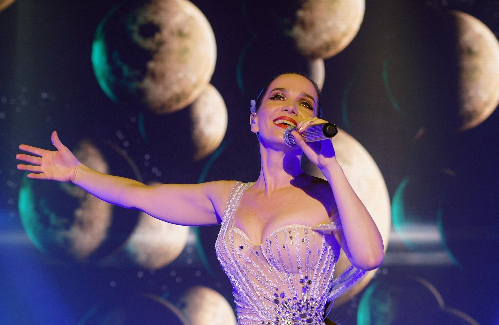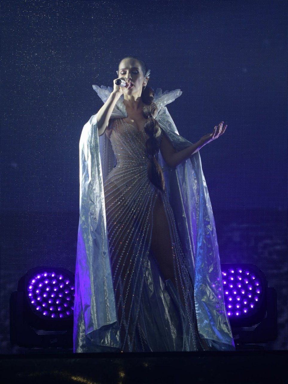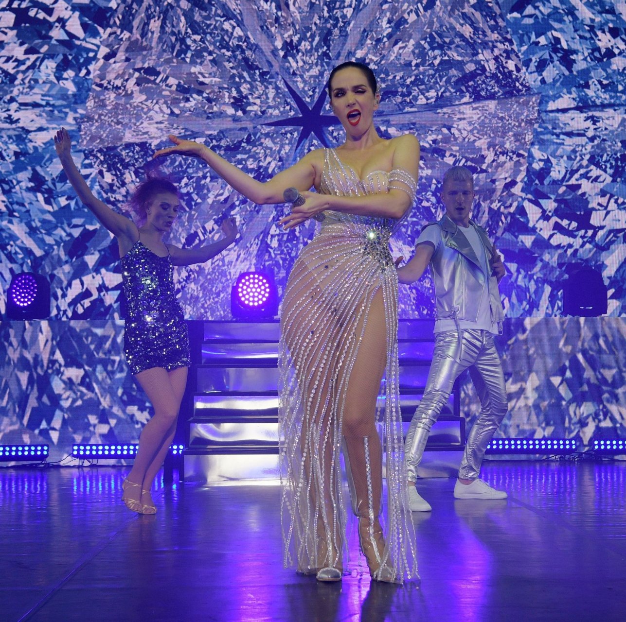 Atriz e cantora uruguaia Natalia Oreiro no palco em concerto, apresentando-se ao vivo durante sua Turnê Inesquecível no Crocus City Hall de Moscou, 28/03/2019.