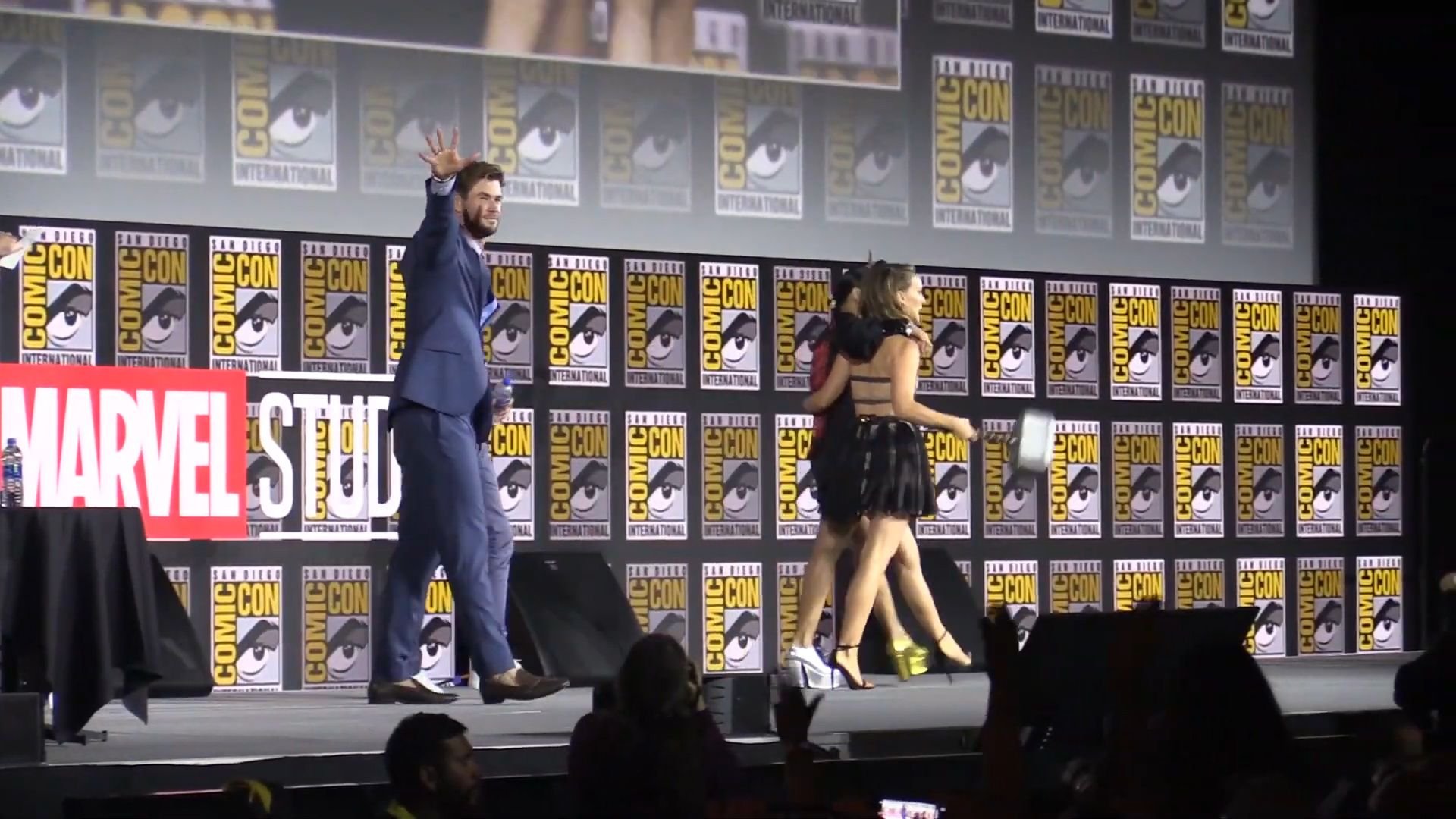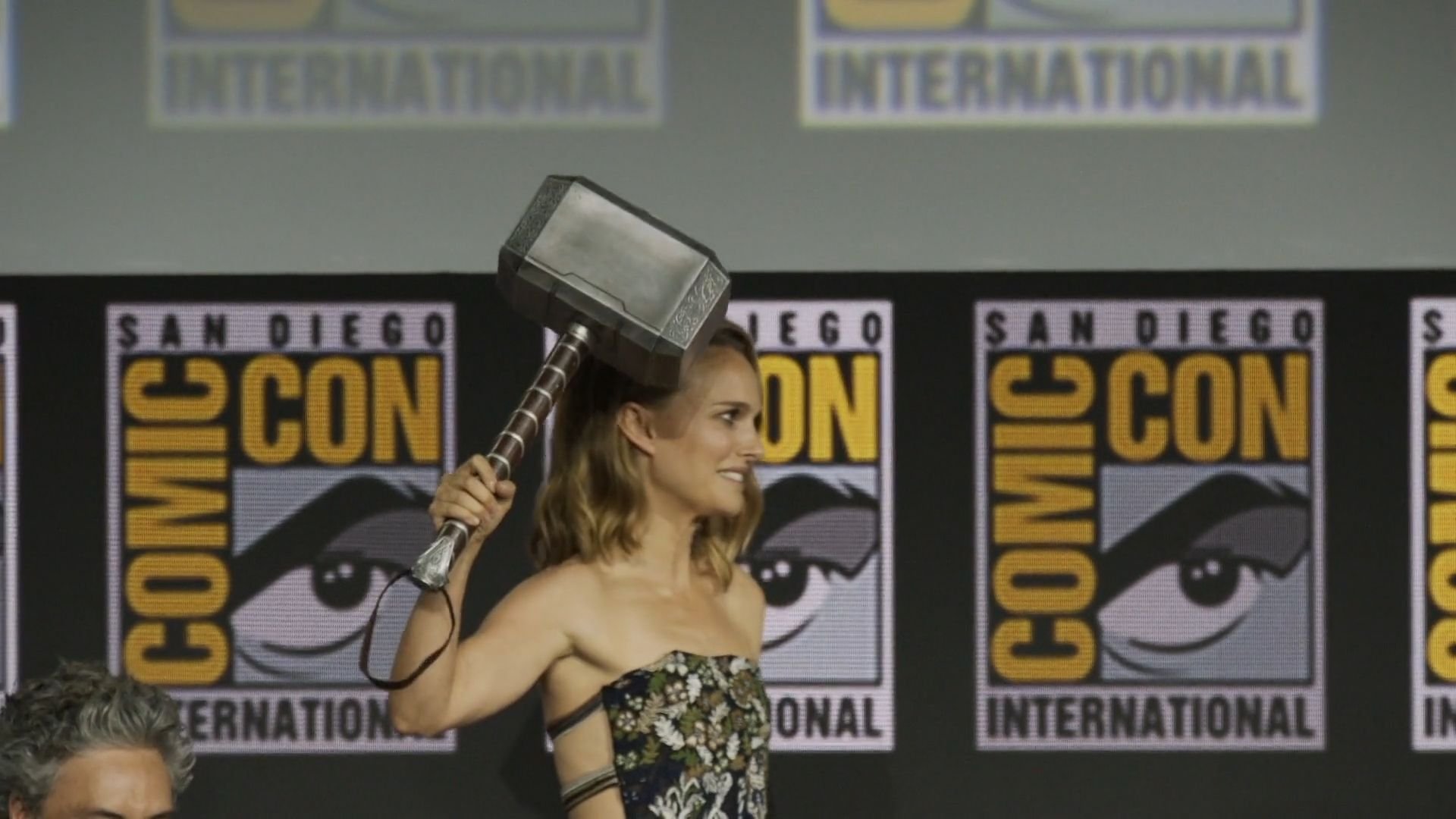 Natalie Portman, com pernas longas, prova que merece o Martelo de Thor ao ser anunciado durante o Painel da Marvel no Hall H que sua personagem Jane retornará para Thor 4, desta vez como Lady Thor, durante o dia 3 da Comic-Con 2019 em San Diego, 20/07/2019.