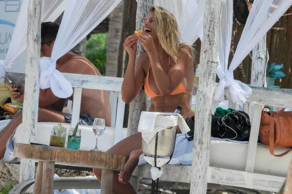 Natalie Roser aproveita um tempo de descanso com seu namorado em Tulum, 05/06/2019. Mais tarde à tarde, a modelo australiana posou para fotos sensuais com suas amigas de biquíni enquanto relaxava na praia e tomava coquetéis.