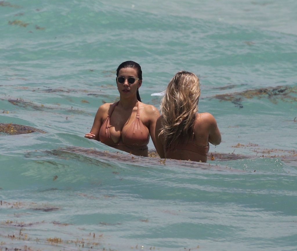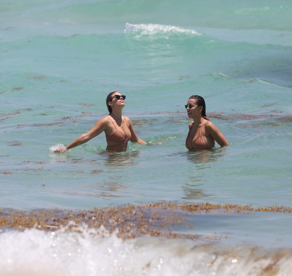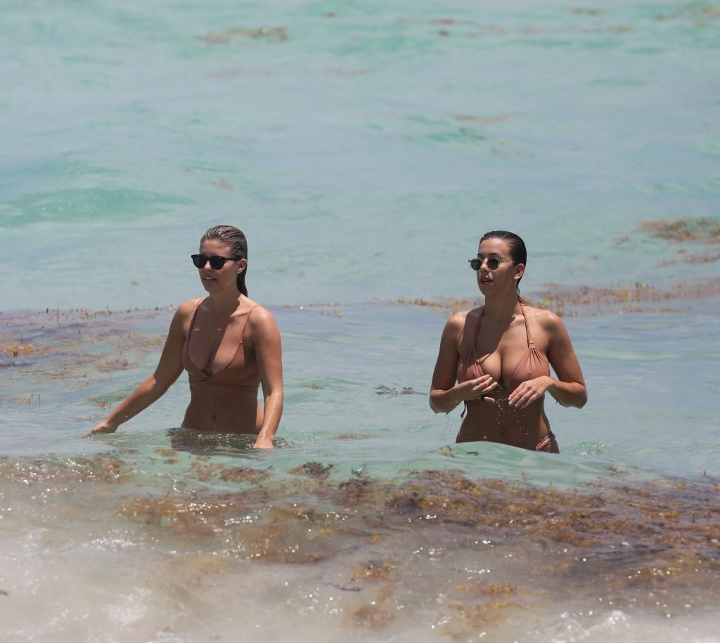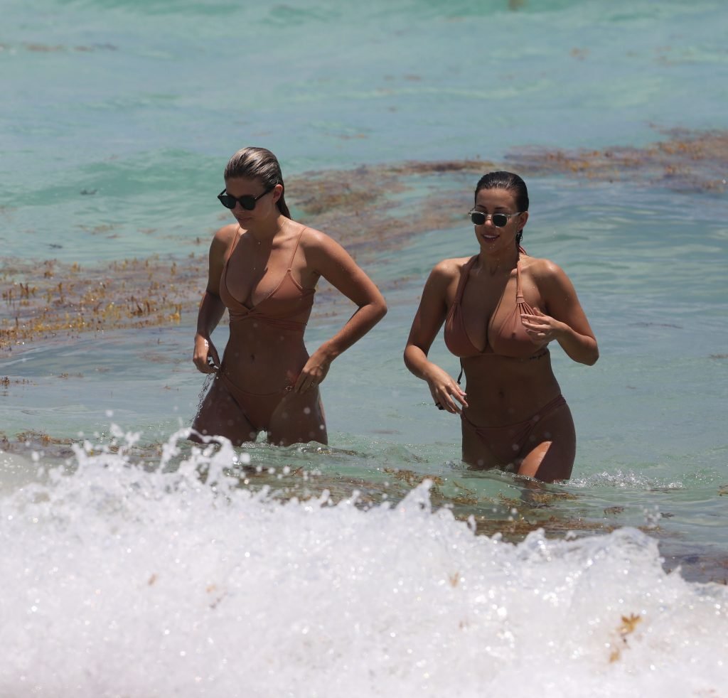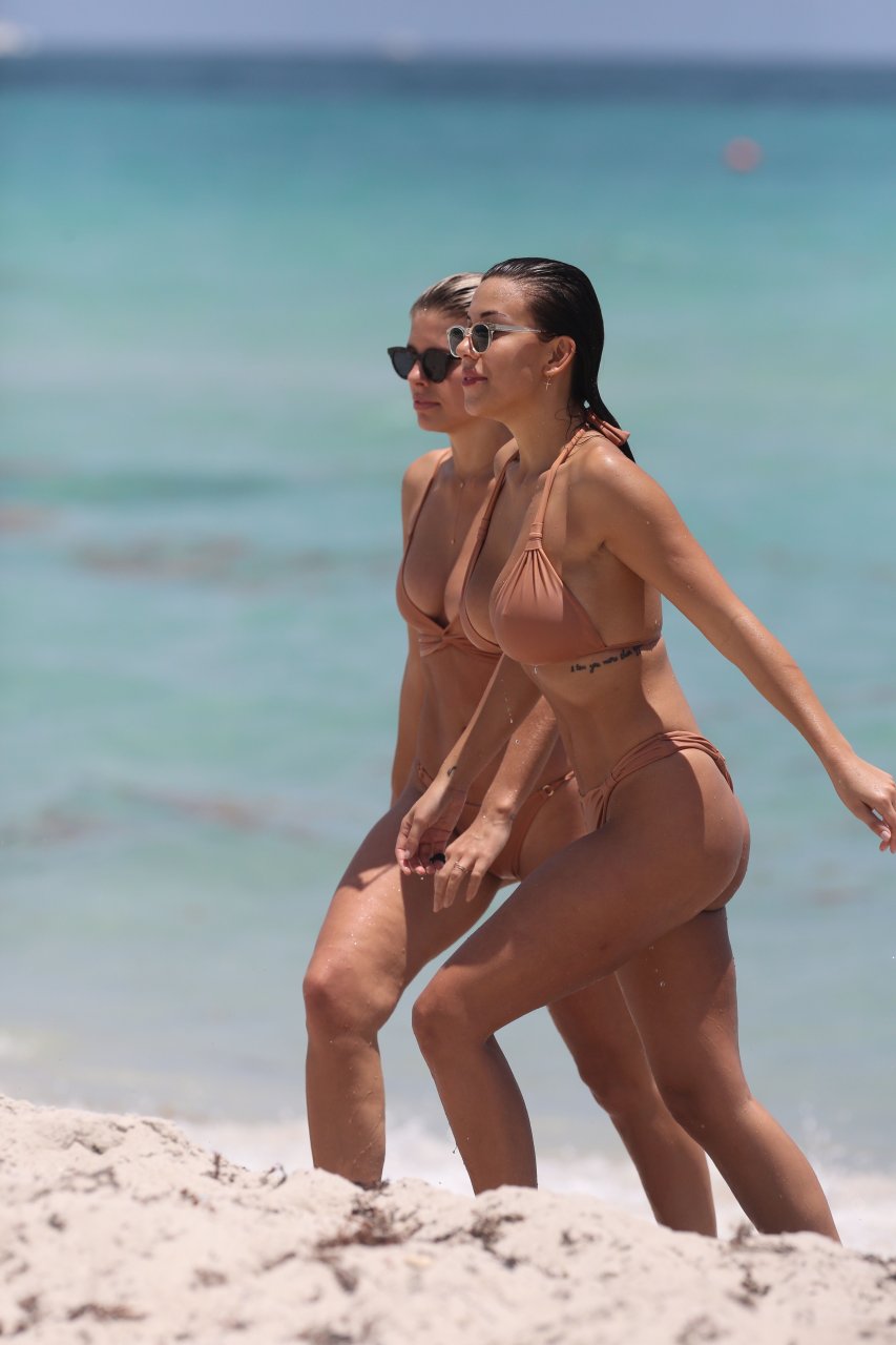 Modelos sensuais e voluptuosas Natasha Oakley e Devin Brugman aproveitam um dia de biquínis na cor nude na praia em Miami, 04/05/2017.