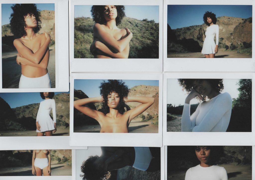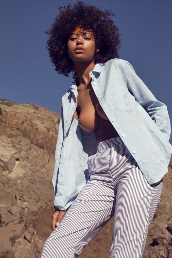 Nereyda Bird fotografada por Mitchell Tomlinson em West Hollywood (2018). Nereyda Bird é uma modelo americana de 20 anos. A beleza negra criada na Filadélfia e baseada em Miami exibiu seus grandes seios naturais sob os céus azuis e as colinas cor de caramelo de Bronson Canyon.
