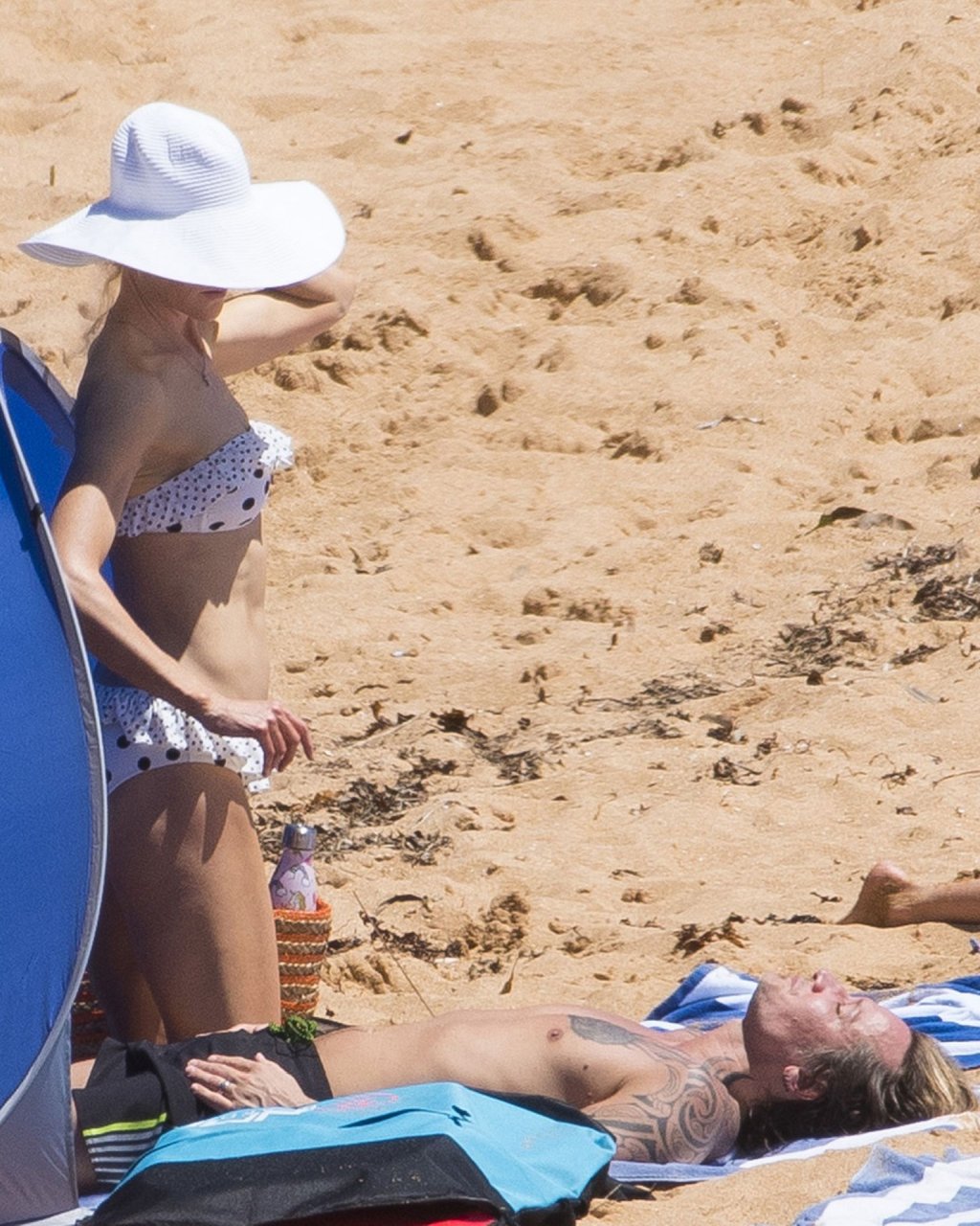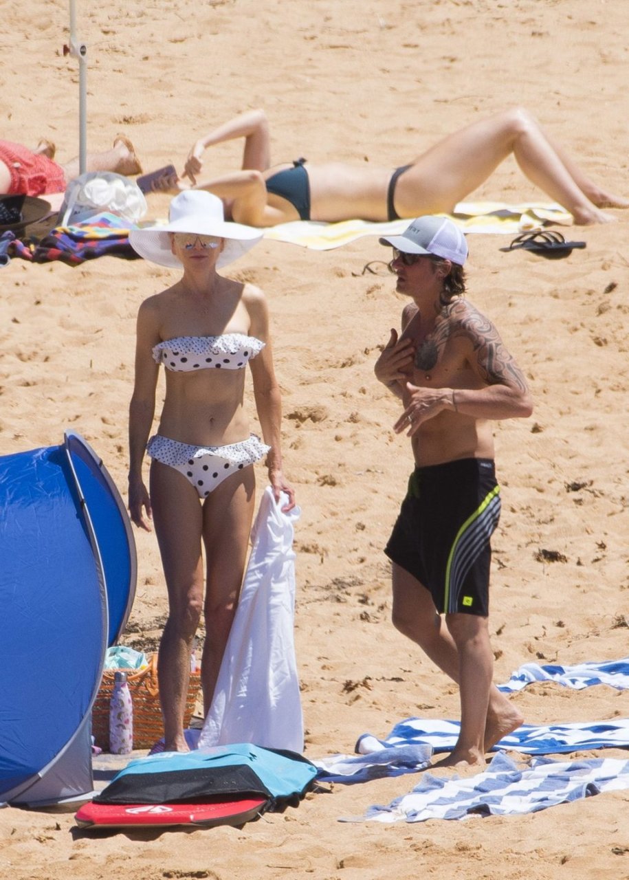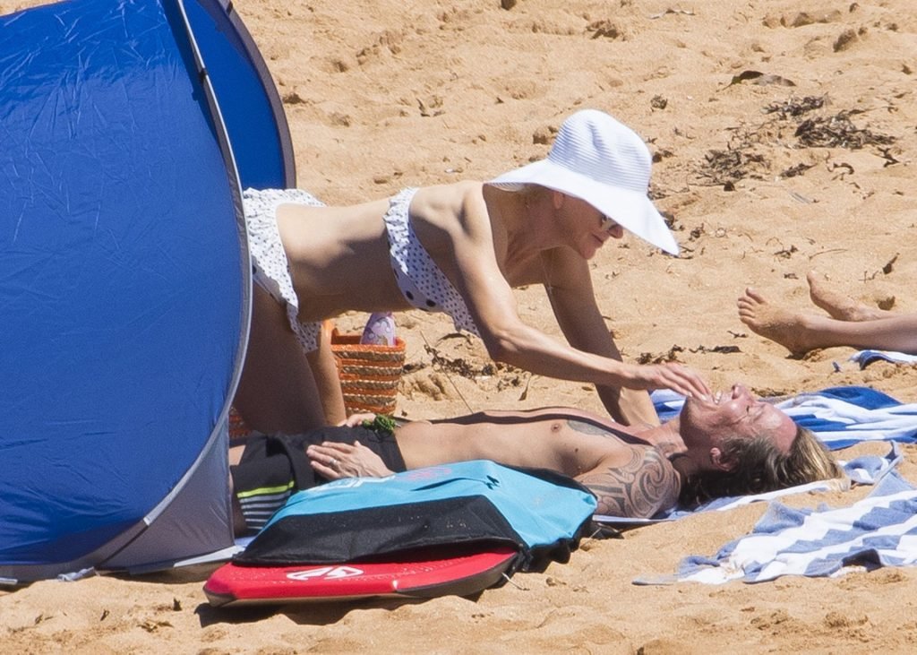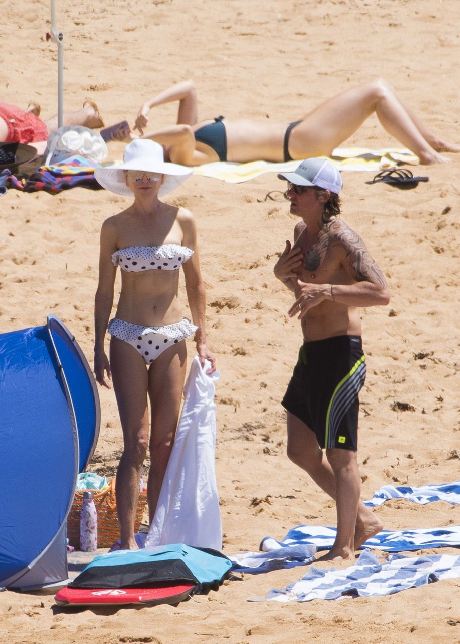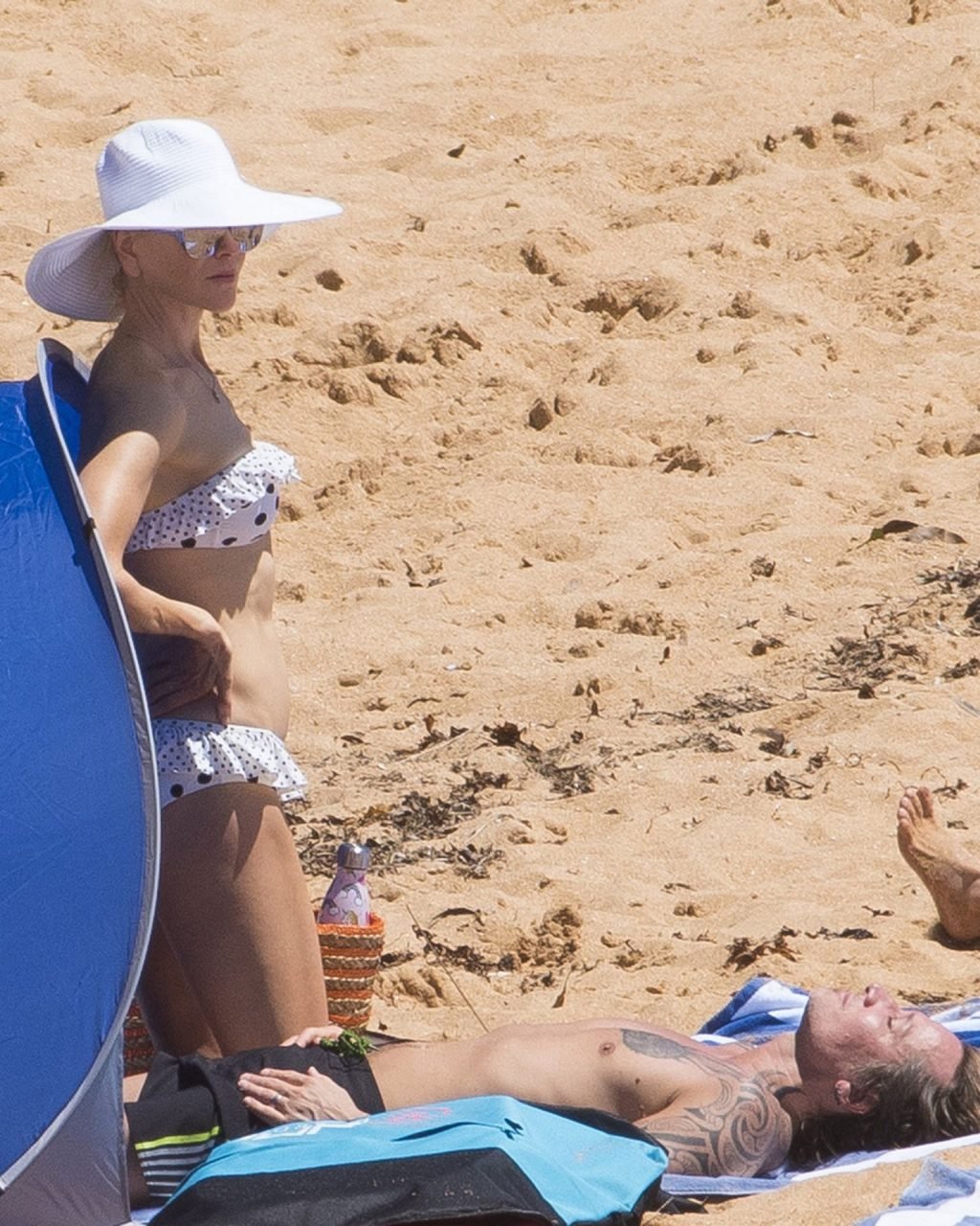 A atriz Nicole Kidman (51) foi fotografada em um momento raramente visto usando um biquíni branco com bolinhas para um dia de véspera de Natal em Palm Beach, Sydney, Austrália, com seu marido Keith Urban, 24/12/2018.
