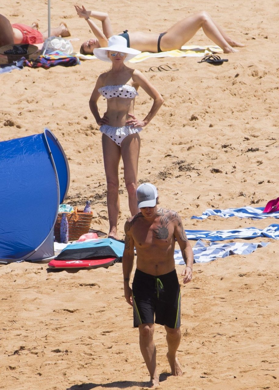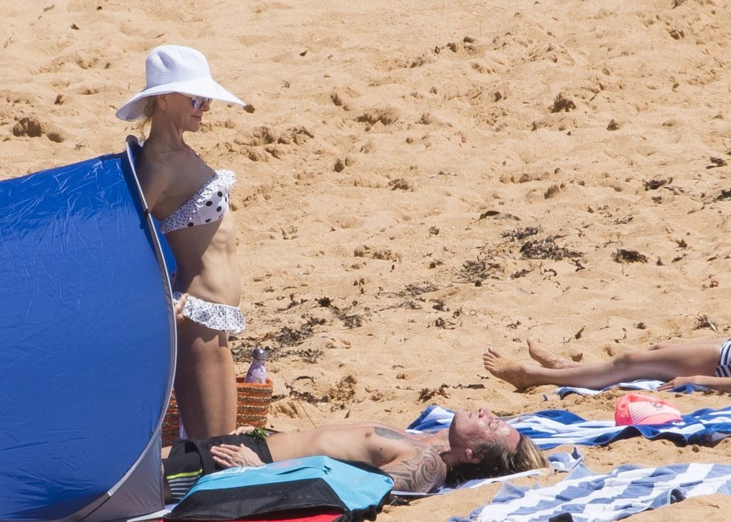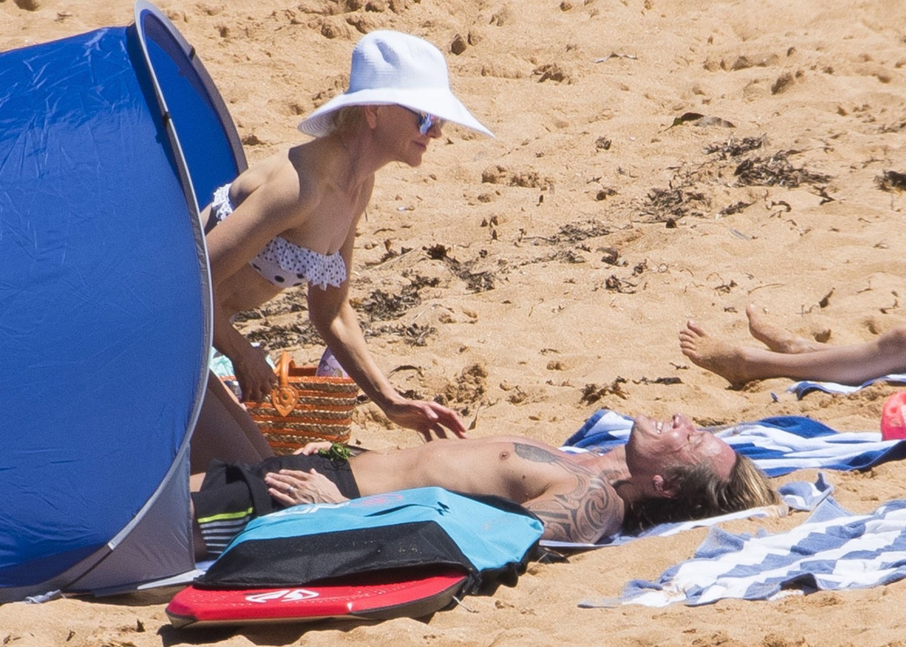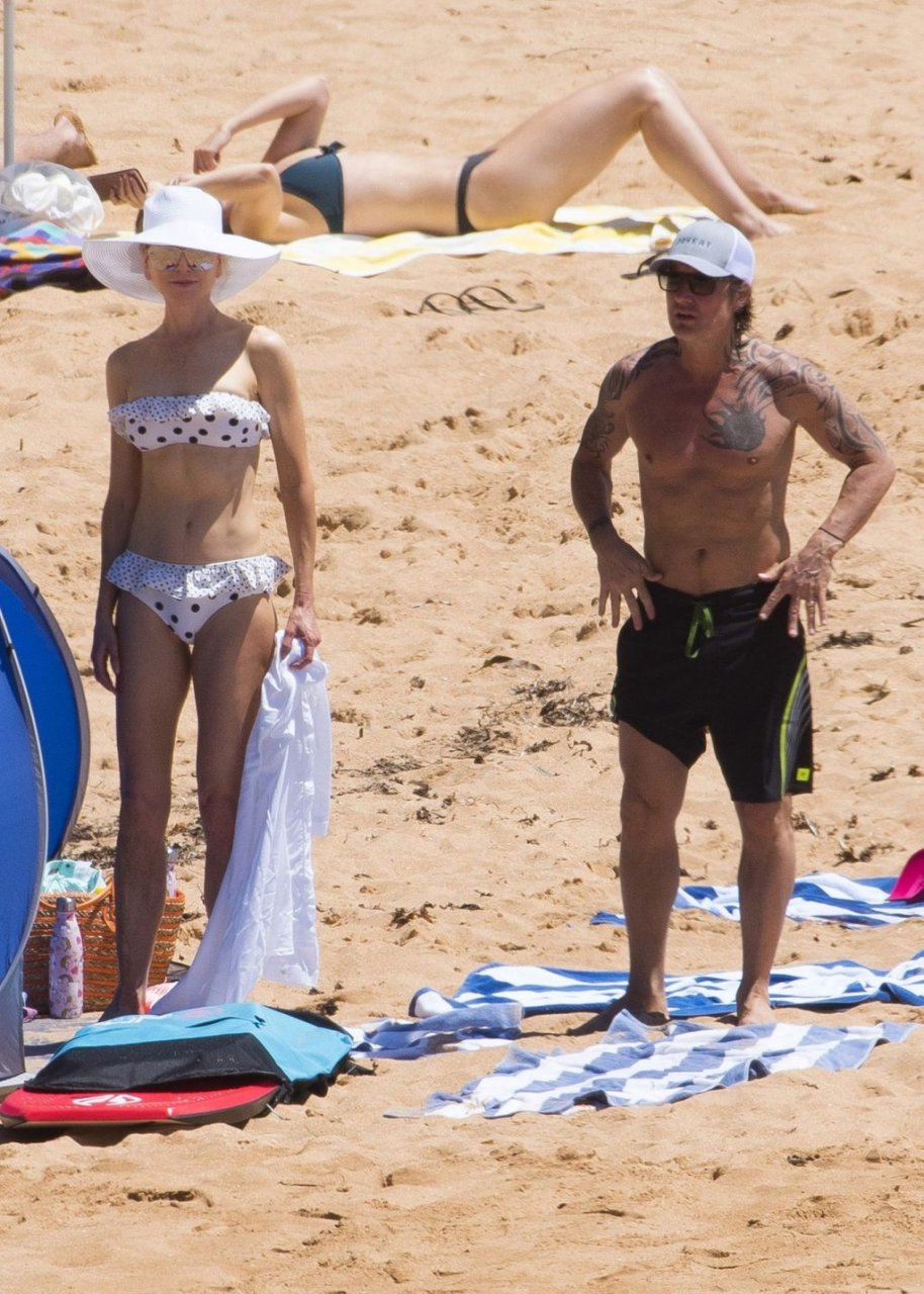 A atriz Nicole Kidman (51) foi fotografada em um momento raramente visto usando um biquíni branco com bolinhas para um dia de véspera de Natal em Palm Beach, Sydney, Austrália, com seu marido Keith Urban, 24/12/2018.