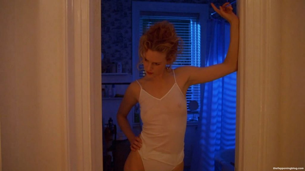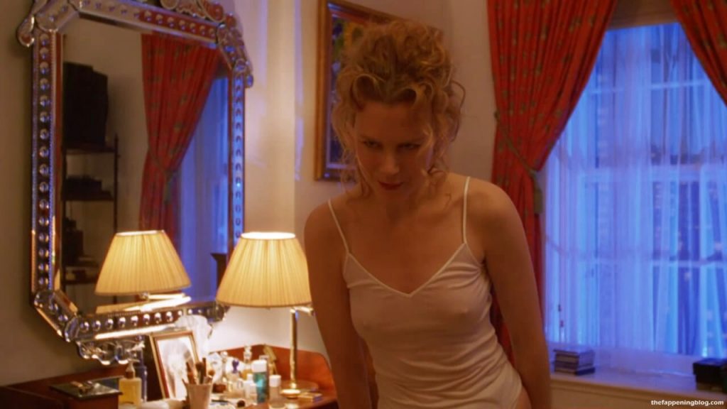 Nicole Kidman está nua em frente a um espelho, seu bumbum nu visível por trás e seus seios visíveis no reflexo enquanto balança um pouco os quadris ao colocar um par de brincos. Um homem então se aproxima dela e a pega nos braços para beijá-la.