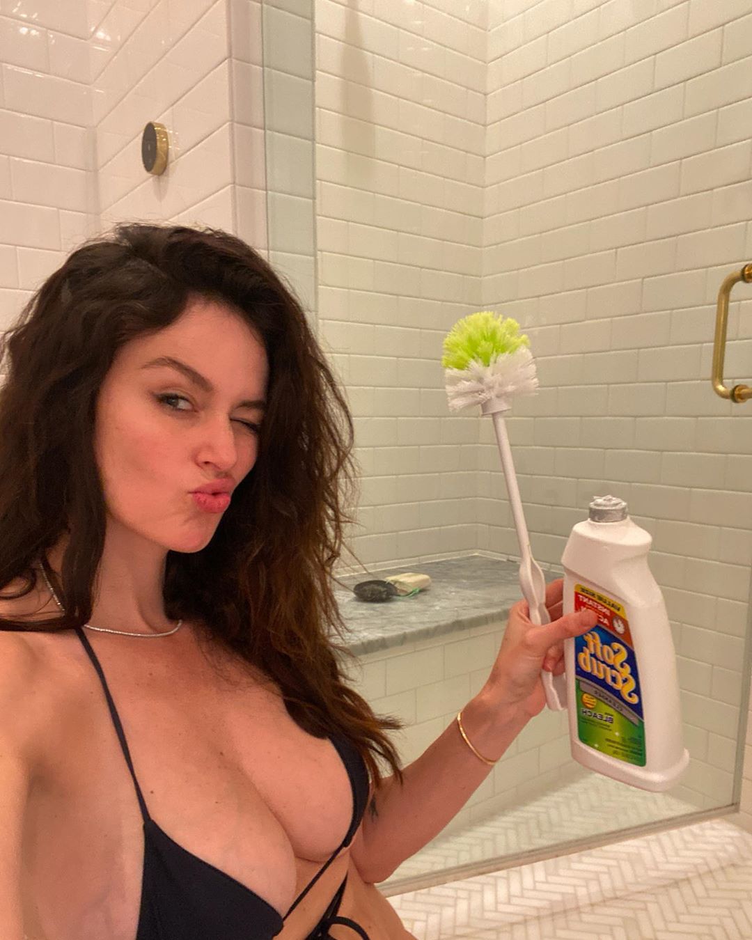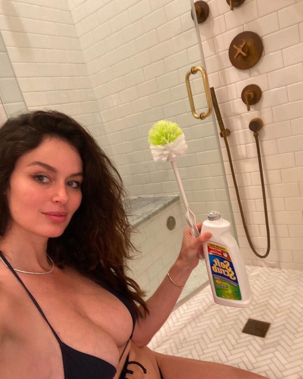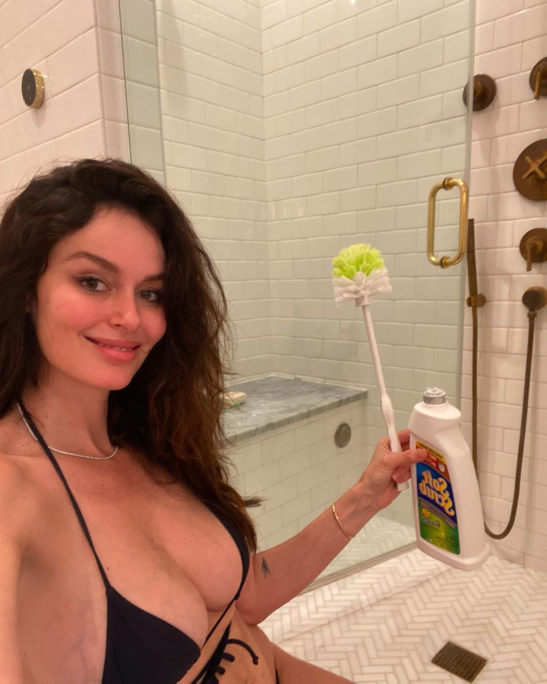 Modelo/atriz australiana Nicole Trunfio (34) exibe seus seios grandes posando de biquíni preto em casa após a gravidez – Instagram (maio de 2020).