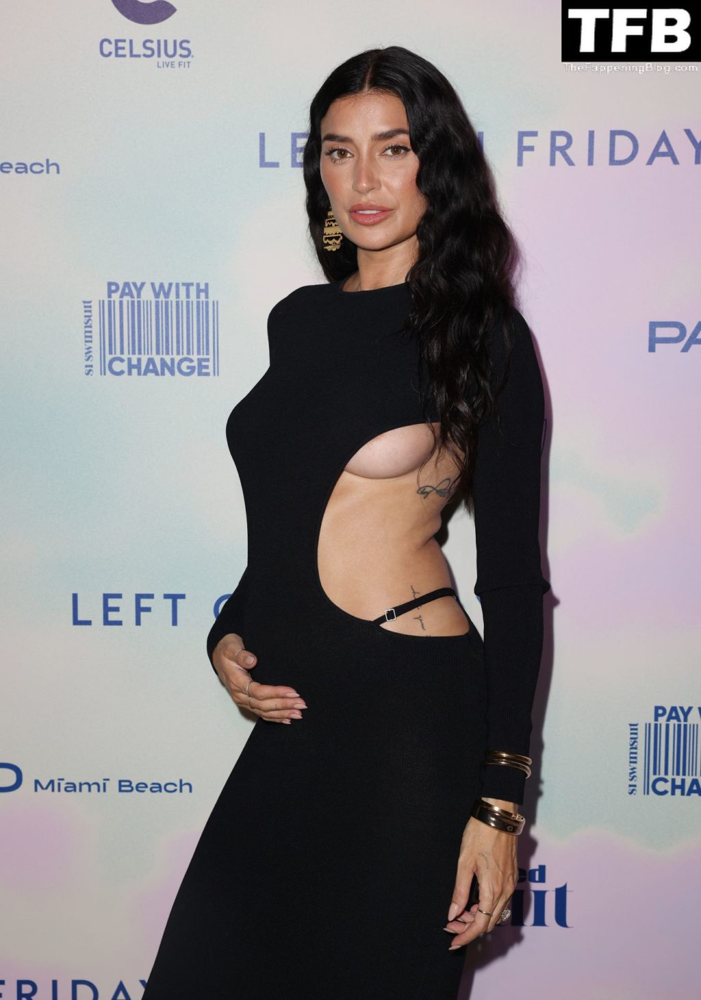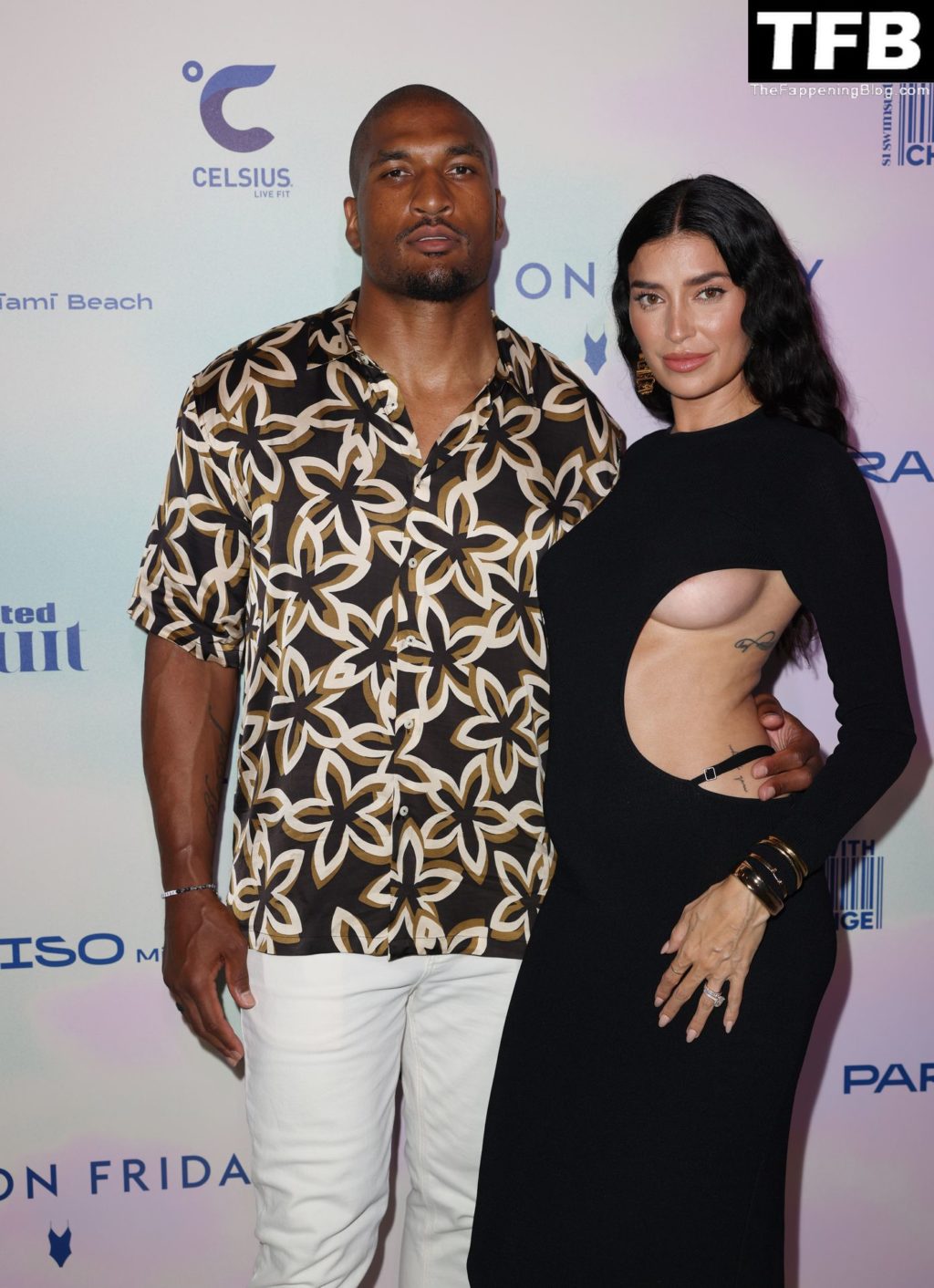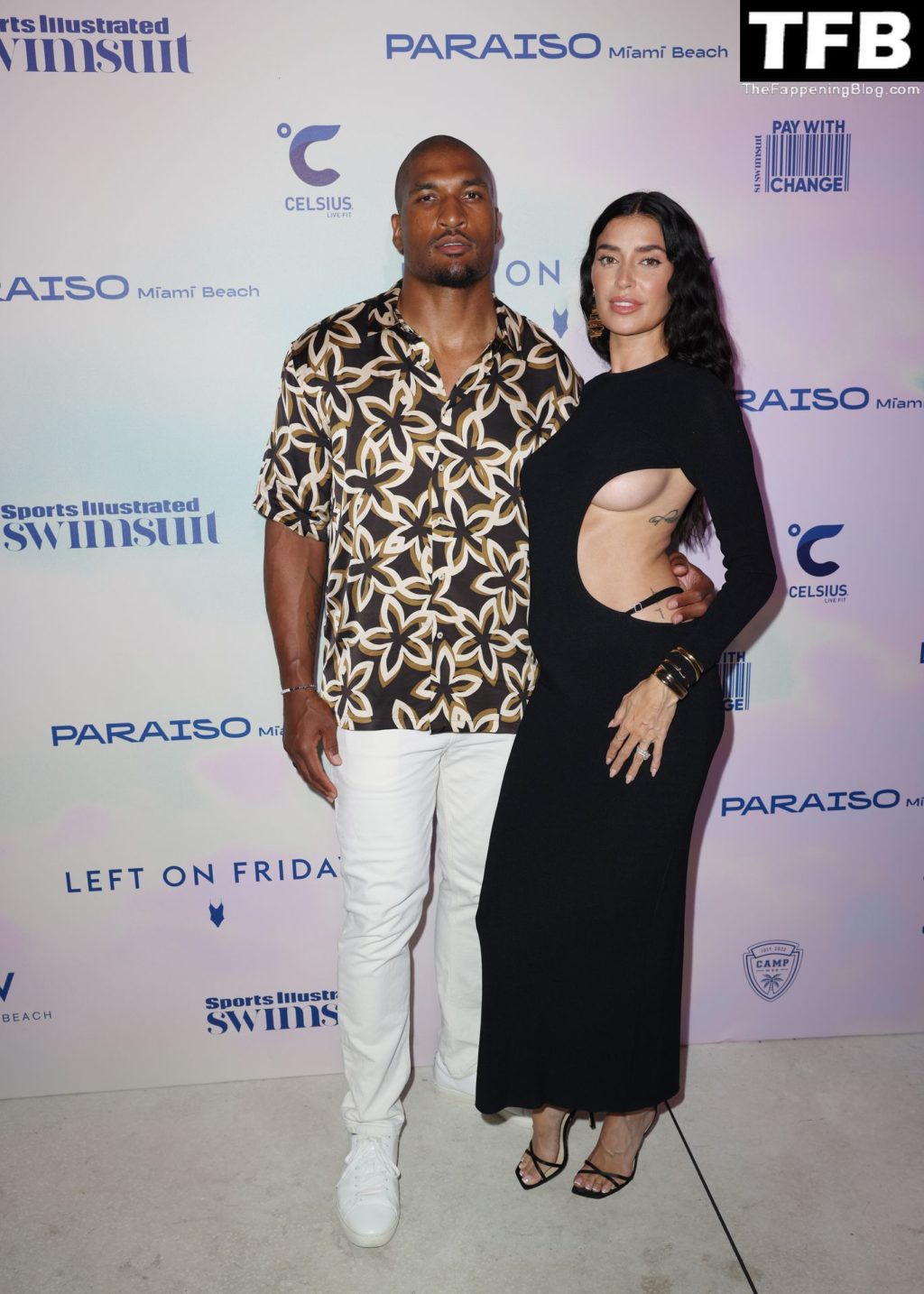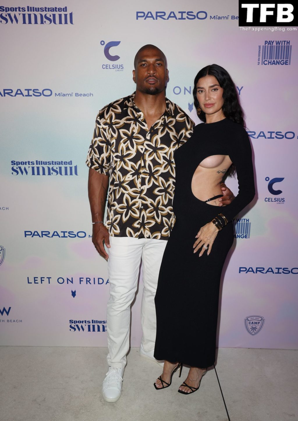 Modelo sem sutiã Nicole Williams English chega ao desfile de moda praia da Sports Illustrated durante o Paraiso Miami Beach em Miami Beach, Flórida, 16/07/2022.