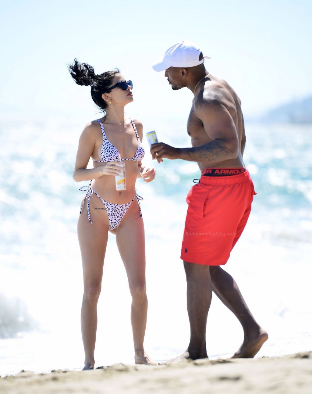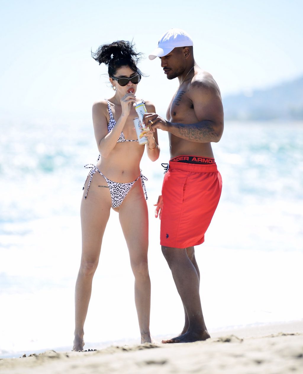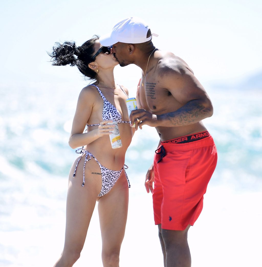 WAGS estrela Nicole Williams arrasa com um biquíni preto e branco mínimo enquanto demonstra muito carinho com seu marido Larry English durante um dia na praia em Malibu, 20/06/2020.