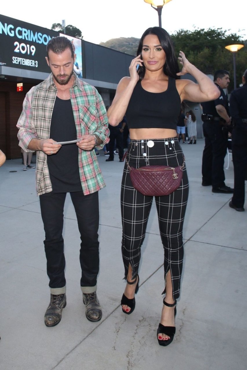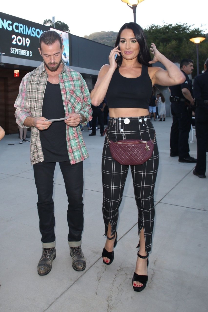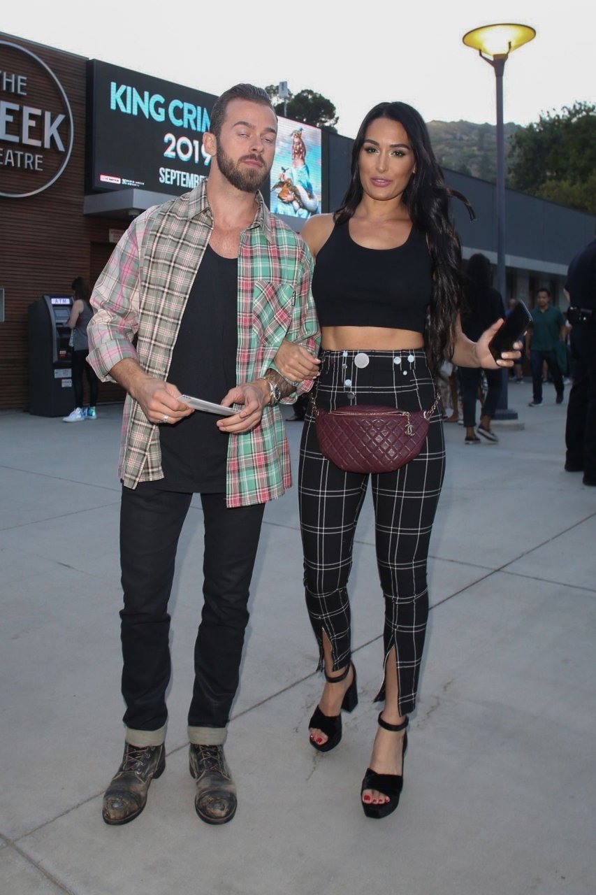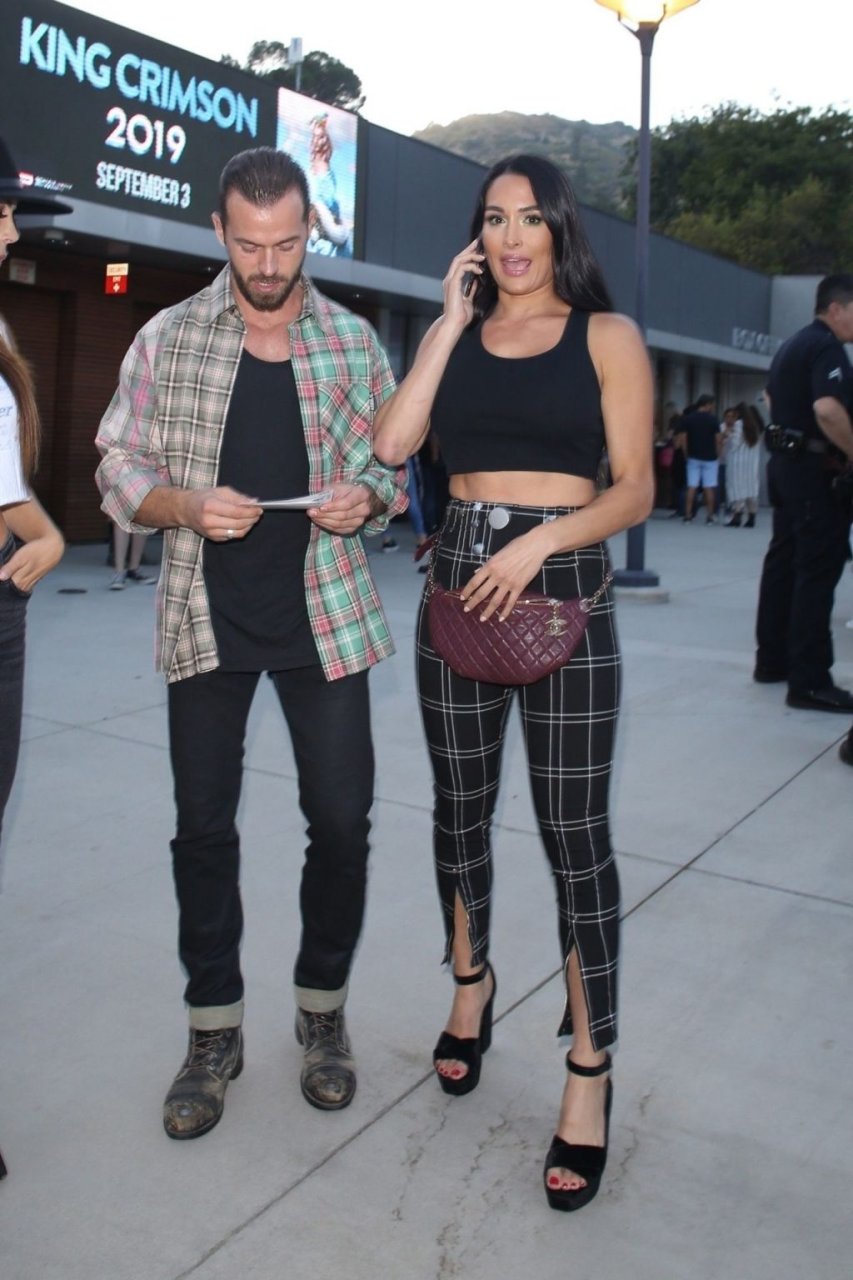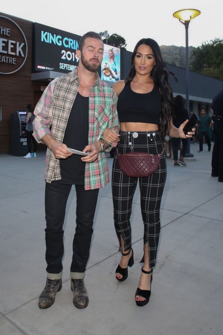 Nikki Bella e Artem Chigvintsev posam para fotos ao chegarem ao Greek Theater para o show de Billie Eilish em Los Angeles, 11/07/2019.