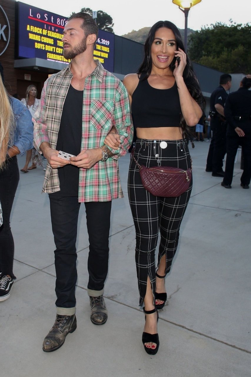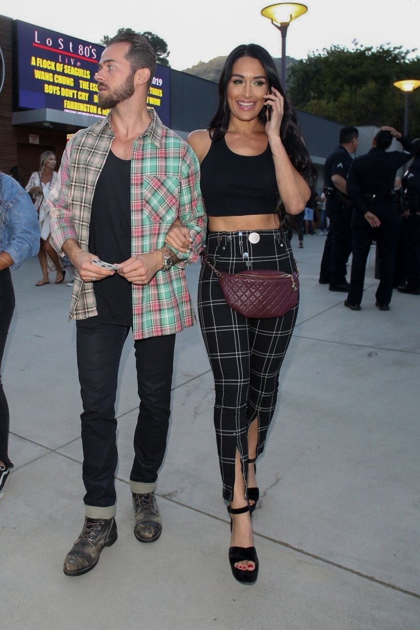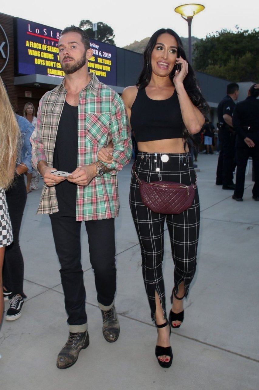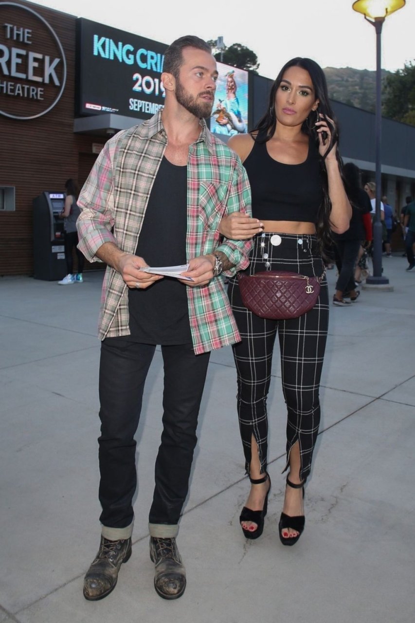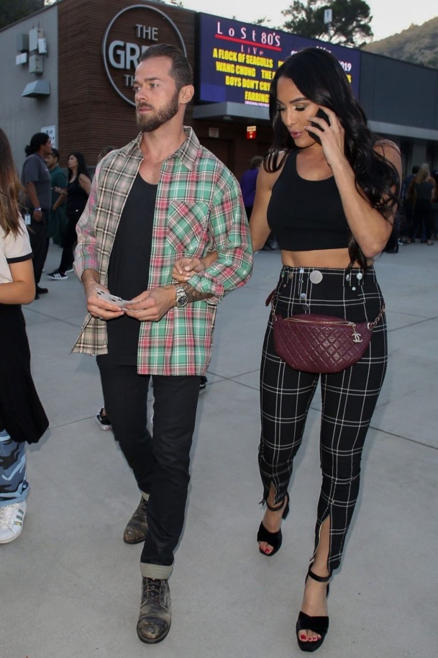 Nikki Bella e Artem Chigvintsev posam para fotos ao chegarem ao Greek Theater para o show de Billie Eilish em Los Angeles, 11/07/2019.