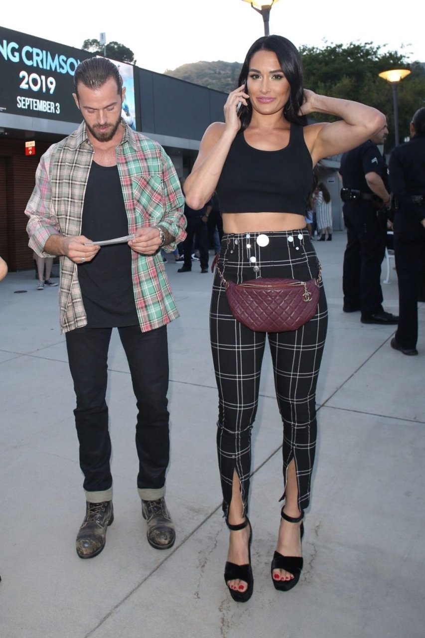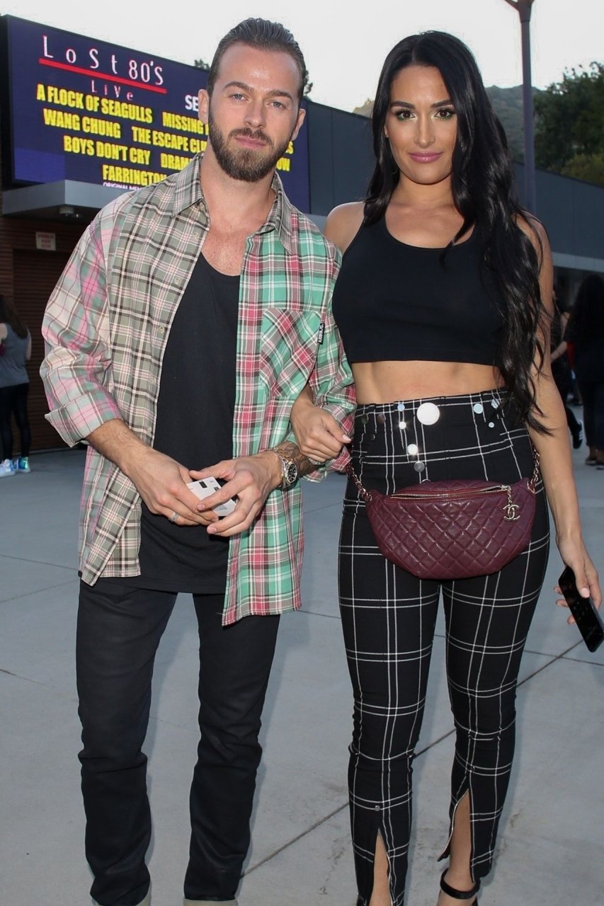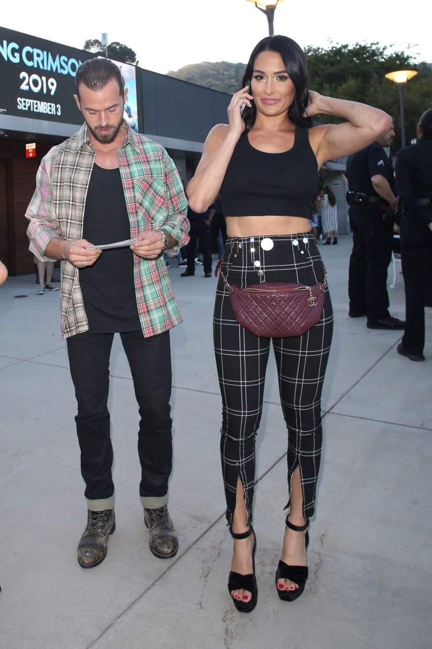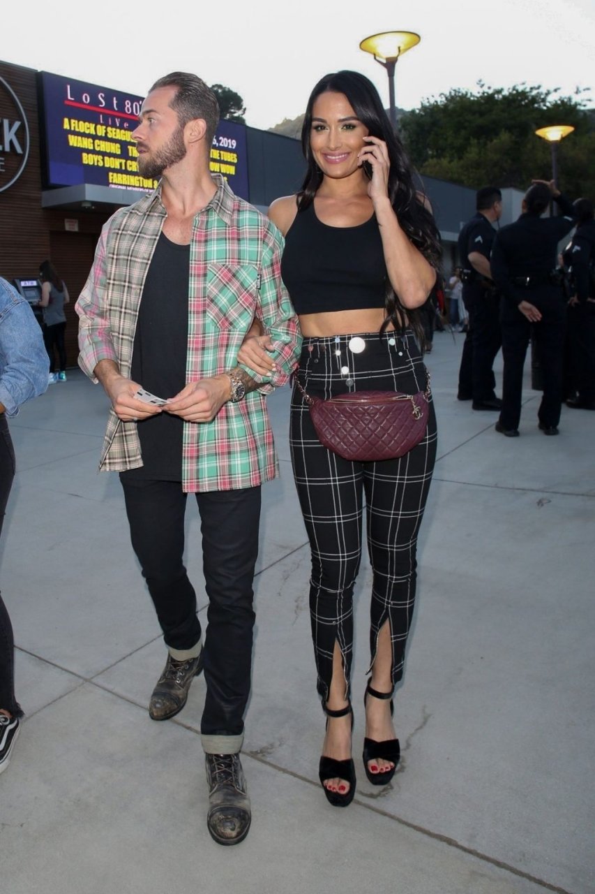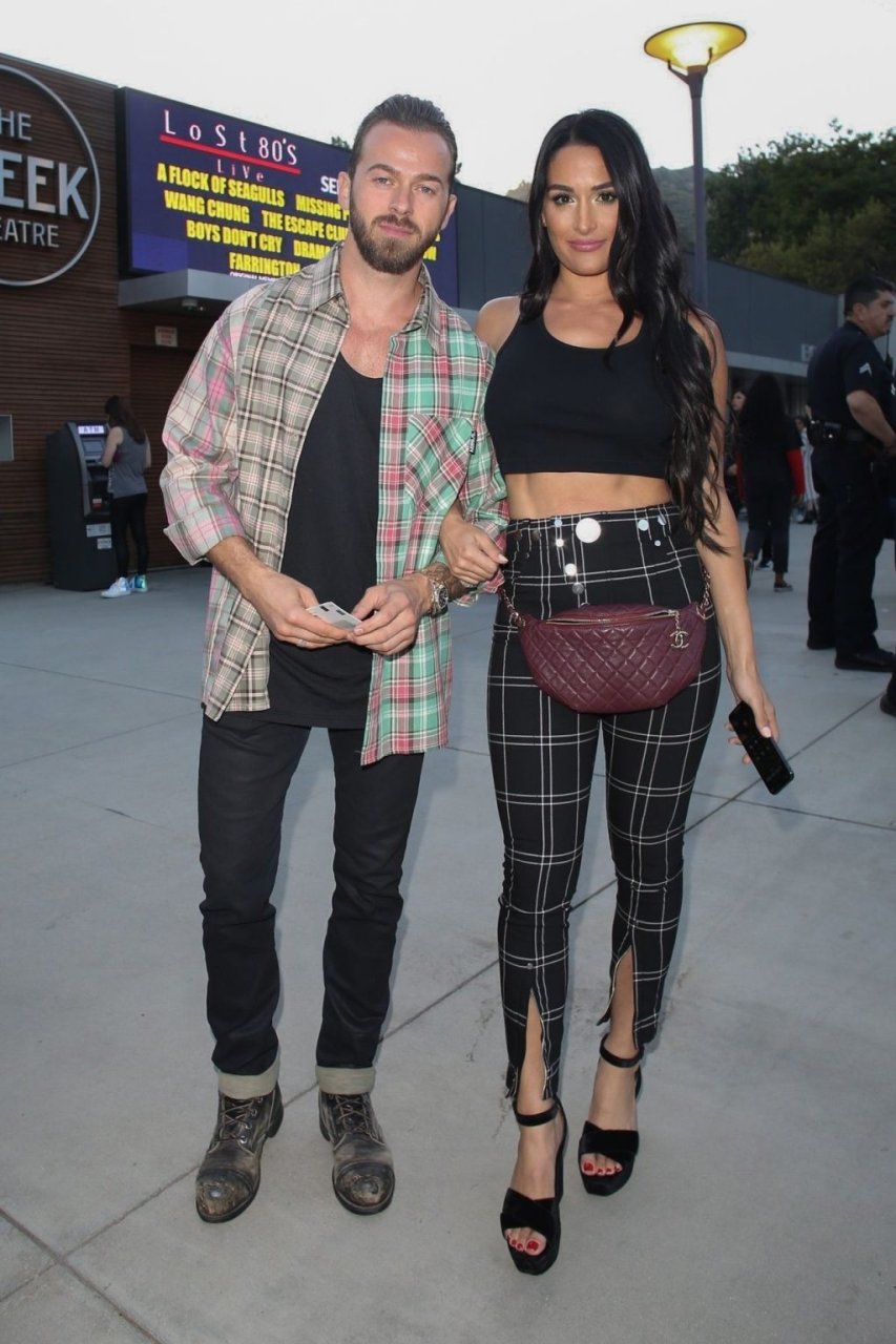 Nikki Bella e Artem Chigvintsev posam para fotos ao chegarem ao Greek Theater para o show de Billie Eilish em Los Angeles, 11/07/2019.