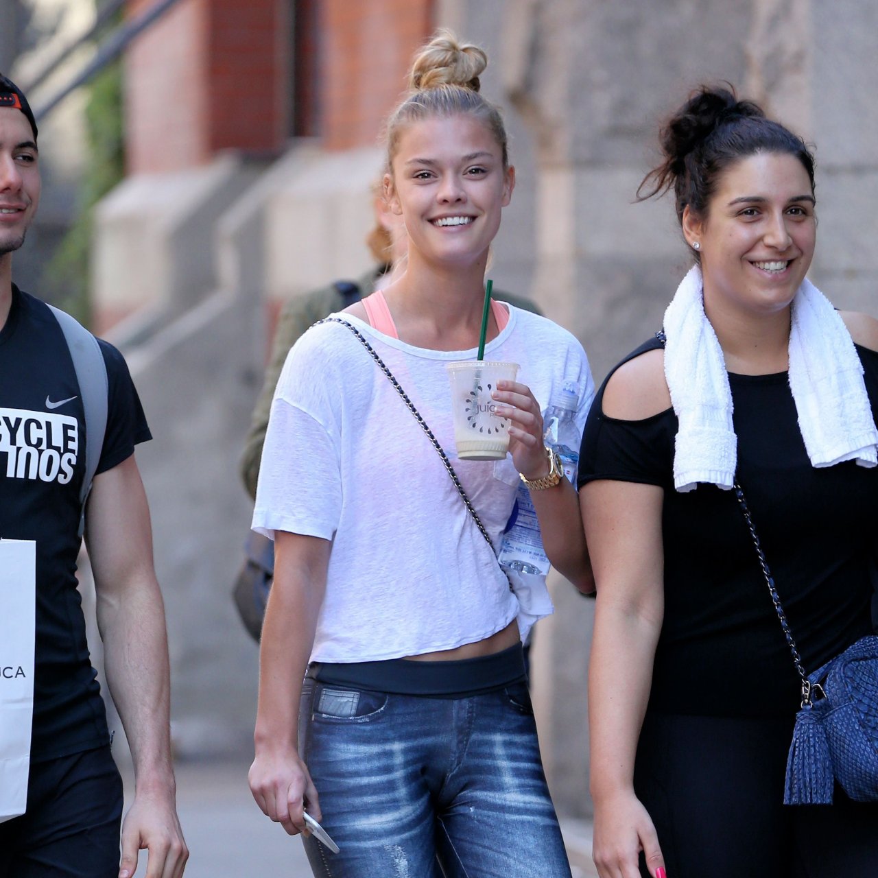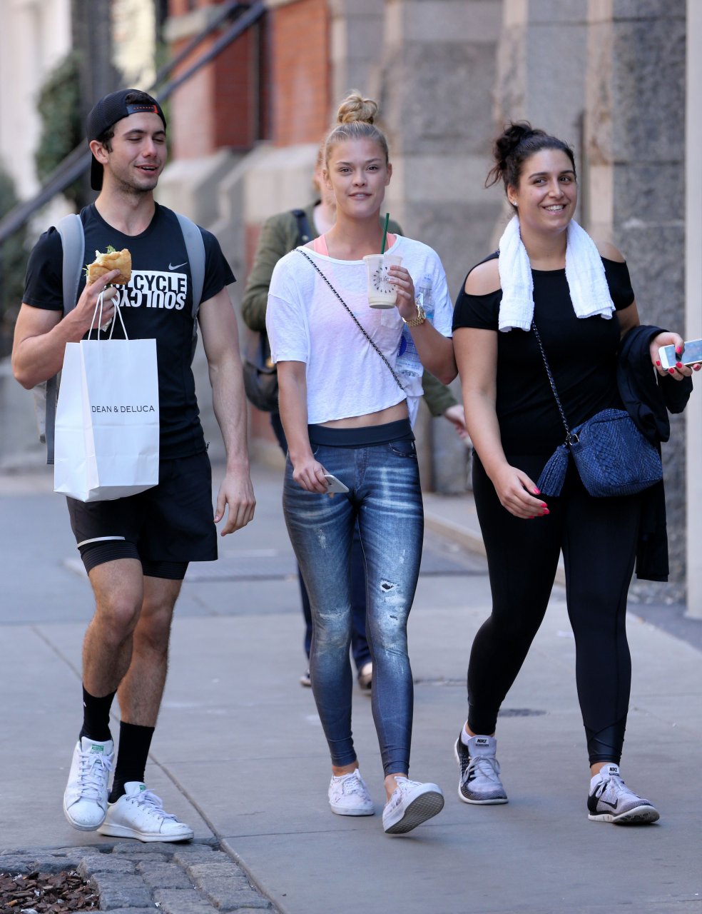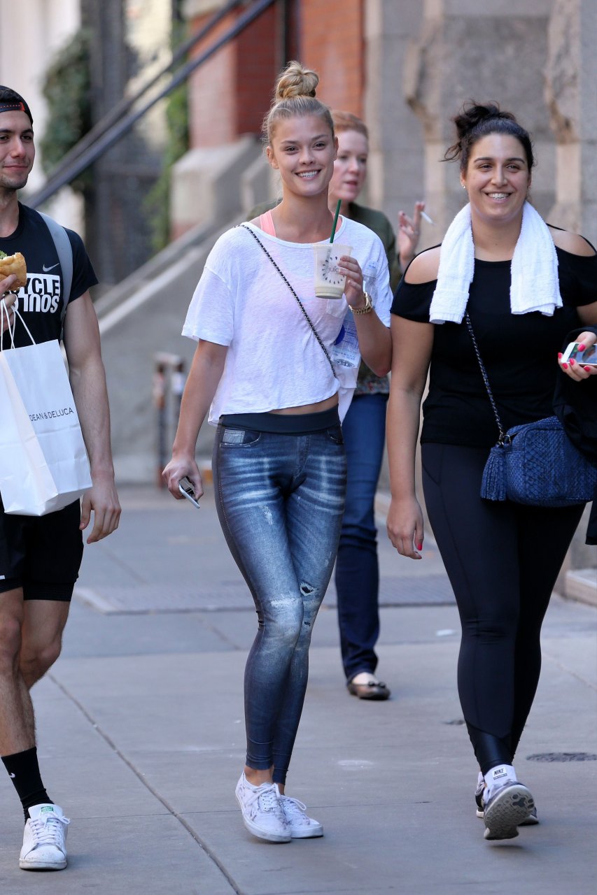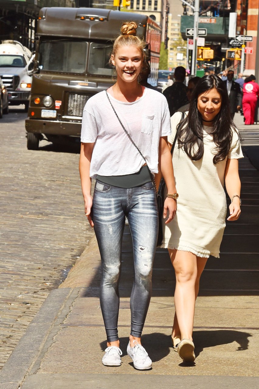 Nina Agdal usando leggings é vista em Soho, Nova York, 19/04/2016. Estilo legal! Nina Agdal é uma modelo dinamarquesa de moda. Altura: 176 cm. Idade 23 (26 de março de 1992).