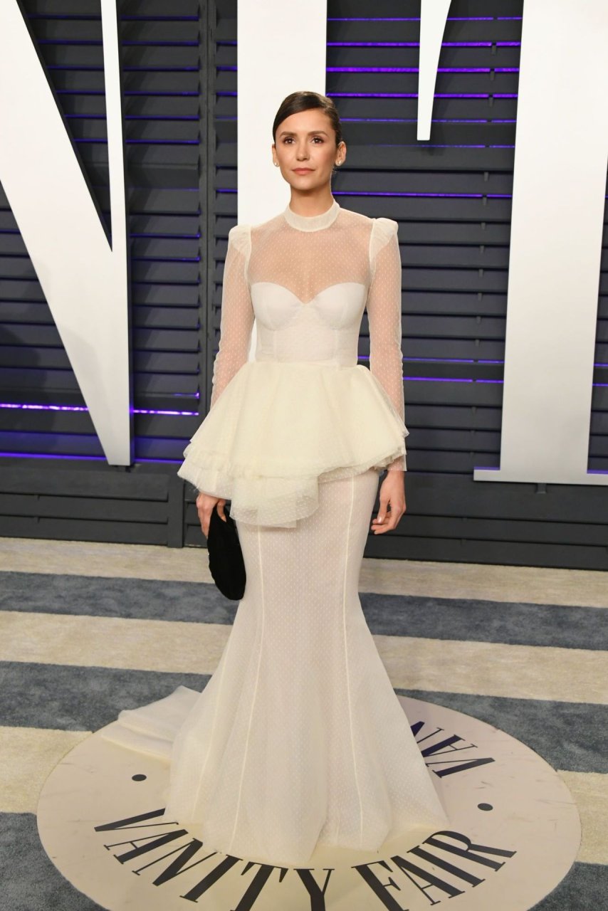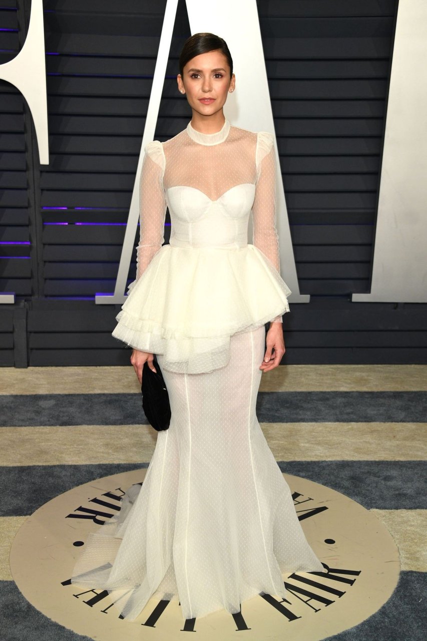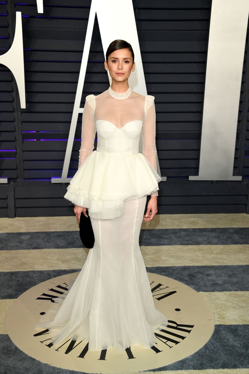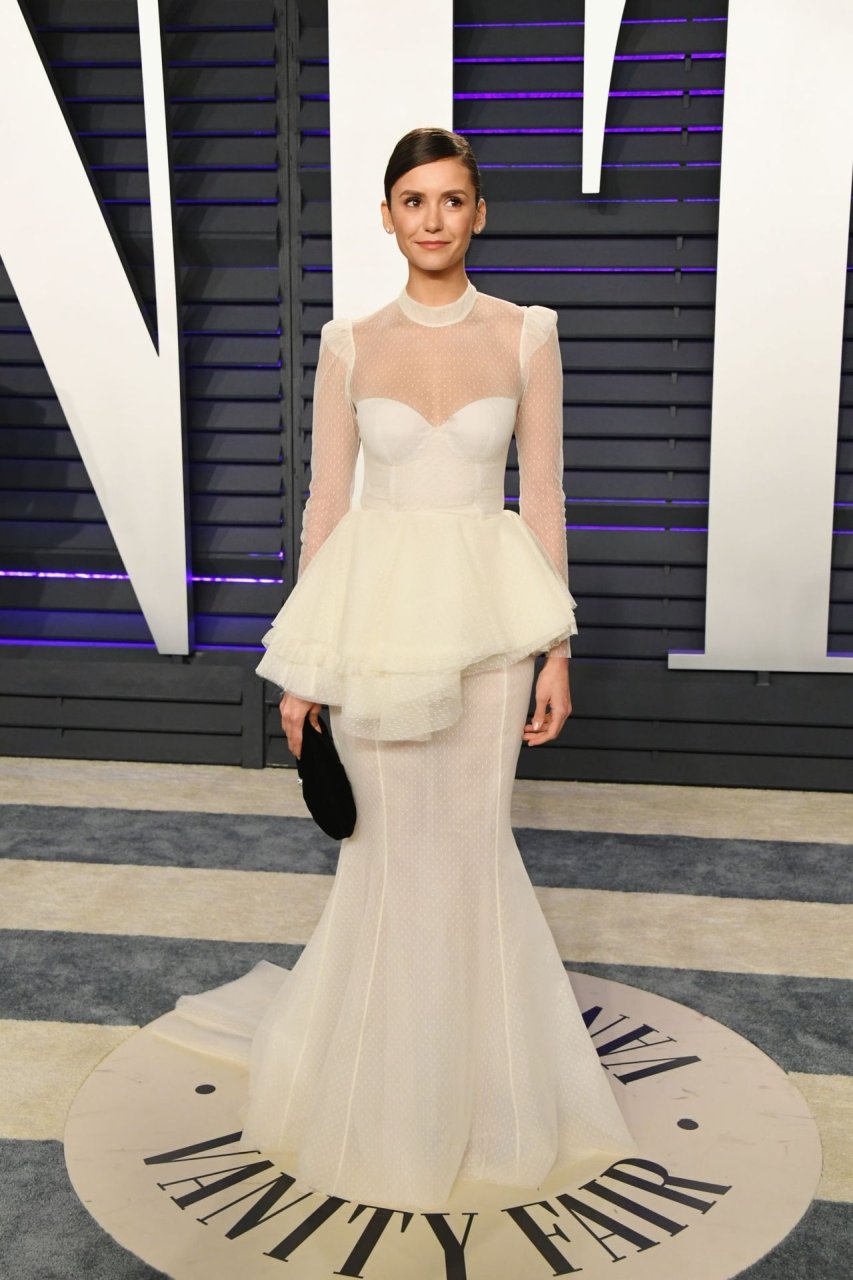 Nina Dobrev participa da Festa do Oscar Vanity Fair 2019 em Beverly Hills, 24/02/2019. A atriz canadense de 30 anos apostou na cor branca do vestido.
