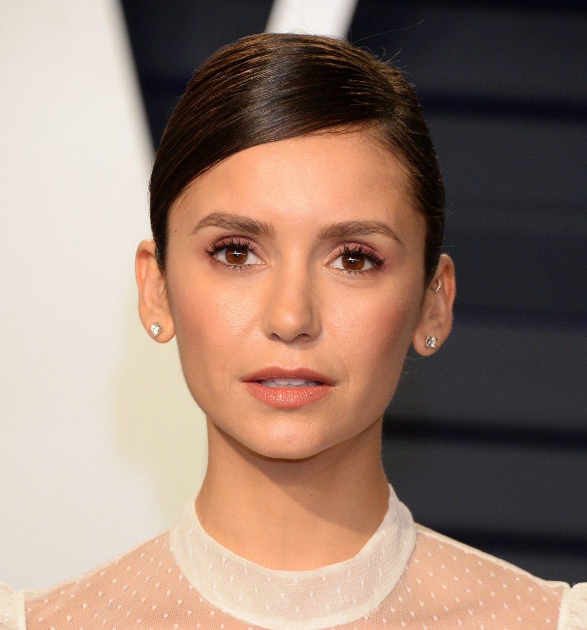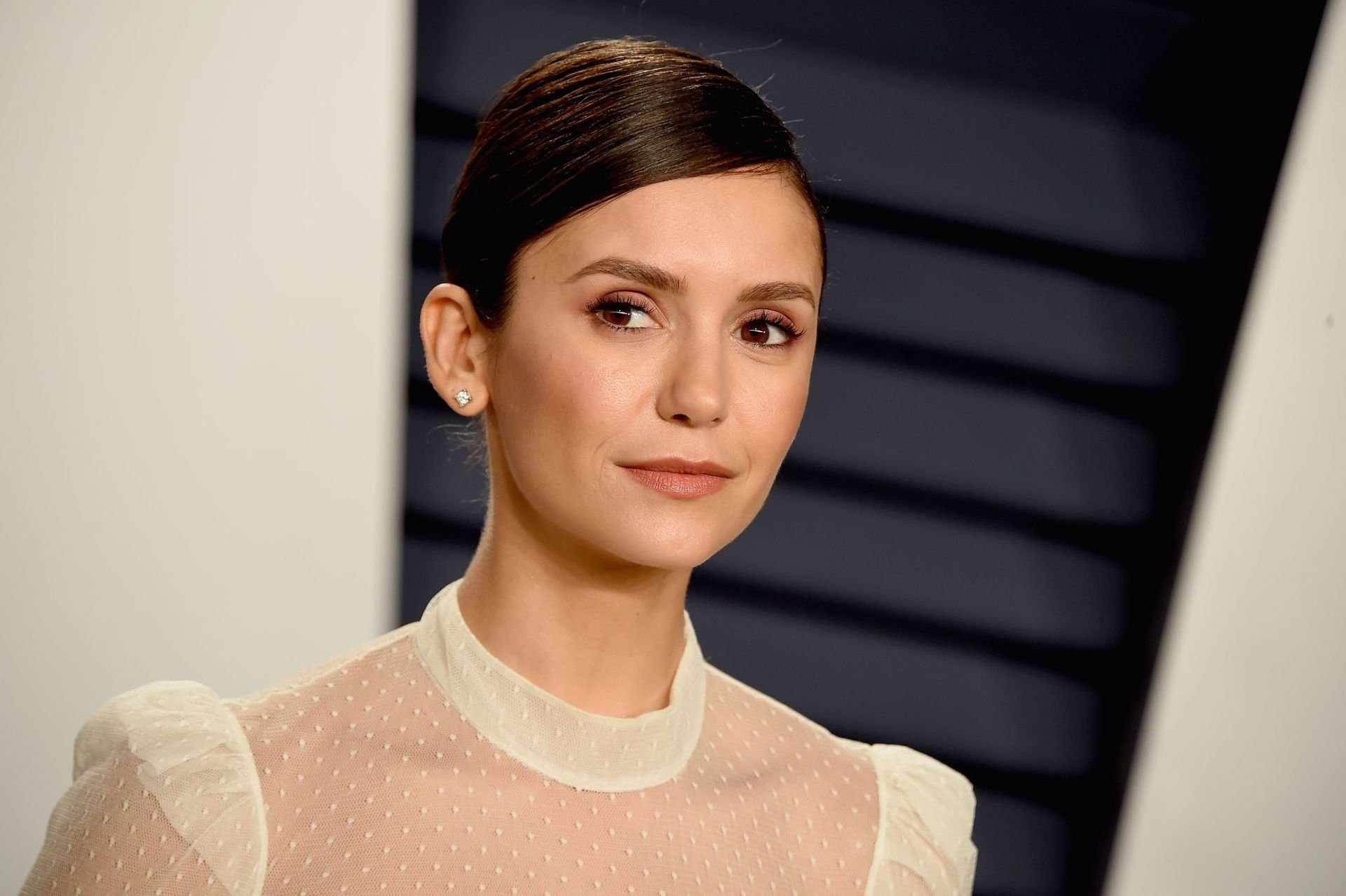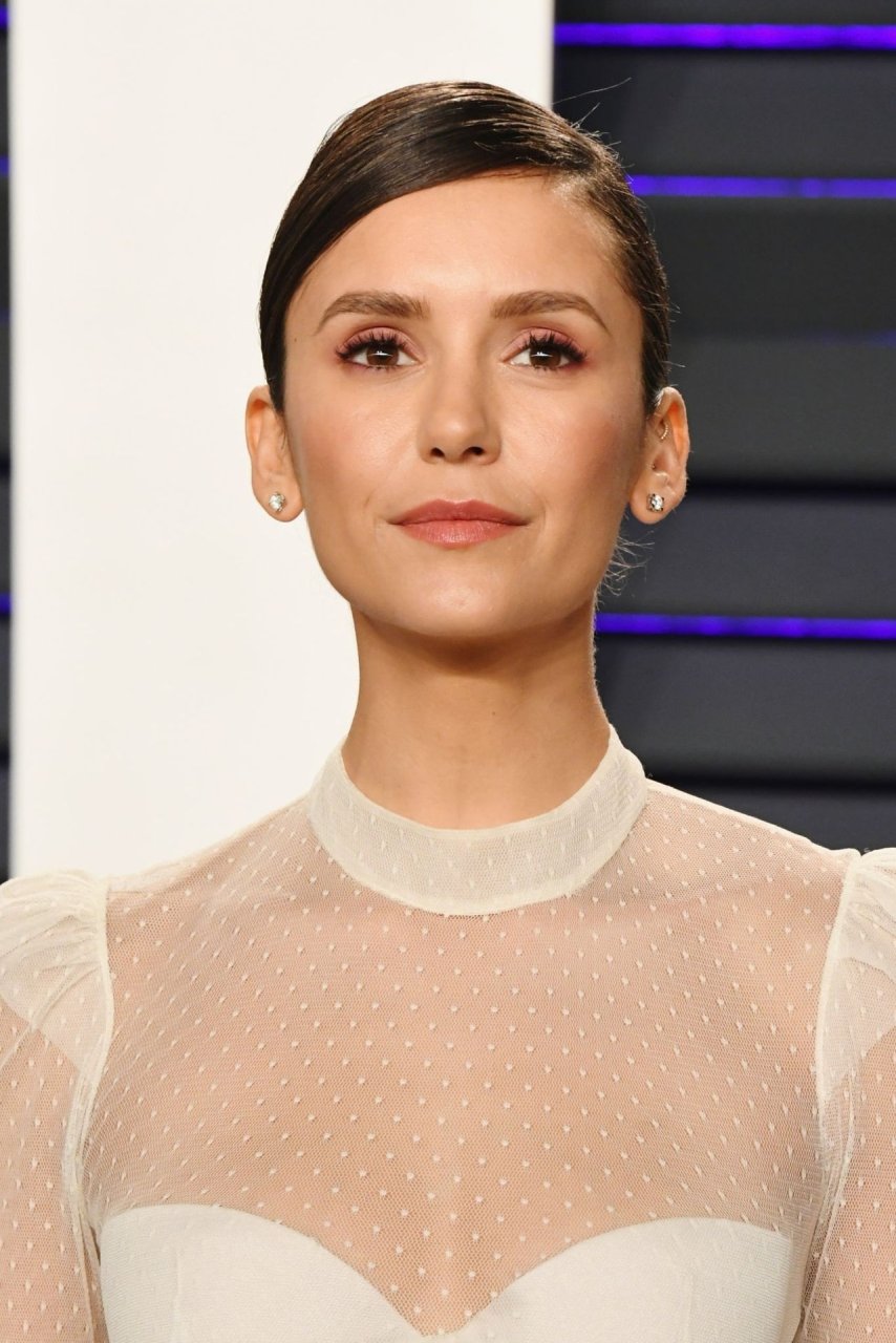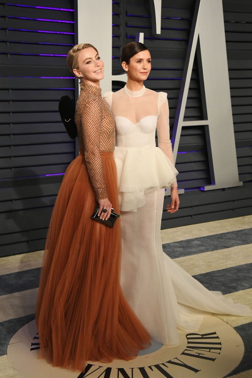 Nina Dobrev participa da Festa do Oscar Vanity Fair 2019 em Beverly Hills, 24/02/2019. A atriz canadense de 30 anos apostou na cor branca do vestido.