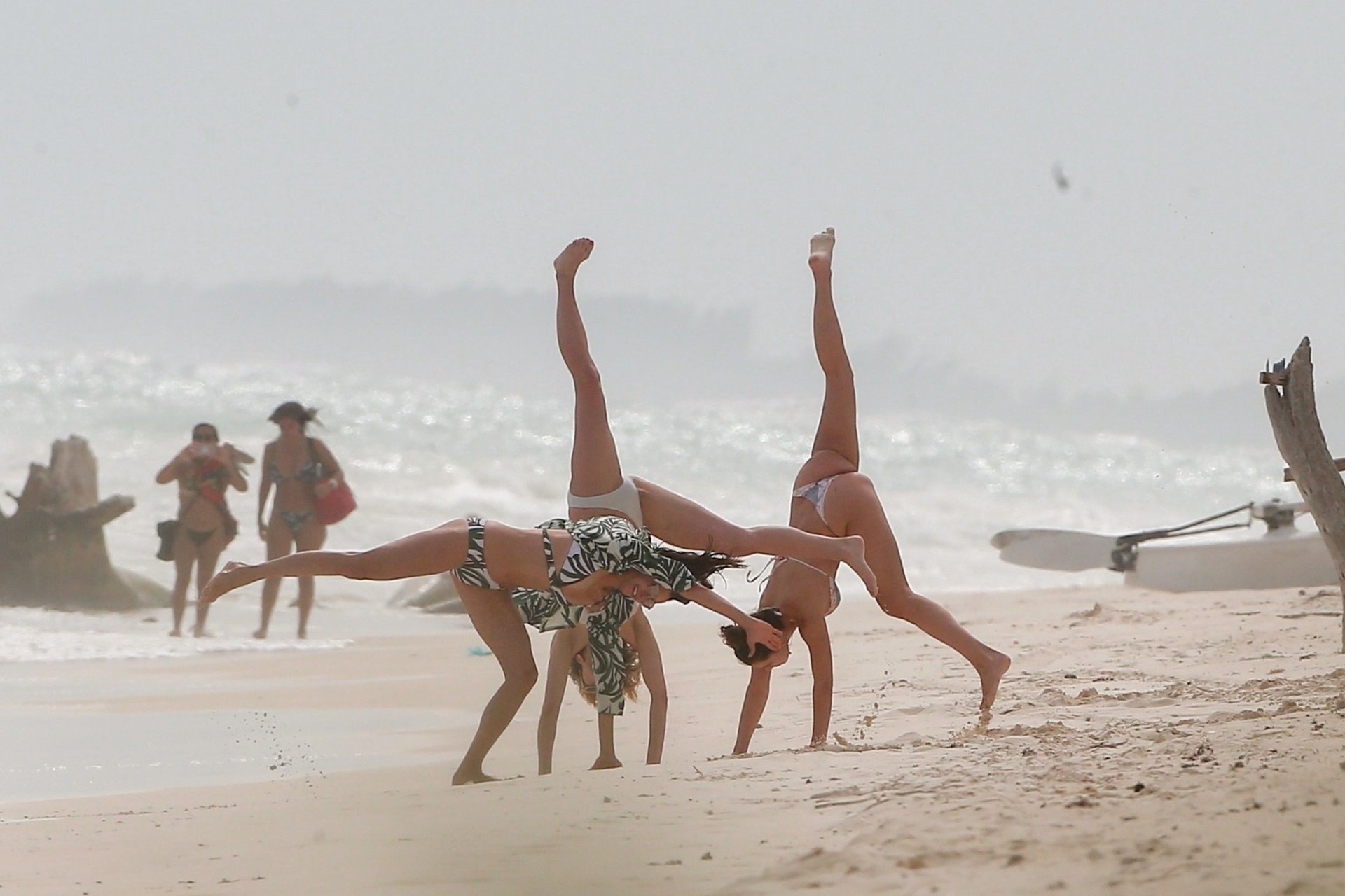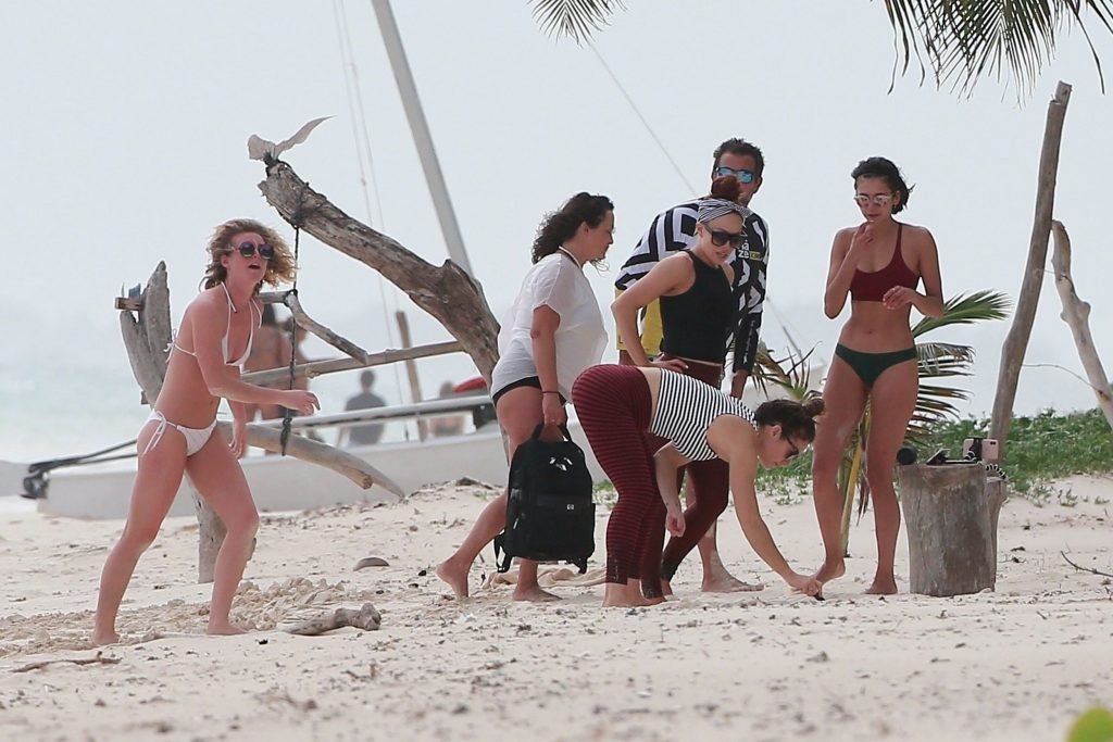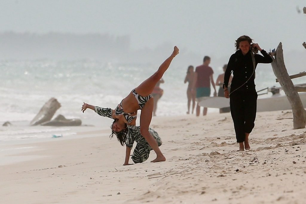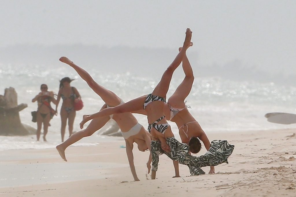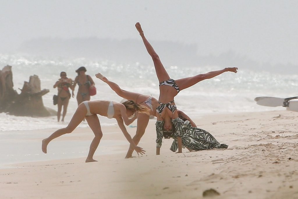 A atriz búlgaro-canadense faz yoga e cambalhotas na praia na companhia de sua família, amigos e Kayla Ewell.