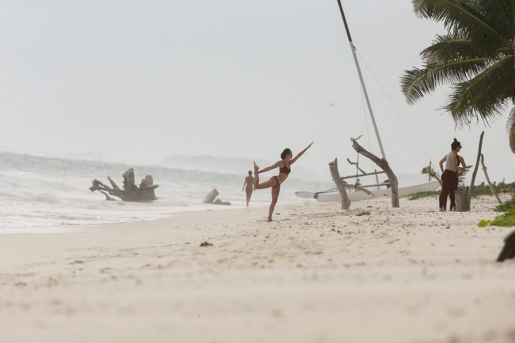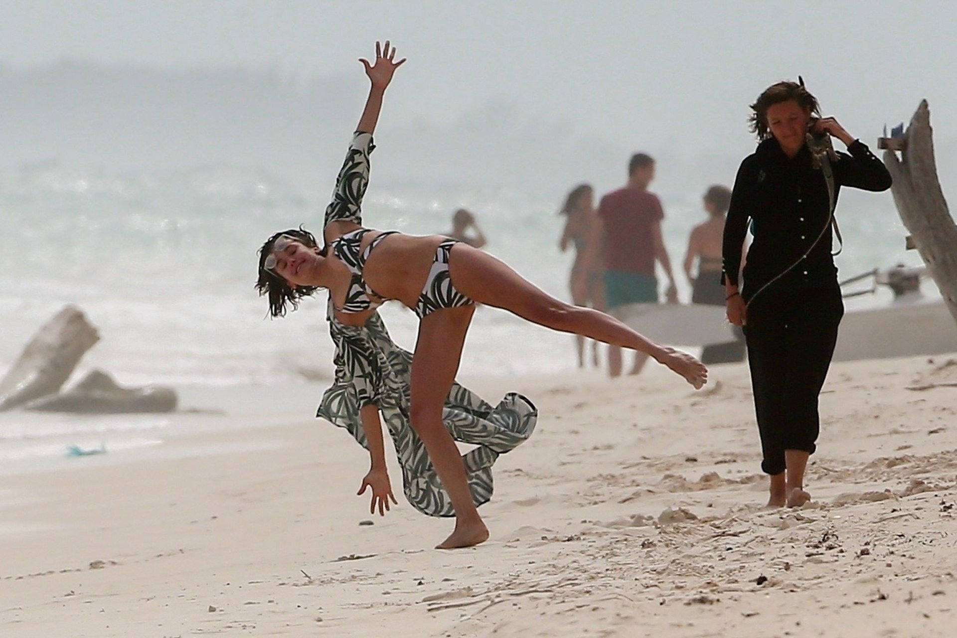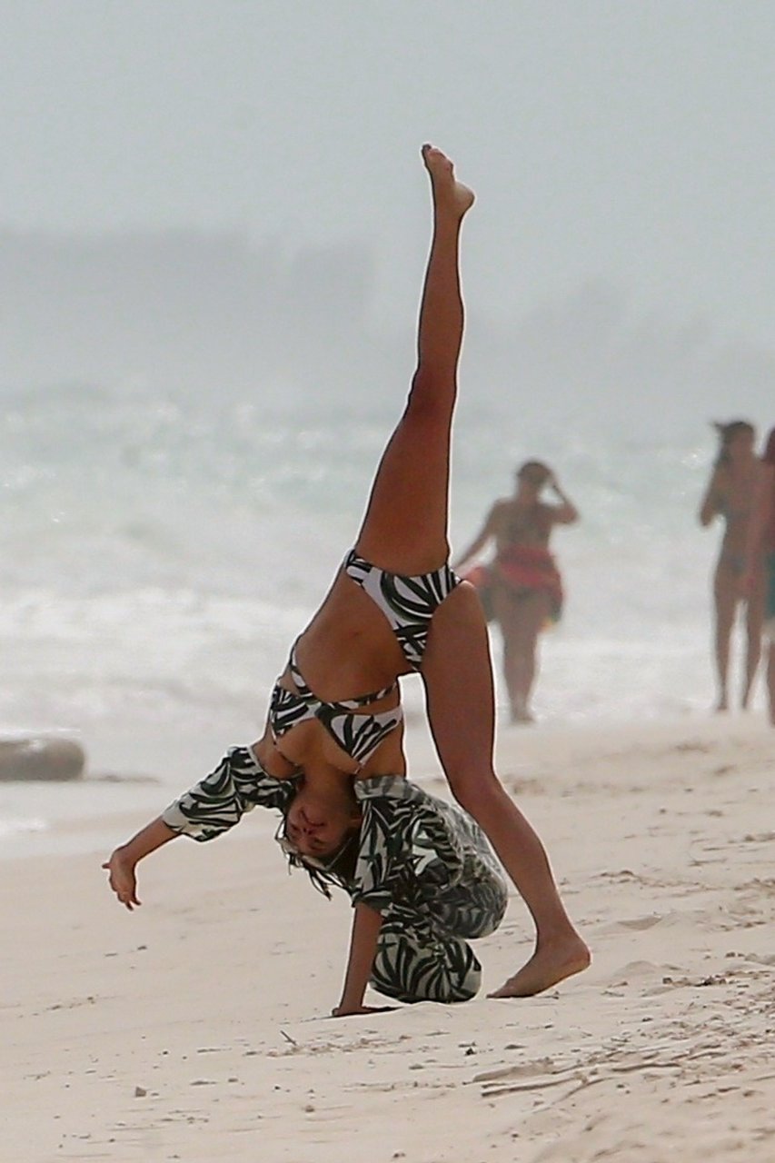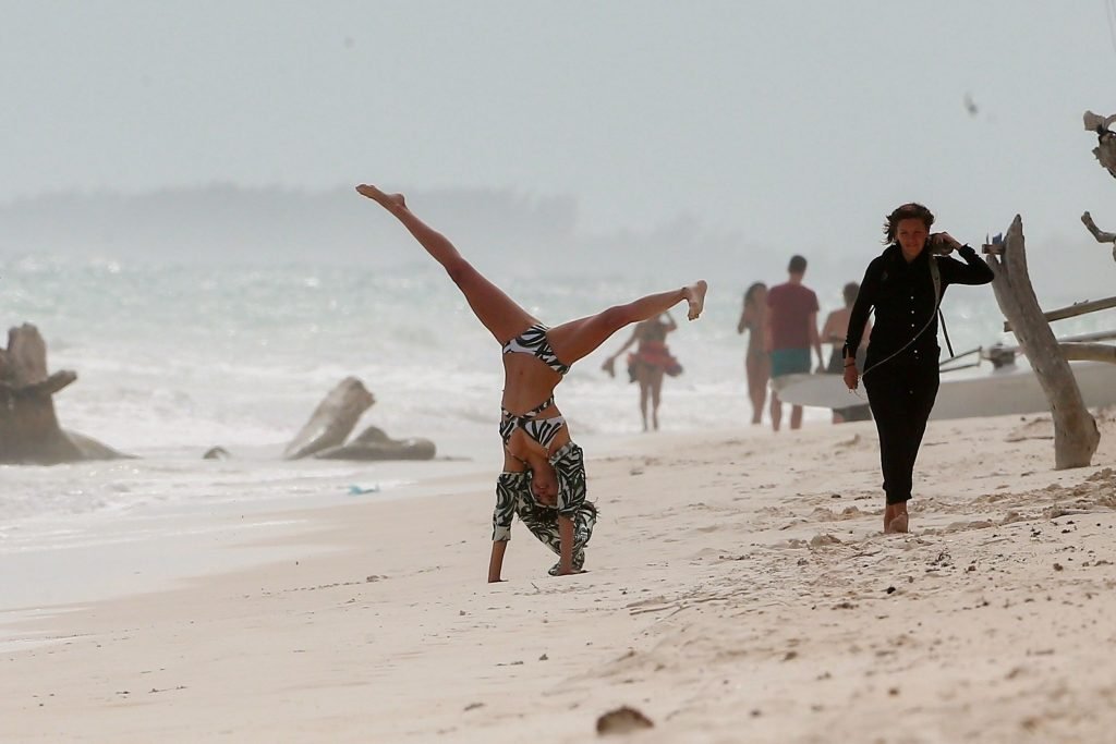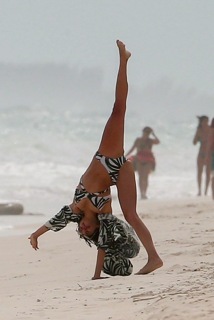 A atriz búlgaro-canadense faz yoga e cambalhotas na praia na companhia de sua família, amigos e Kayla Ewell.