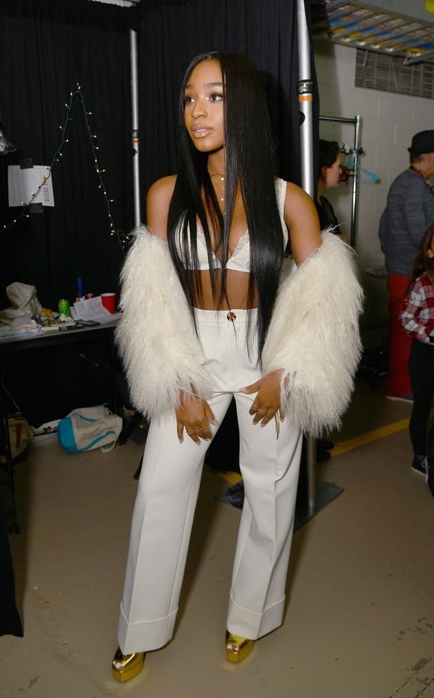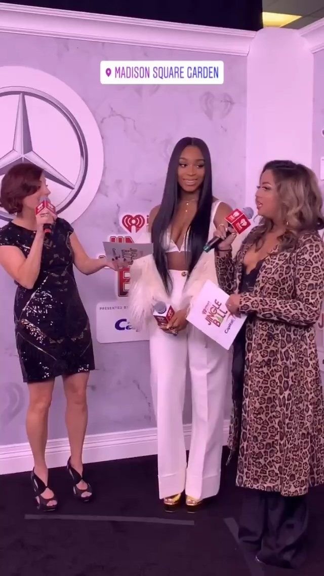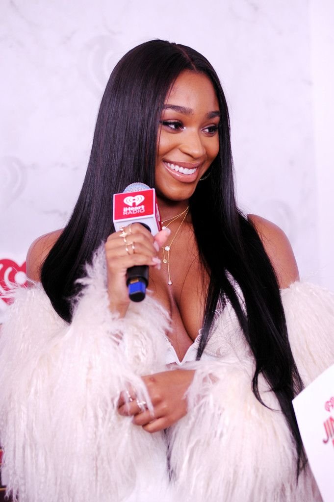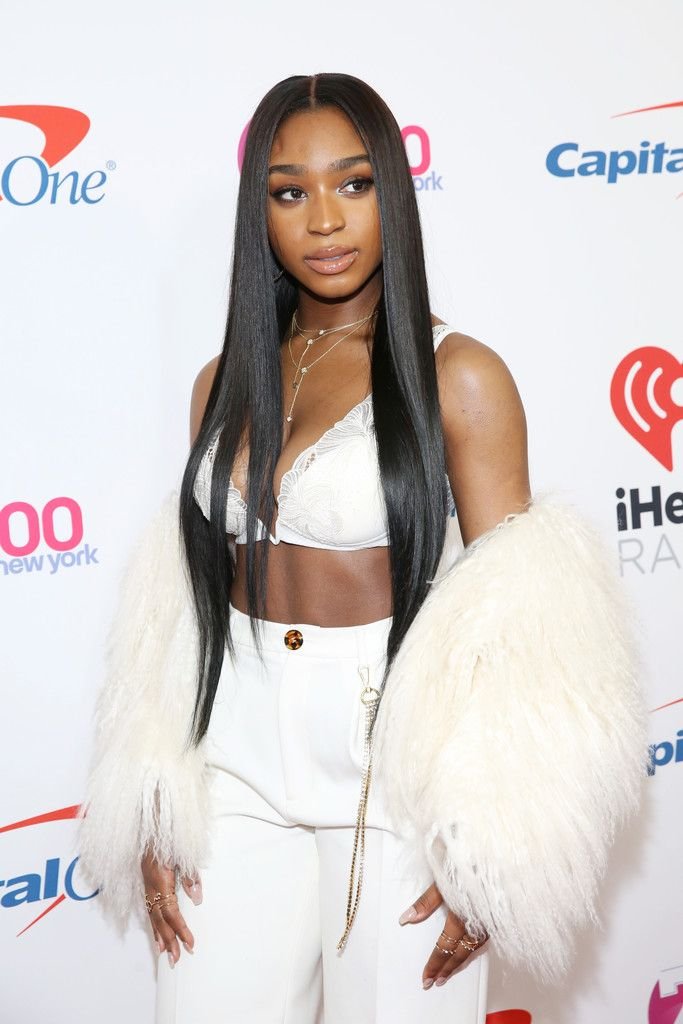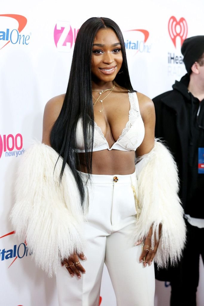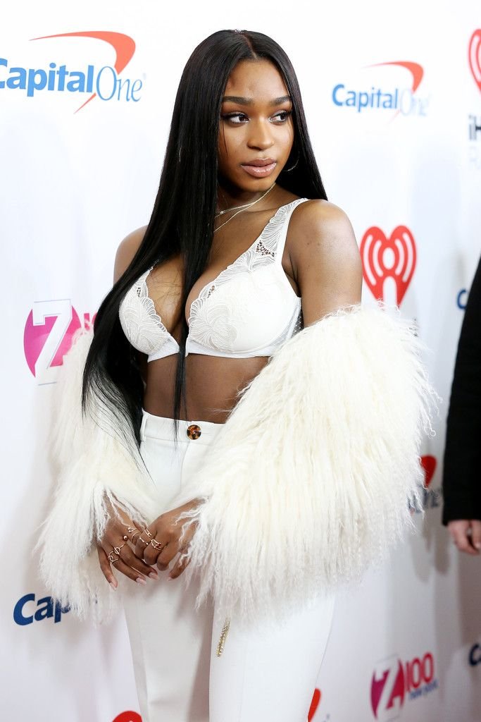 Normani Kordei Hamilton mostrou seu decote profundo usando uma blusa branca no Jingle Ball 2018 da Z100 em Nova York, 07/12/2018. Normani Kordei Hamilton (também conhecida como Normani) é uma cantora, dançarina, modelo, personalidade de televisão e estrela das redes sociais americana de 22 anos.