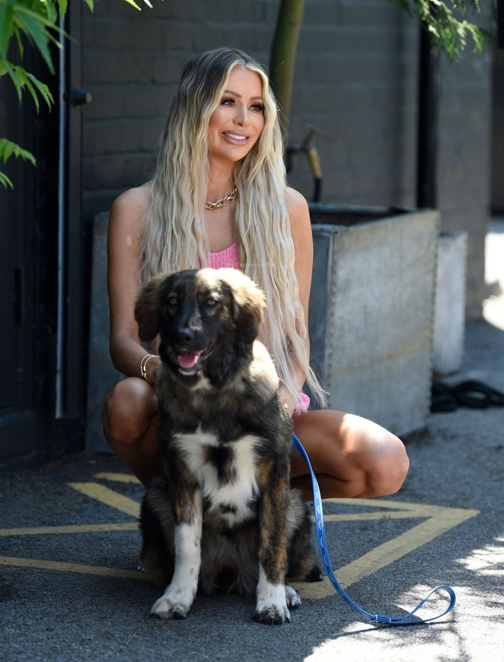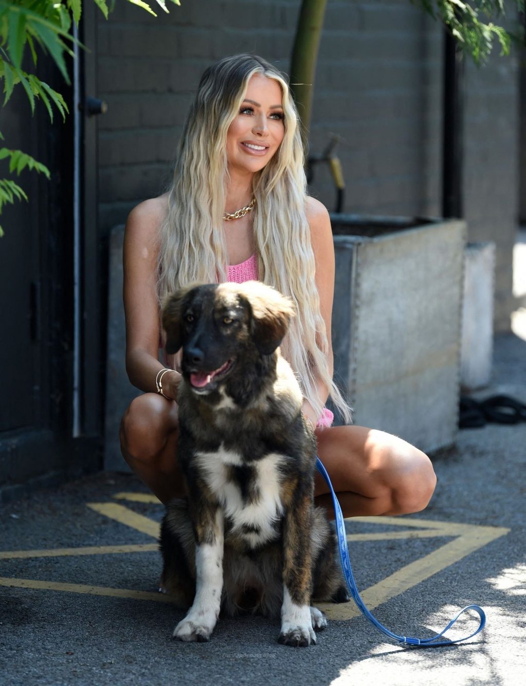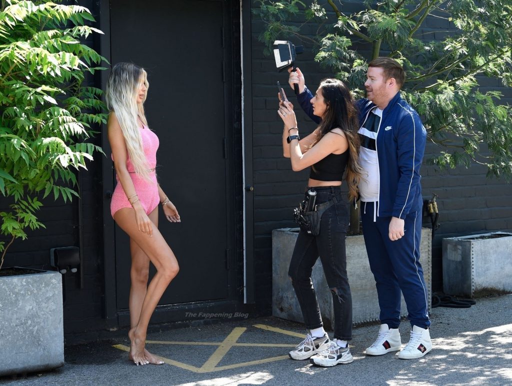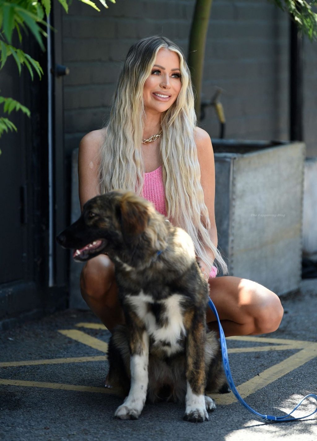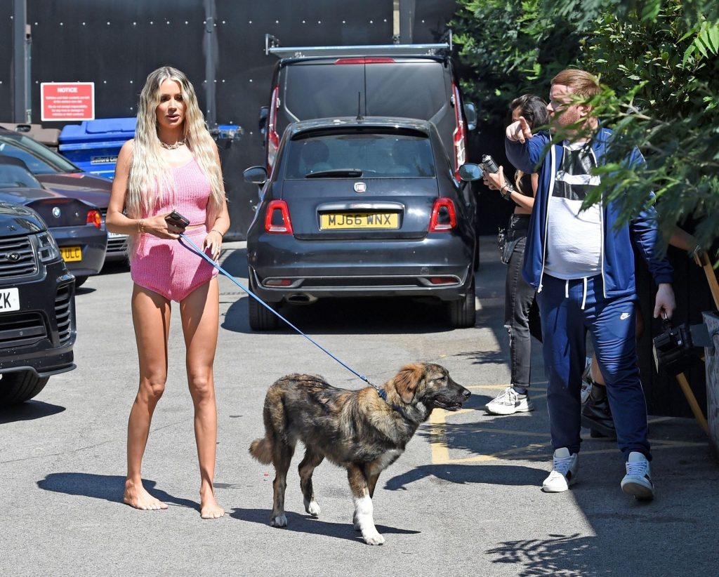 Olivia Attwood foi fotografada em um ensaio usando seu sexy conjunto rosa combinando de top e shorts. A estrela de Love Island foi vista com seu cachorro de estimação Lola, ambos posando para fotos em um dia quente em Manchester (junho de 2021).