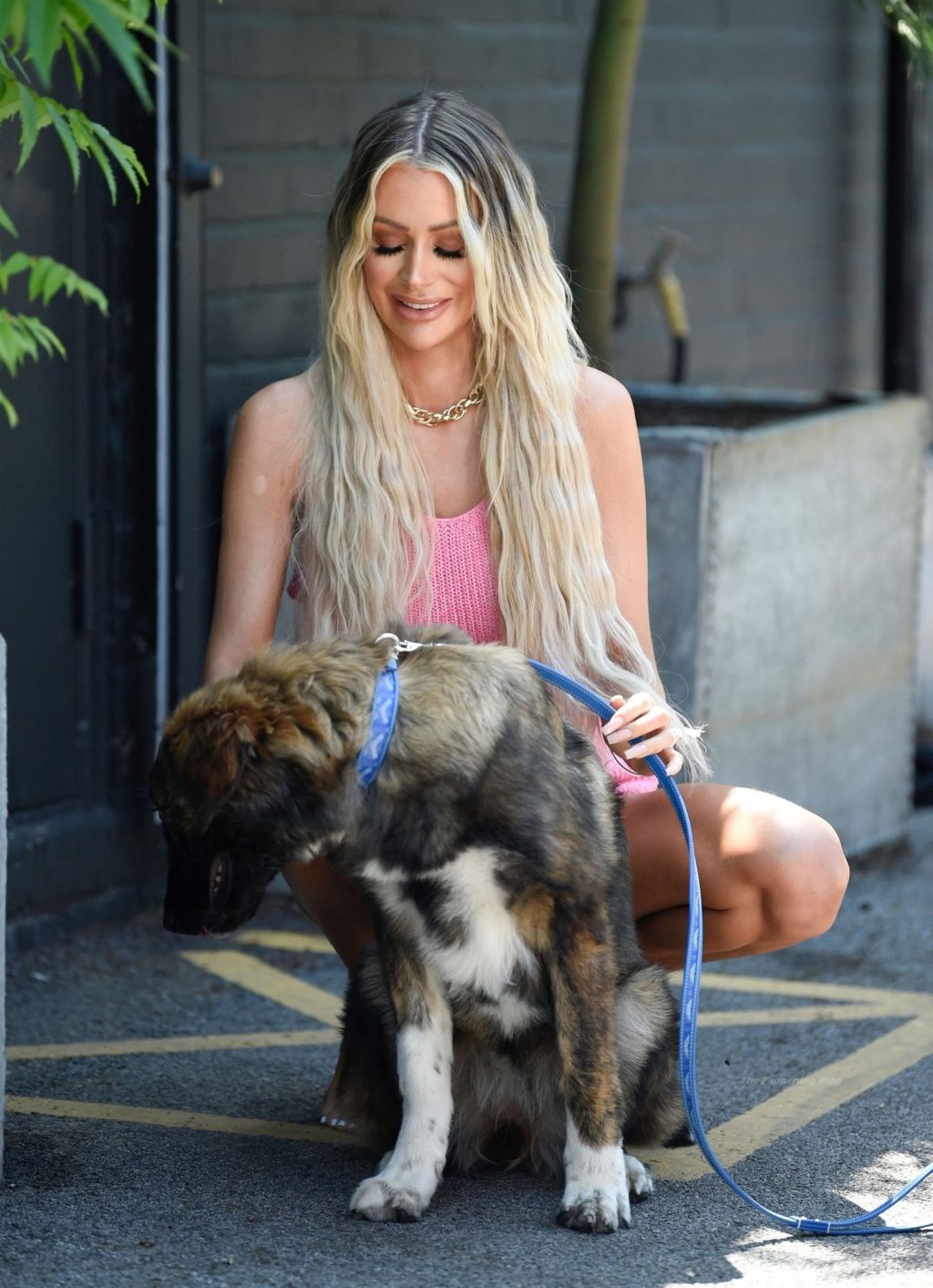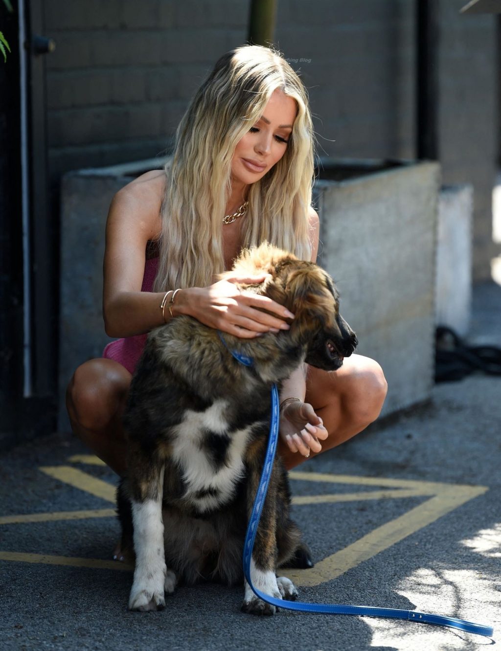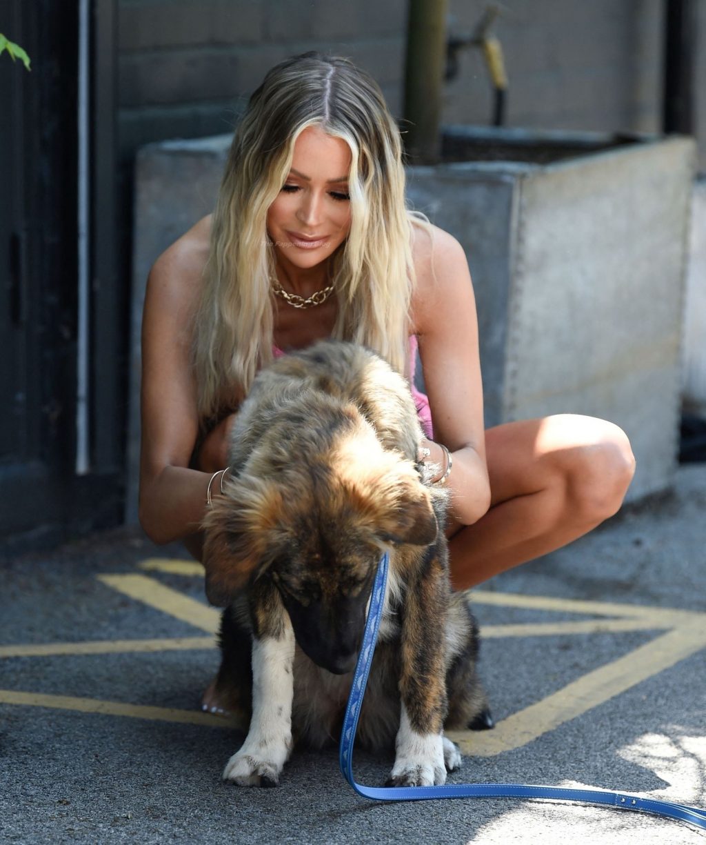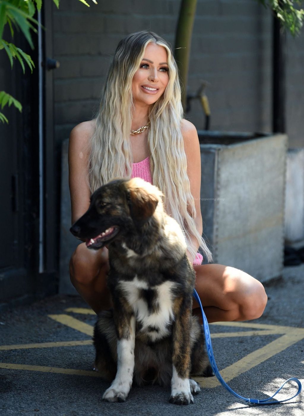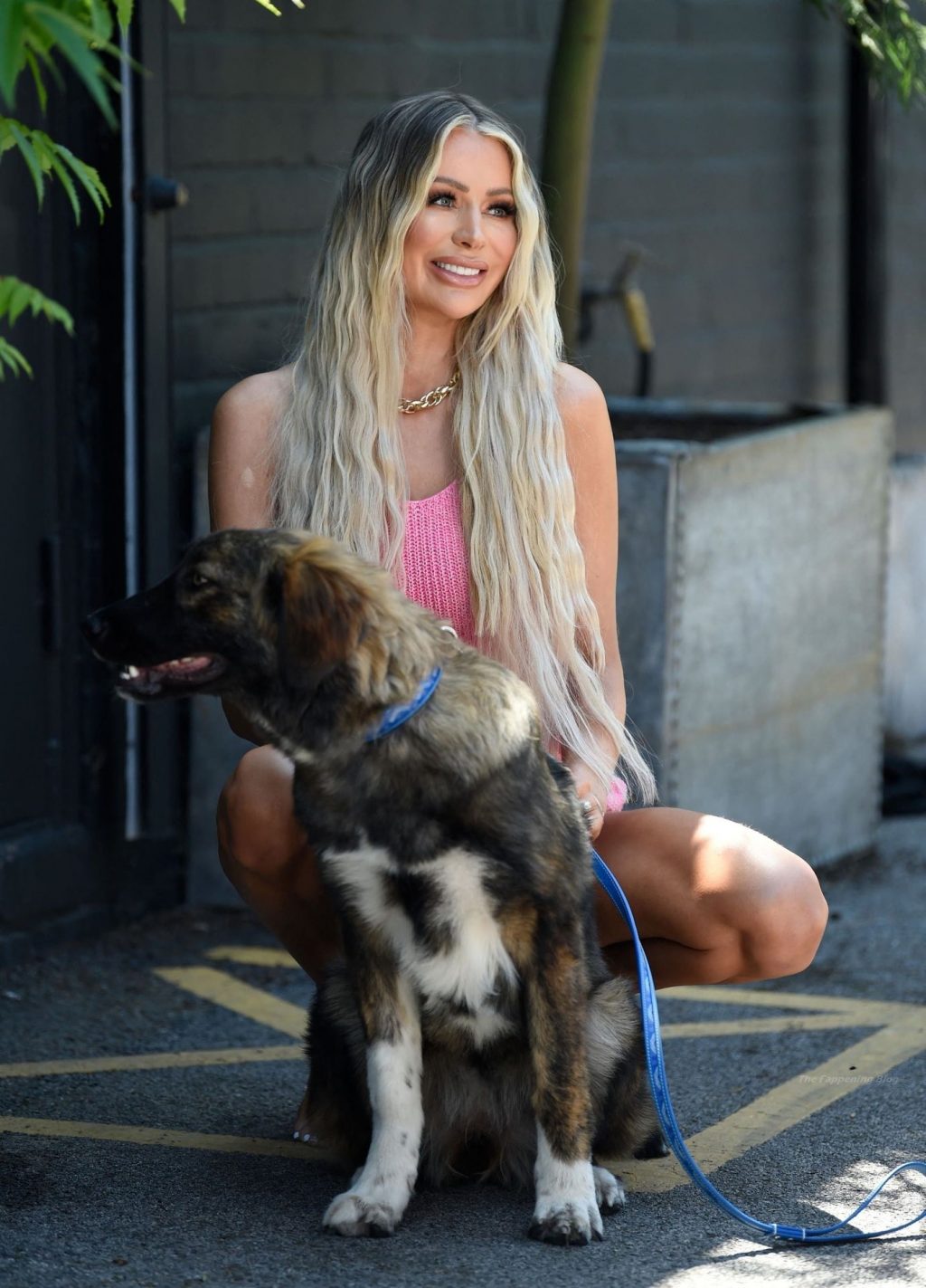 Olivia Attwood foi fotografada em um ensaio usando seu sexy conjunto rosa combinando de top e shorts. A estrela de Love Island foi vista com seu cachorro de estimação Lola, ambos posando para fotos em um dia quente em Manchester (junho de 2021).