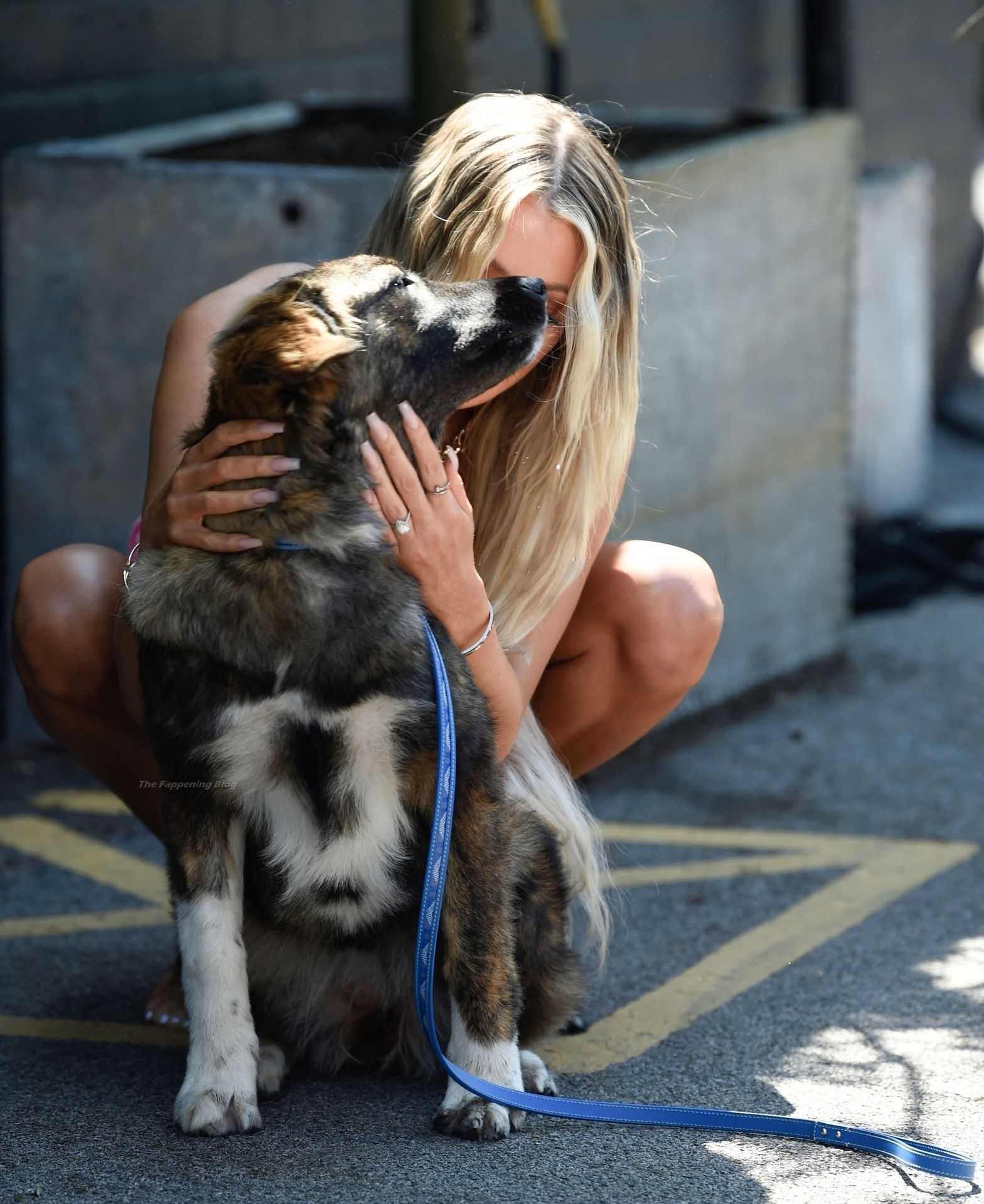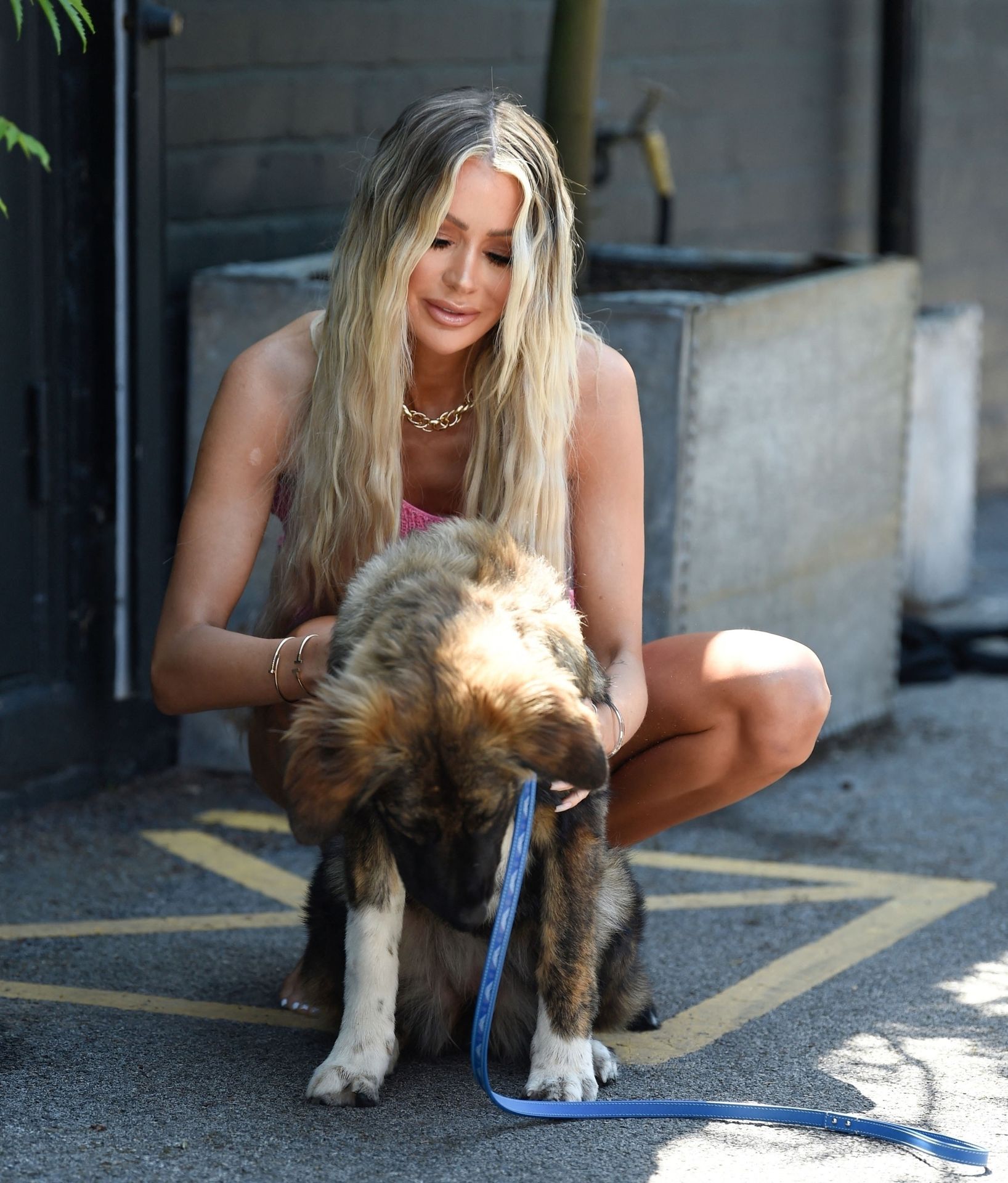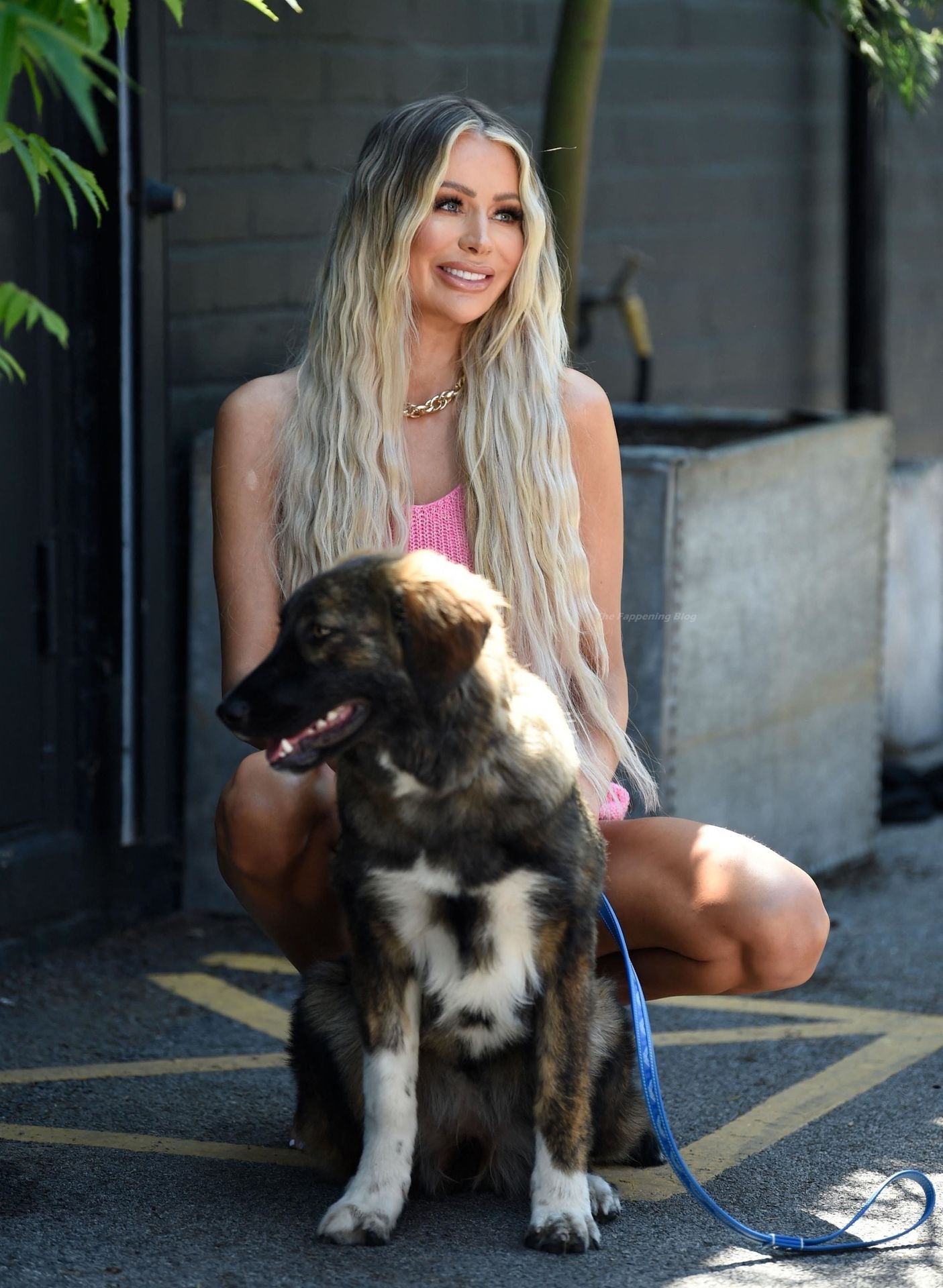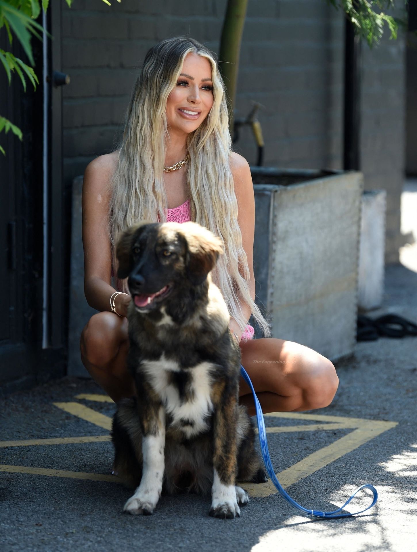 Olivia Attwood foi fotografada em um ensaio usando seu sexy conjunto rosa combinando de top e shorts. A estrela de Love Island foi vista com seu cachorro de estimação Lola, ambos posando para fotos em um dia quente em Manchester (junho de 2021).